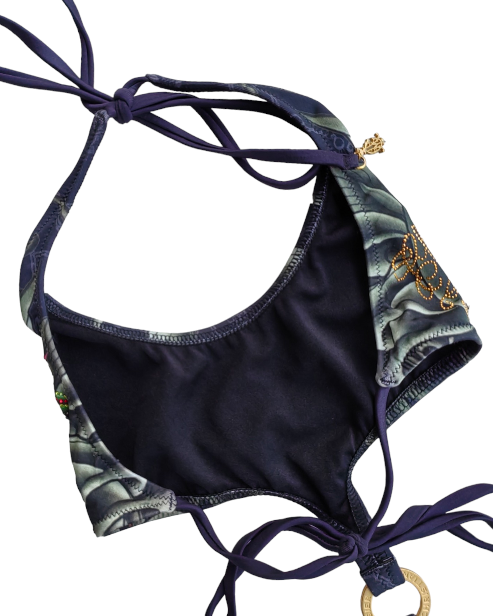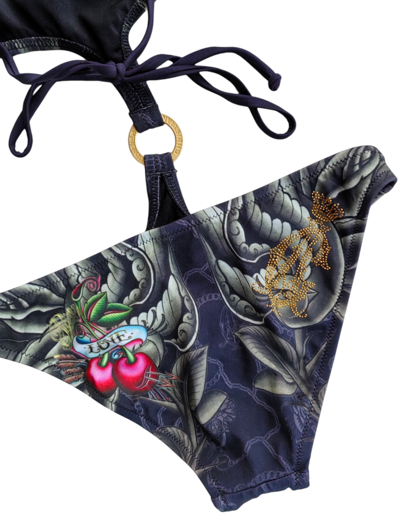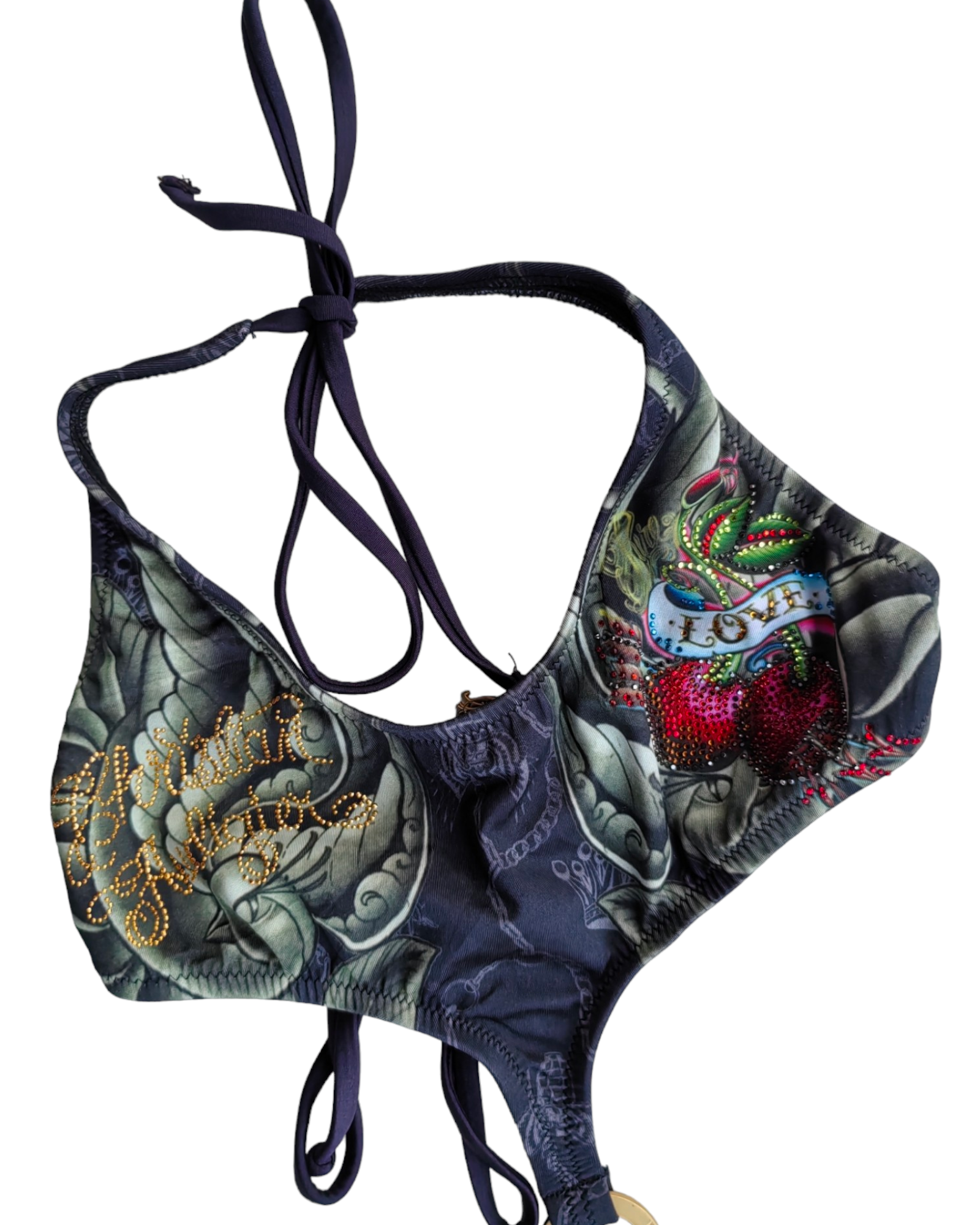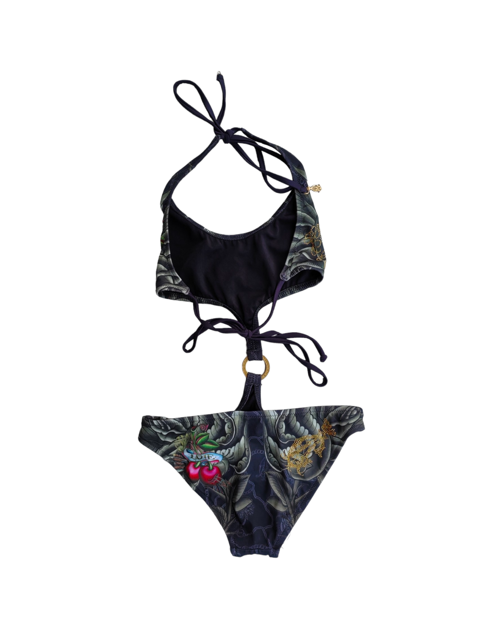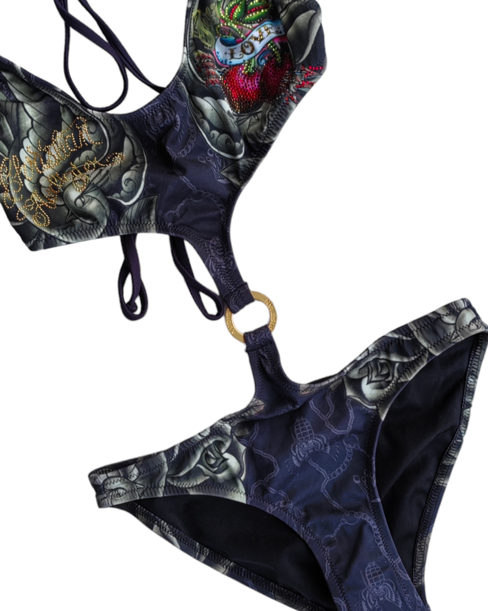 TRAJE DE BAÑO DE UNA PIEZA ASIMÉTRICO 80% POLY 20% SPANDEX, CIRCULO DORADO GRABADO CON EL NOMBRE DE LA MARCA QUE UNE LA PARTE DE ARRIBA CON LA PARTE DE ABAJO. CORDÓN PARA AJUSTAR EN CUELLO Y ESPALDA. ESTAMPADO DE ROSAS ESTILO TATUAJE CLÁSICO, PEDRERÍA EN EL PECHO Y LA PARTE INFERIOR TRASERA. SIN DETALLES DE USO.