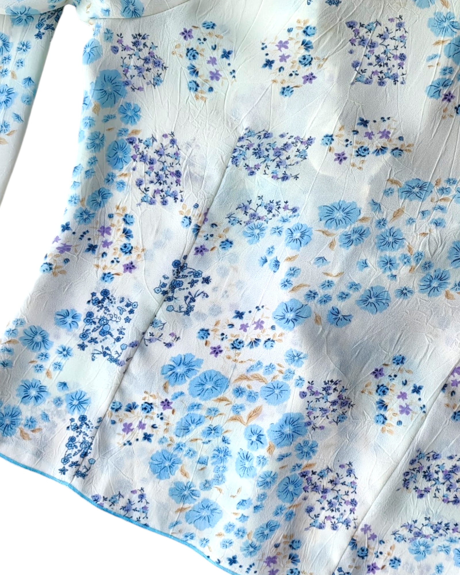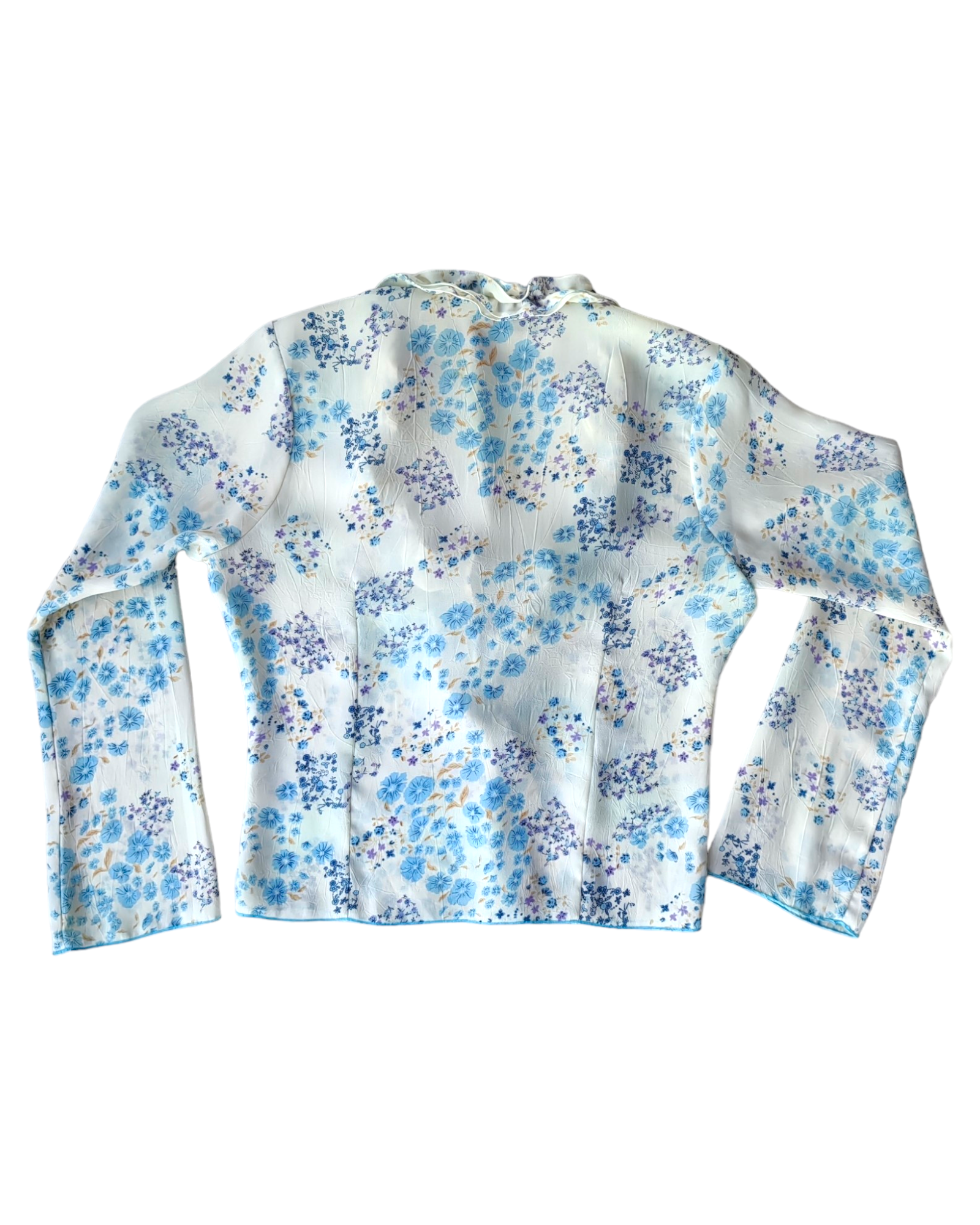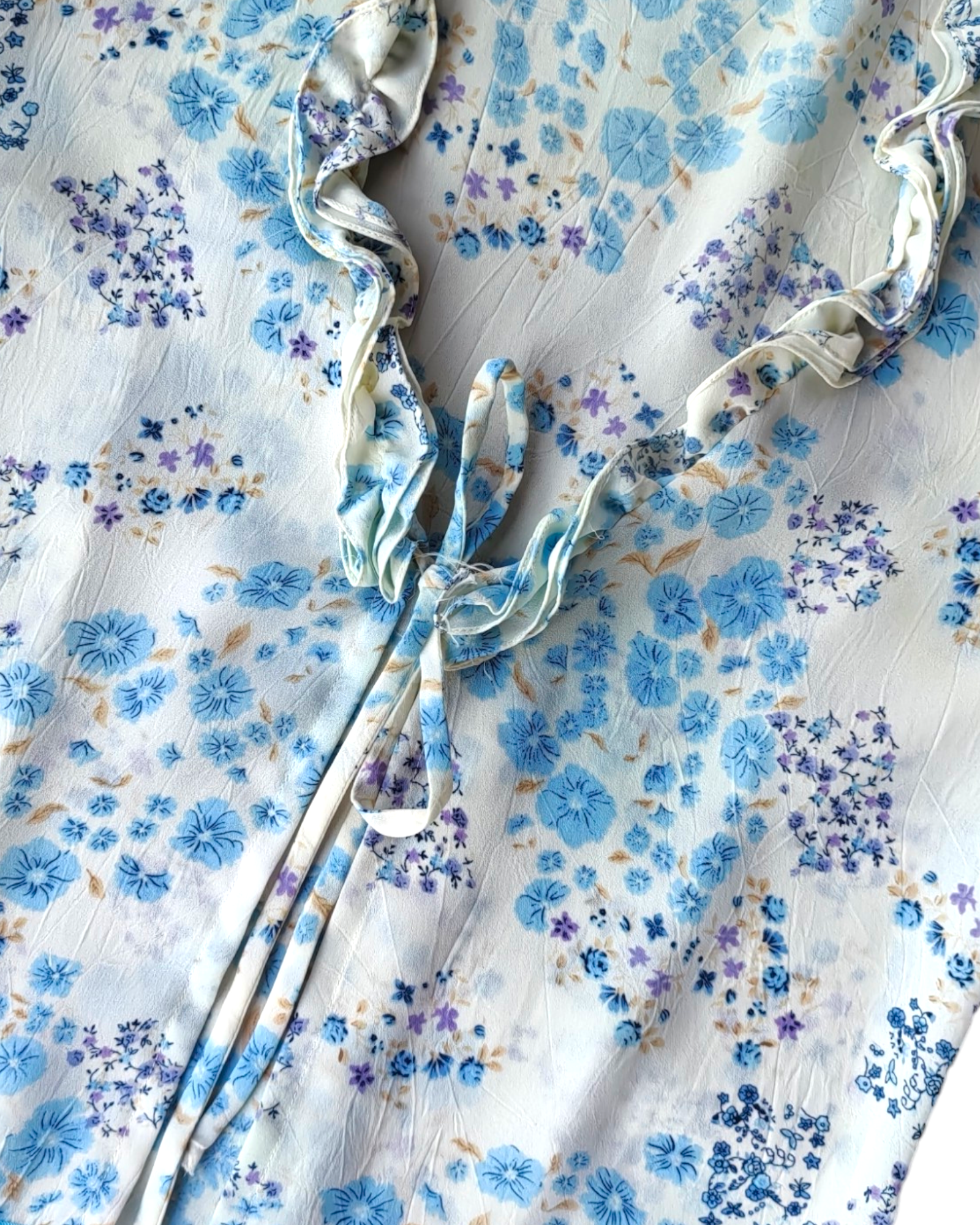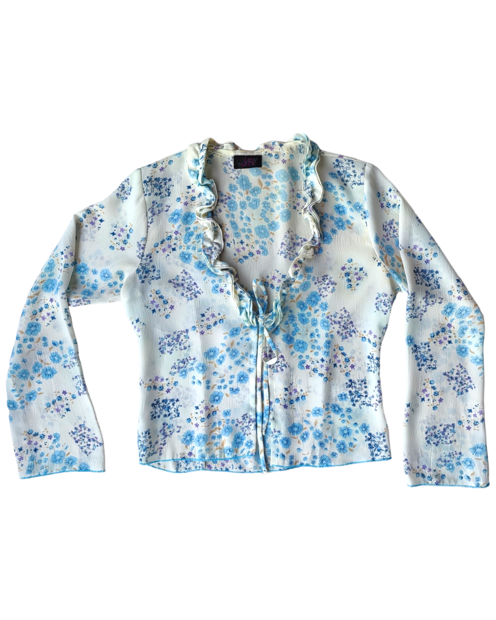 BLUSA MANGA LARGA CORTE TIPO CÁRDIGAN CON ESCOTE EN V PRONUNCIADO Y CORDONES FRONTALES PARA ANUDAR. HOLANES EN EL ESCOTE. ESTAPADO DE FLORES AZULES , MORADAS Y AMARILLAS. ALGUNOS HILOS SUELTOS EN EL ESCOTE Y EL CORDÓN.