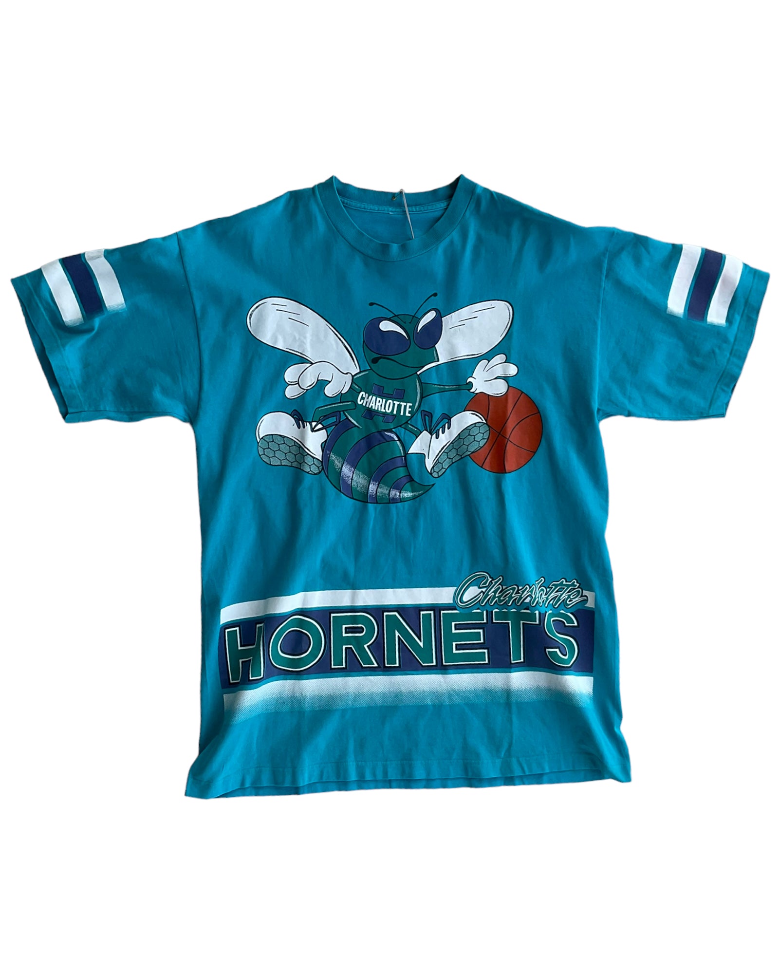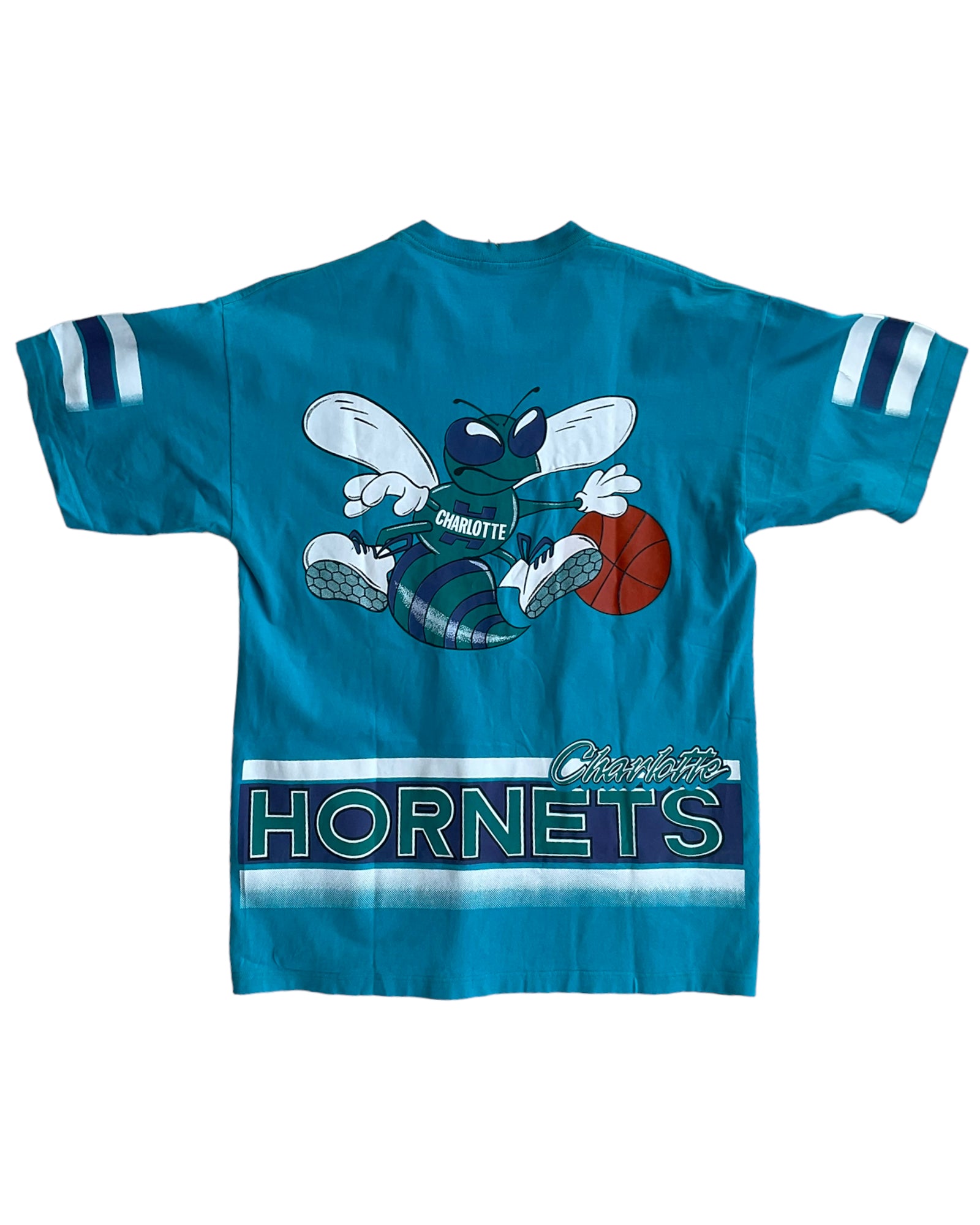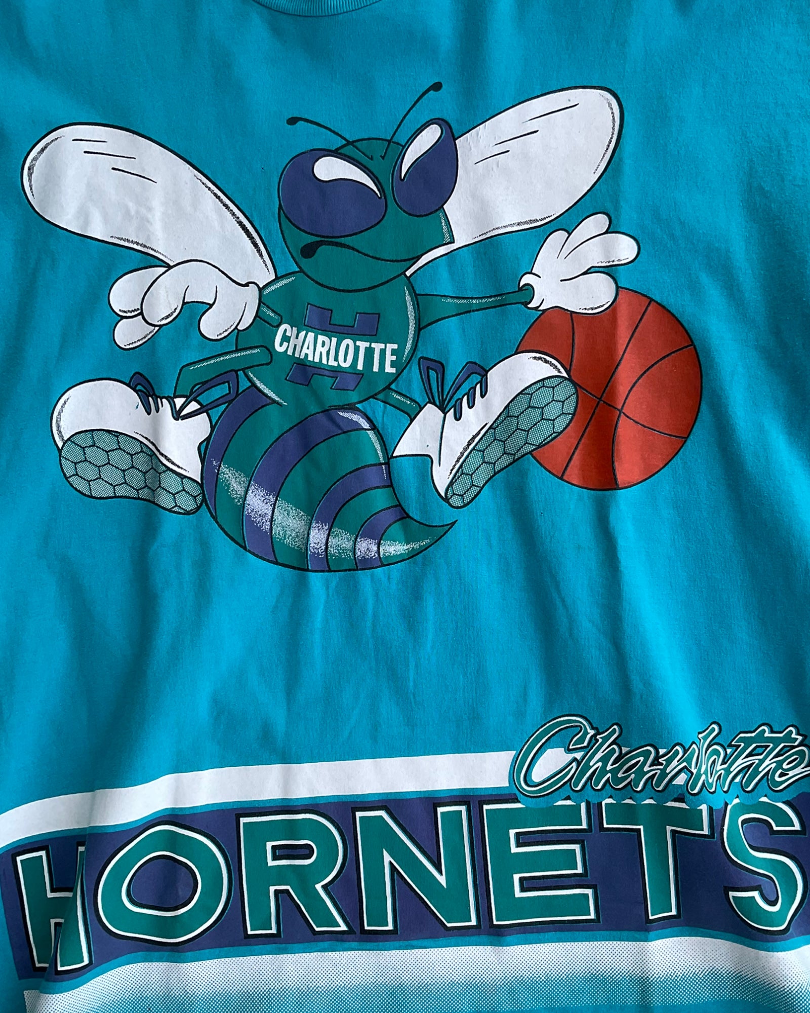 PLAYERA COLOR AZUL CLARO CON ESTAMPADO DE UNA AVISPA CON UNA PELOTA DE BASQUET "CHARLOTTE HORNETS" EN LA PARTE INFERIOR. SIN DETALLES DE USO.