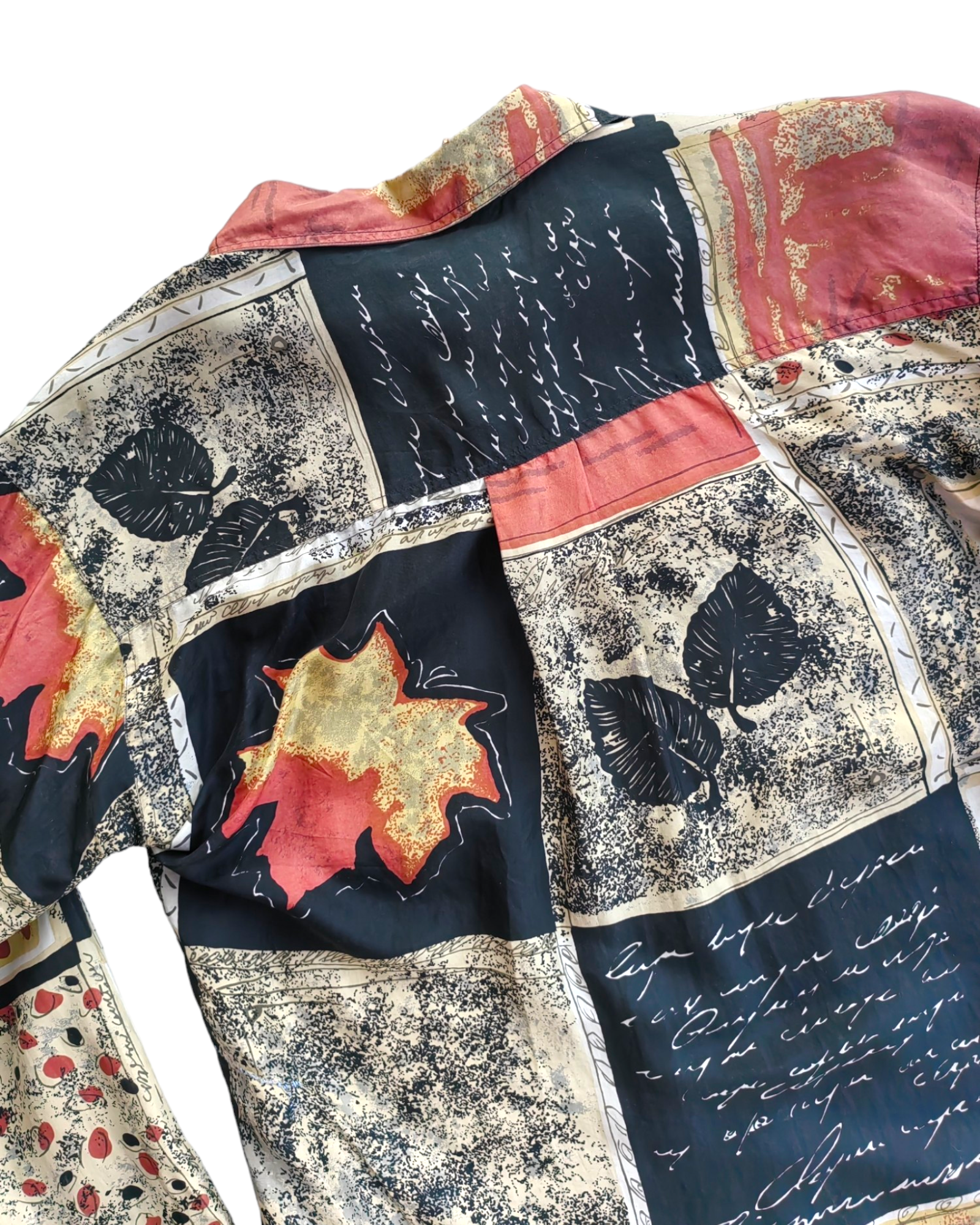 CAMISA DE BOTONES 100% SEDA CON PRINT OTOÑAL EN PANELES DE CUADROS. MANGA LARGA. SIN DETALLES DE USO.