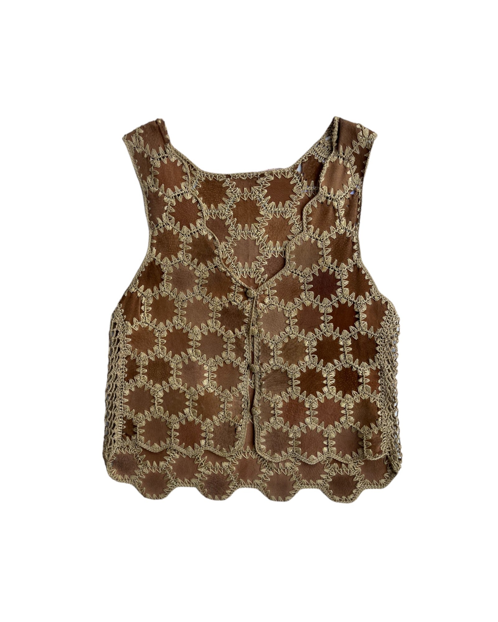 CHALECO DE PIEL CAFE BORDADO CON CROCHET EN FORMA DE PANELES. PIEL GENUINA. PIEL ROTA EN ALGUNOS HEXÁGONOS EN EL HOMBRO Y LA PARTE INFERIOR.
