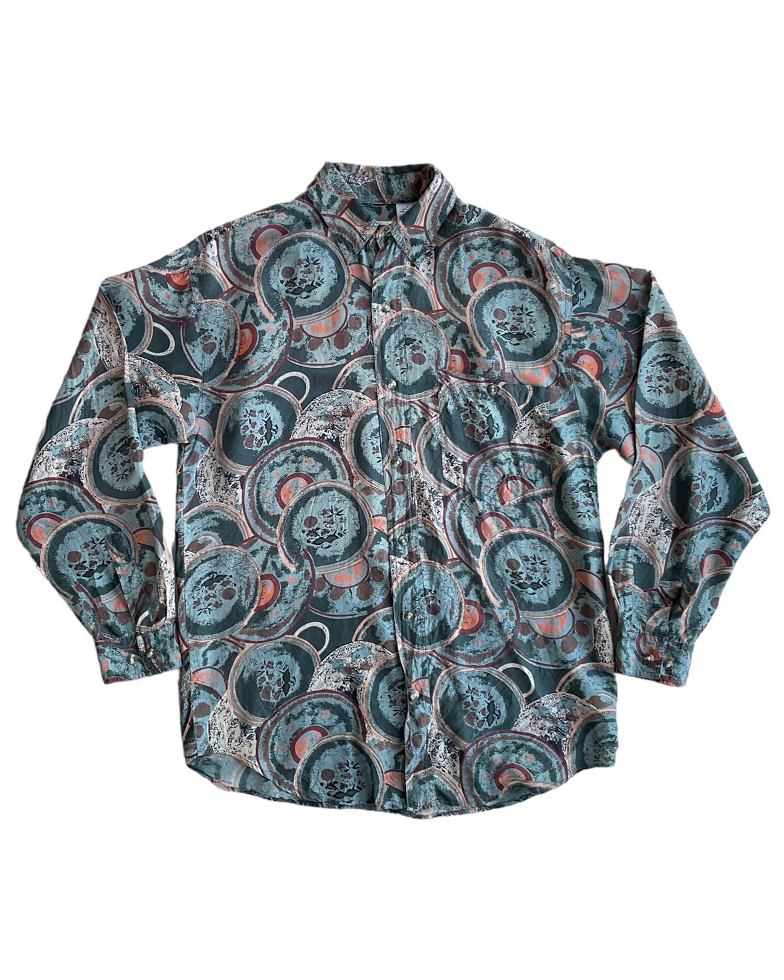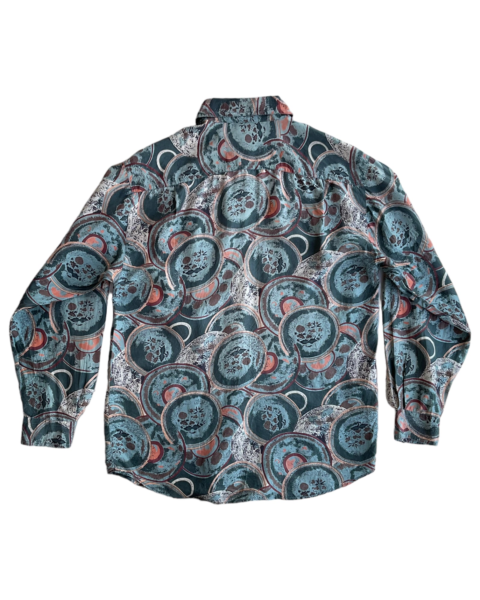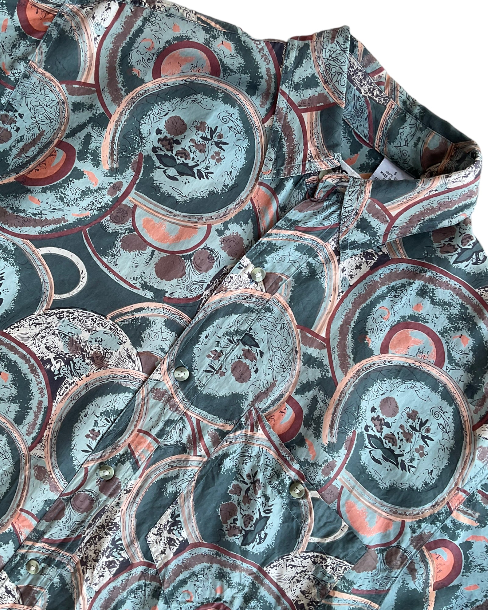 CAMISA DE BOTONES MANGA LARGA 100% SEDA, CON PATRÓN DE COLORES VERDE, AZUL, ROSA Y CAFÉ. SIN DETALLES DE USO.