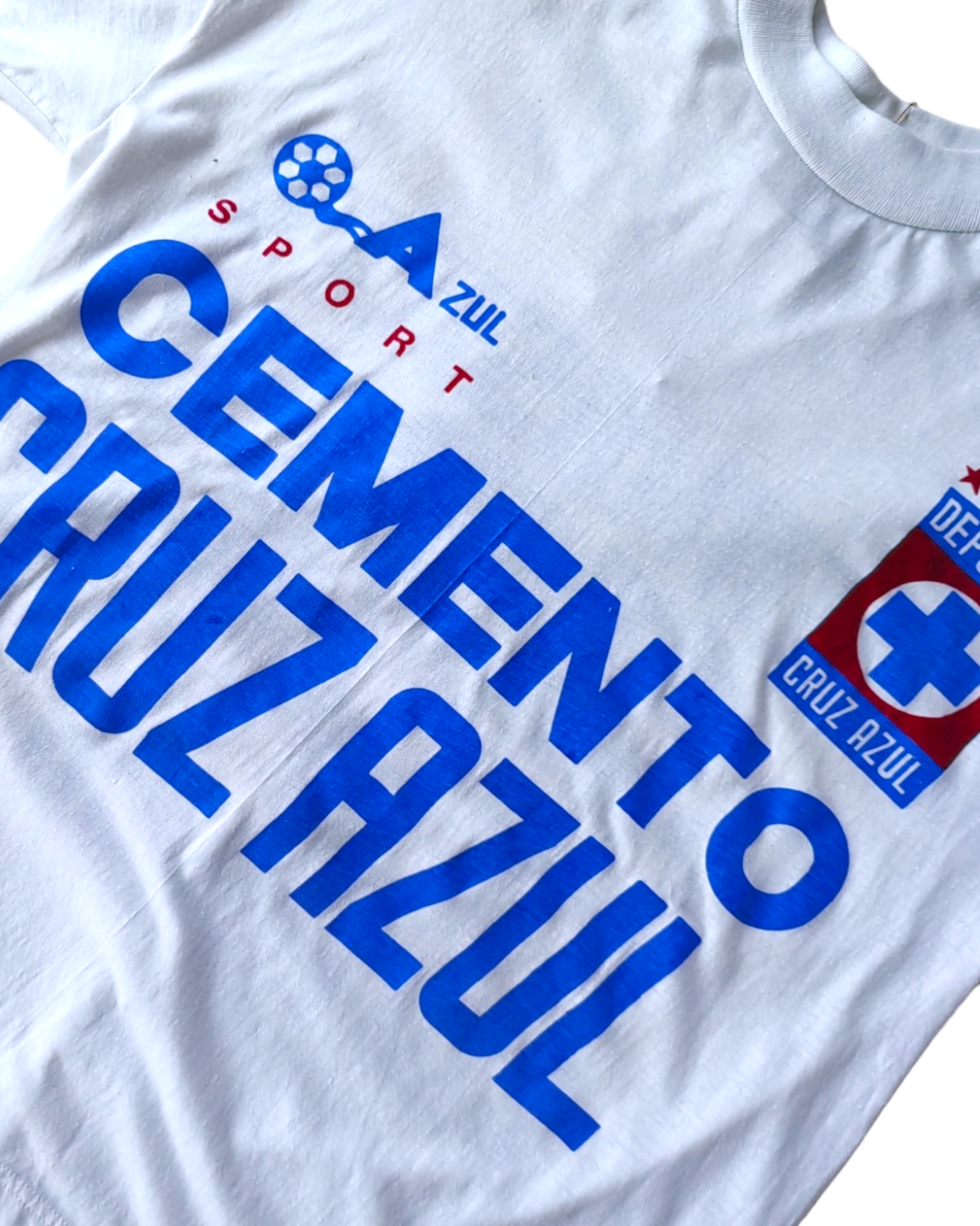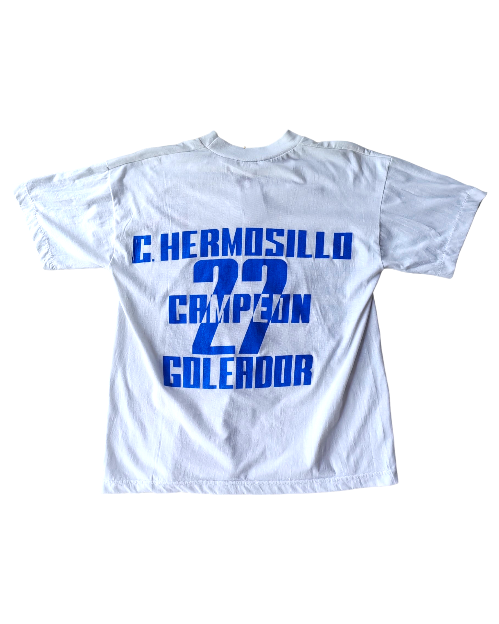 PLAYERA COLOR BLANCO CON ESTAMPADO FRONTAL DE "CEMENTO CRUZ AZUL SPORT! Y EL LOGO DEL EQUIPO QUE USARON DE 1980 - 1995 EN EL PECHO, ESTAMPADO EN LA ESPALDA "C. HERMOSILLO 27 CAMPEÓN GOLEADOR" EN COLOR AZUL. PLAYERA SINGLE STITCH. SIN DETALLES DE USO.