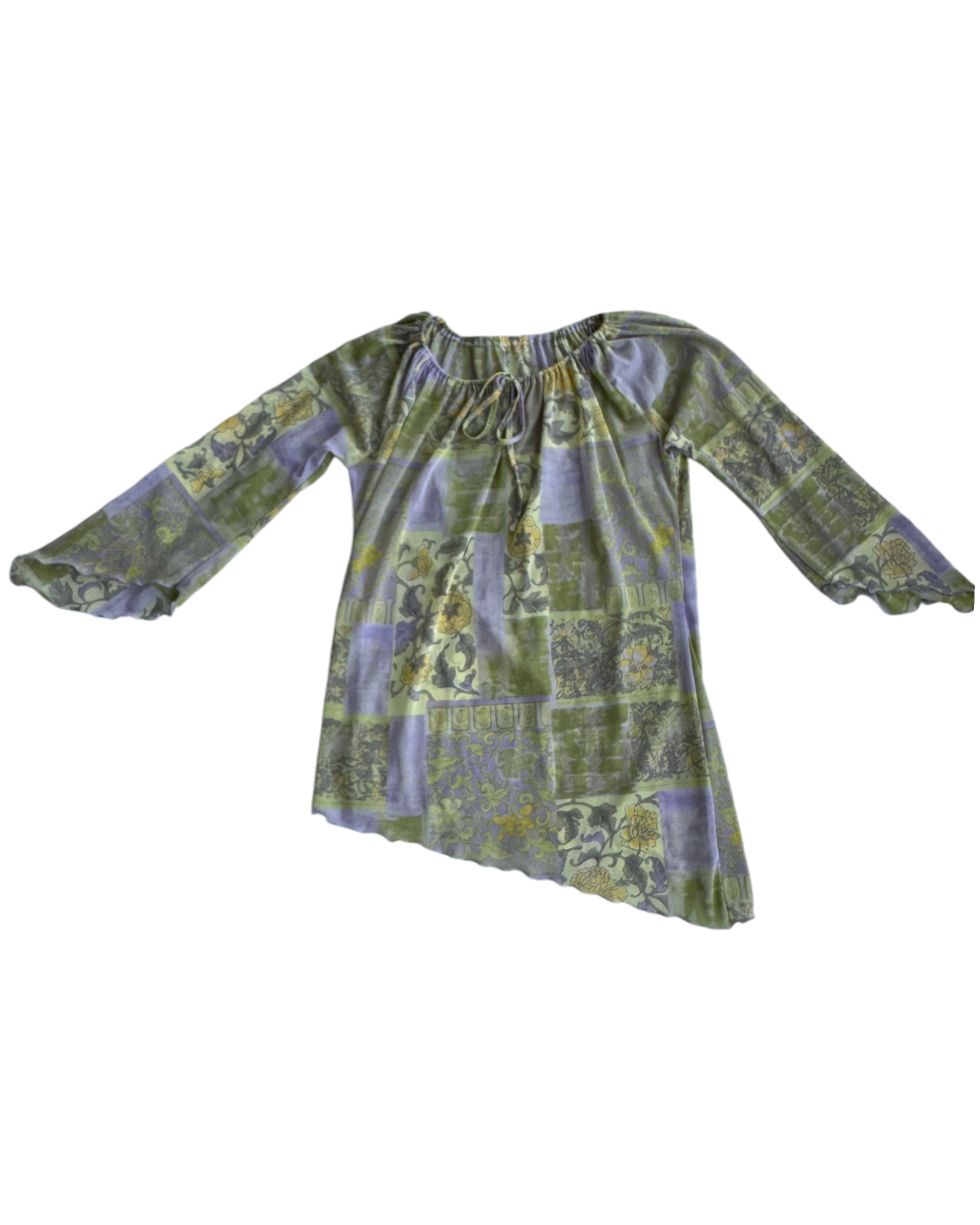 BLUSA DE MANGAS ASIMÉTRICAS 3/4 CON DOBLADILLO DE LECHUGA Y CORTE ASIMÉTRICO. MATERIAL DE MAYA CON TRANSPARENCIA COLORES VERDE, MORADO Y AMARILLO. CORDÓN PARA AJUSTAR EN EL CUELLO. SIN DETALLES DE USO.