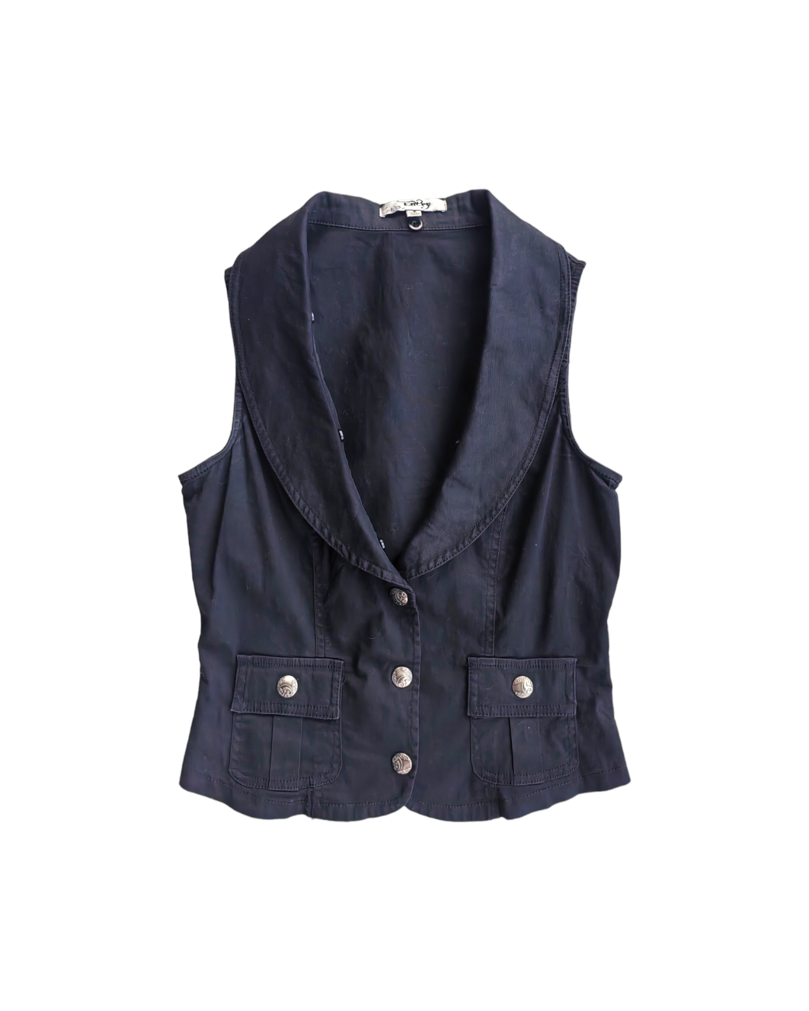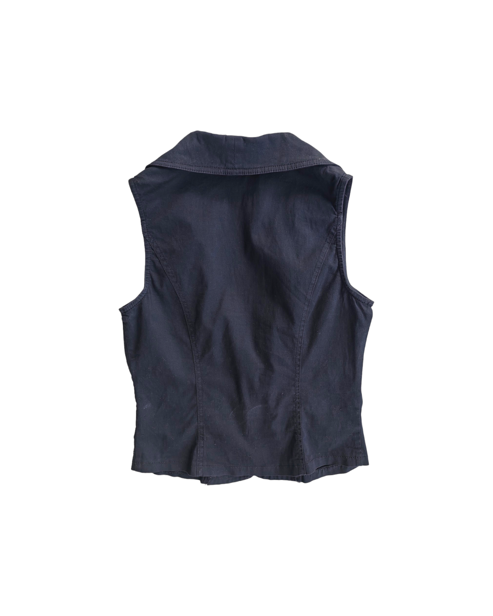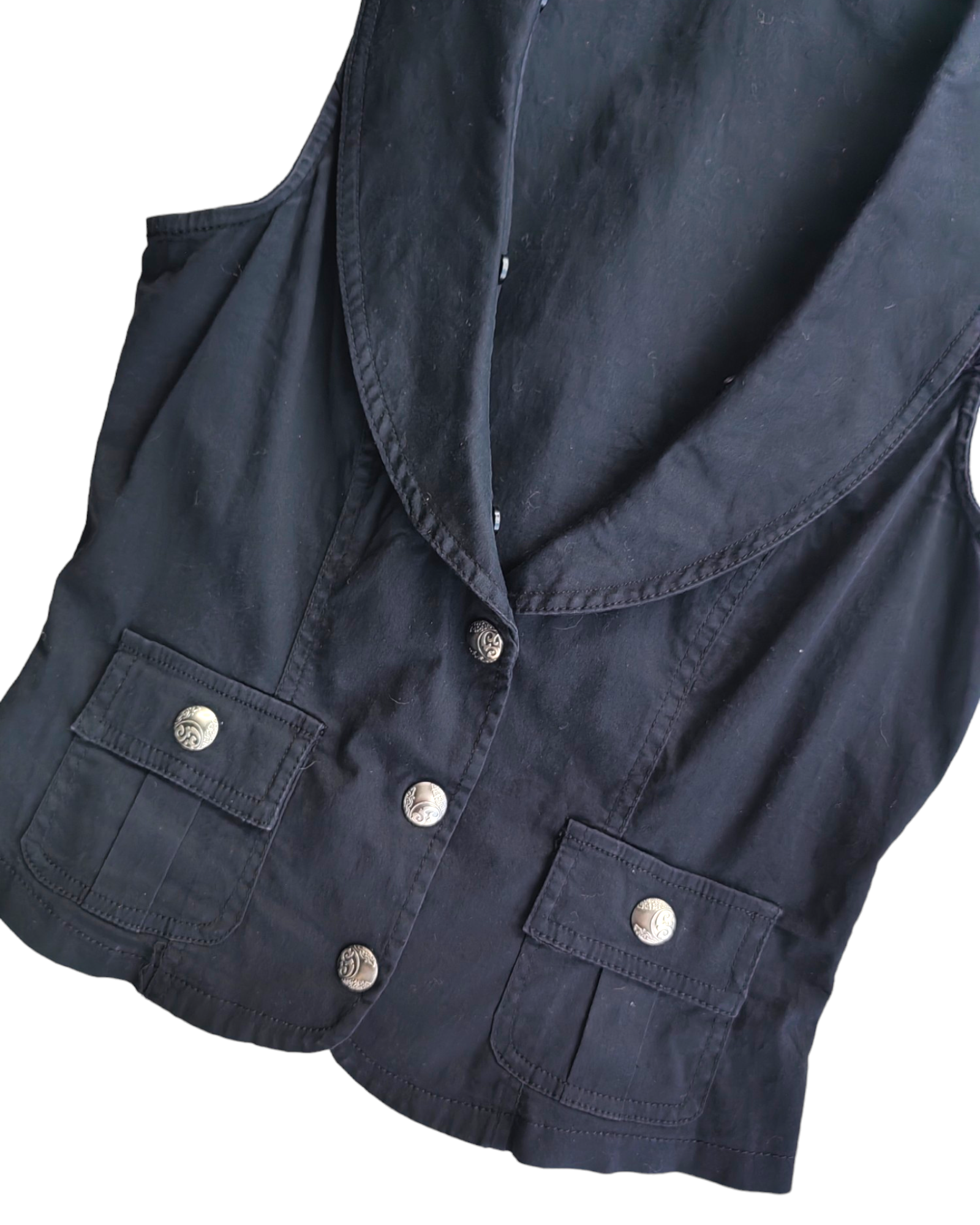 CHALECO DE MEZCLILLA NEGRO CON DETALLE DE BOLSILLOS NEGROS DELANTEROS. BOTONES PLATEADOS CON DETALLE DE PRINT ASIATICO. NO TIENE DETALLES DE USO.