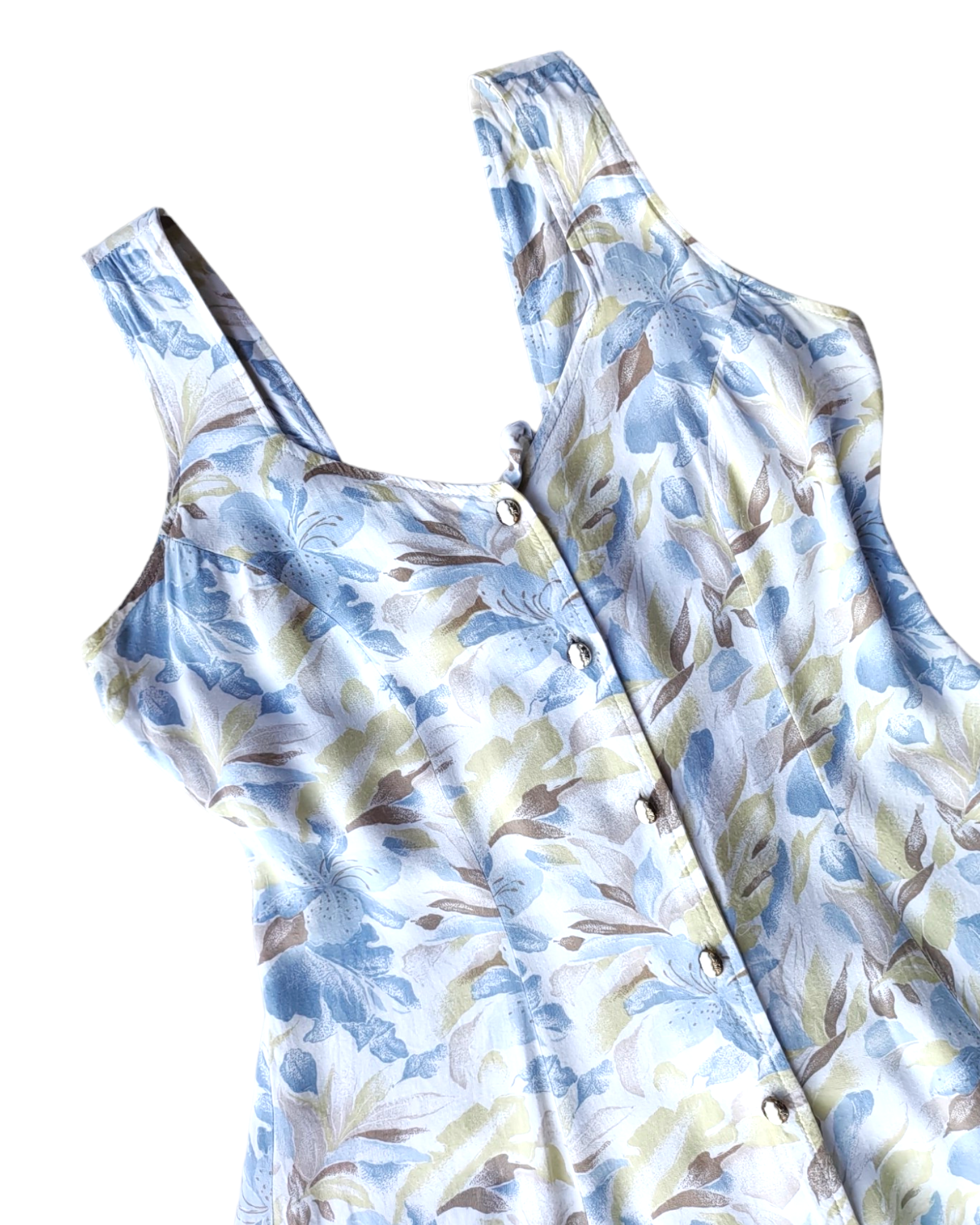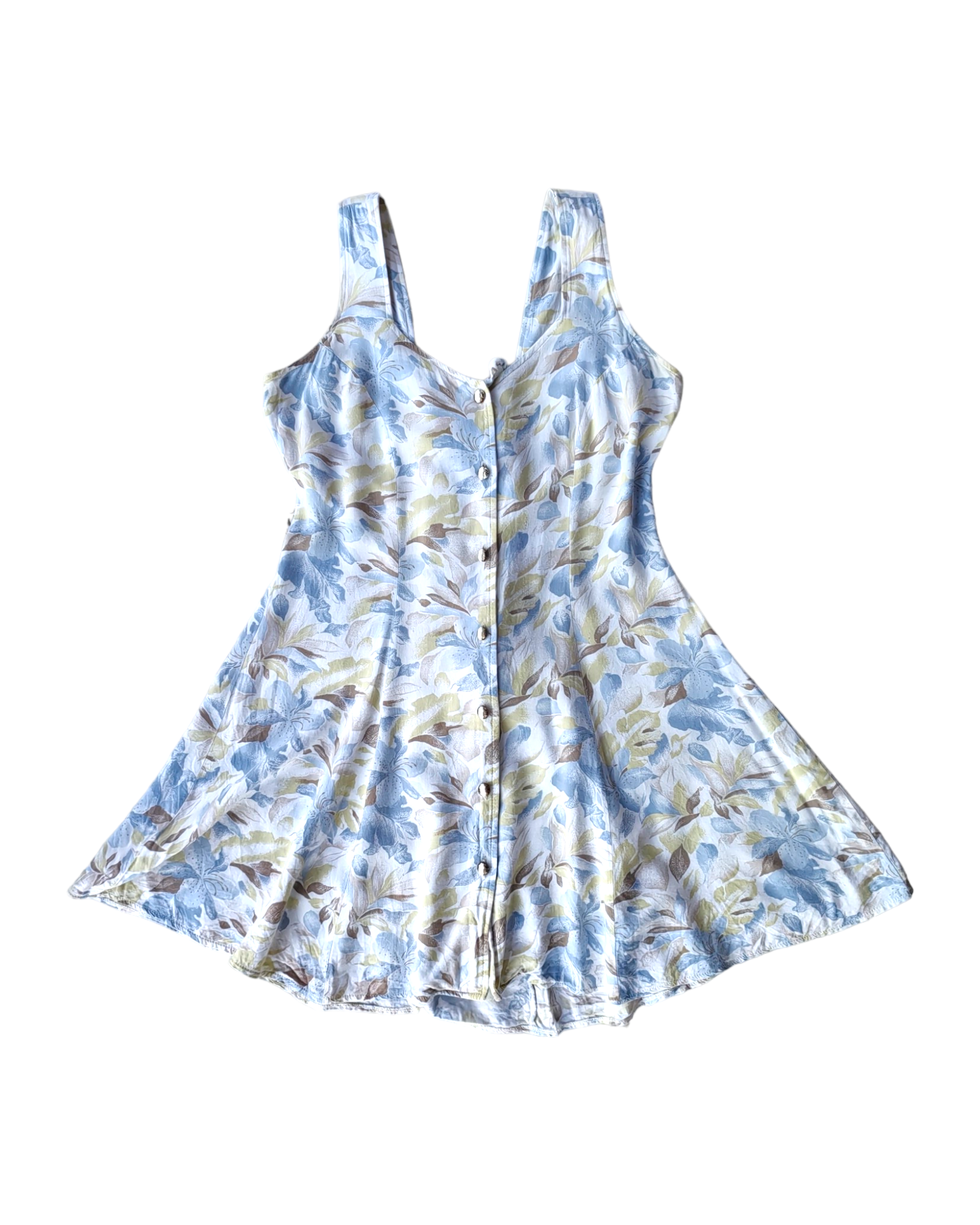 VESTIDO 100% RAYON DE COLOR BLANCO CON PATRÓN DE FLORES EN COLORES VERDE MANZANA, CAFÉ CLARO Y AZUL CIELO. BOTONES CENTRALES CON DETALLES ORNAMENTALES DE METAL EN DORADO. ESPALDA AJUSTABLE CON CORDONES TIPO CORSET. LIGERO DESGASTE EN EL CORDÓN TRASERO E HILO JALADO EN LA ESPALDA.