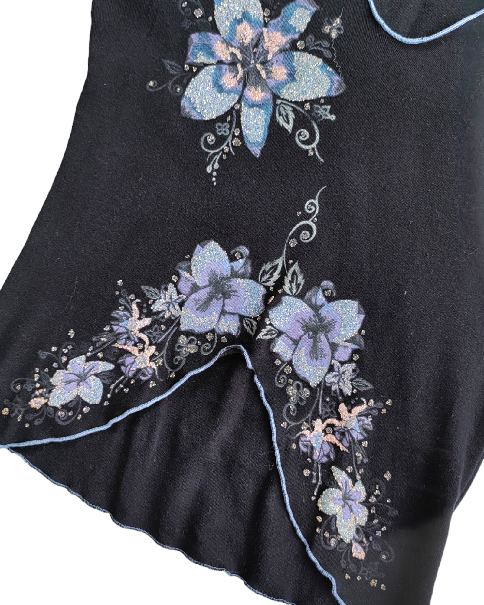 BLUSA 100% ALGODÓN MANGA CORTA DE COLOR NEGRO, DOBLADILLO DE LECHUGA DE COLOR AZUL CLARO, ESTAMPADO DE FLORES AZULES CON DETALLES EN BRILLANTINA PLATEADA. CUELLO V. SIN DETALLES DE USO