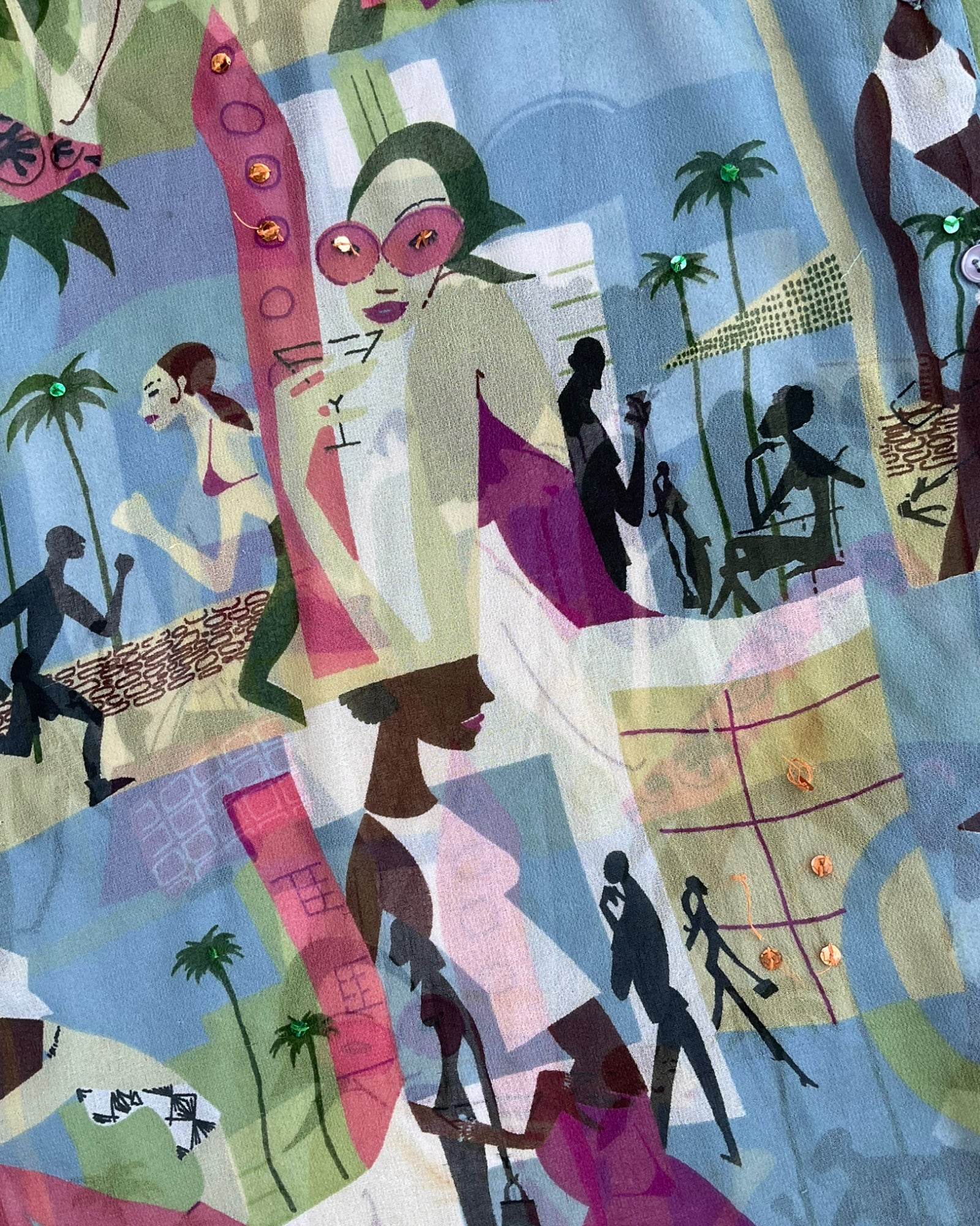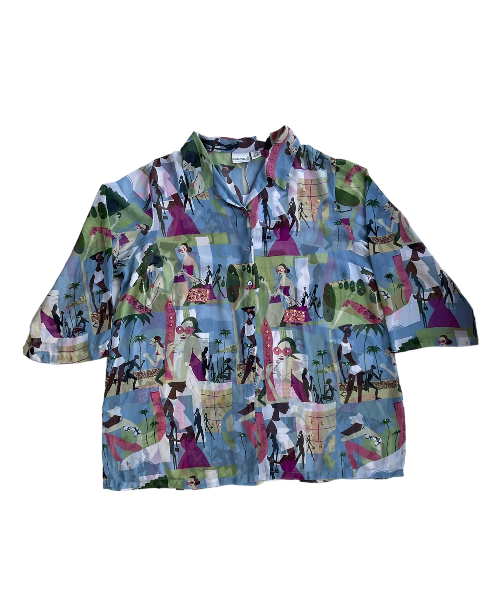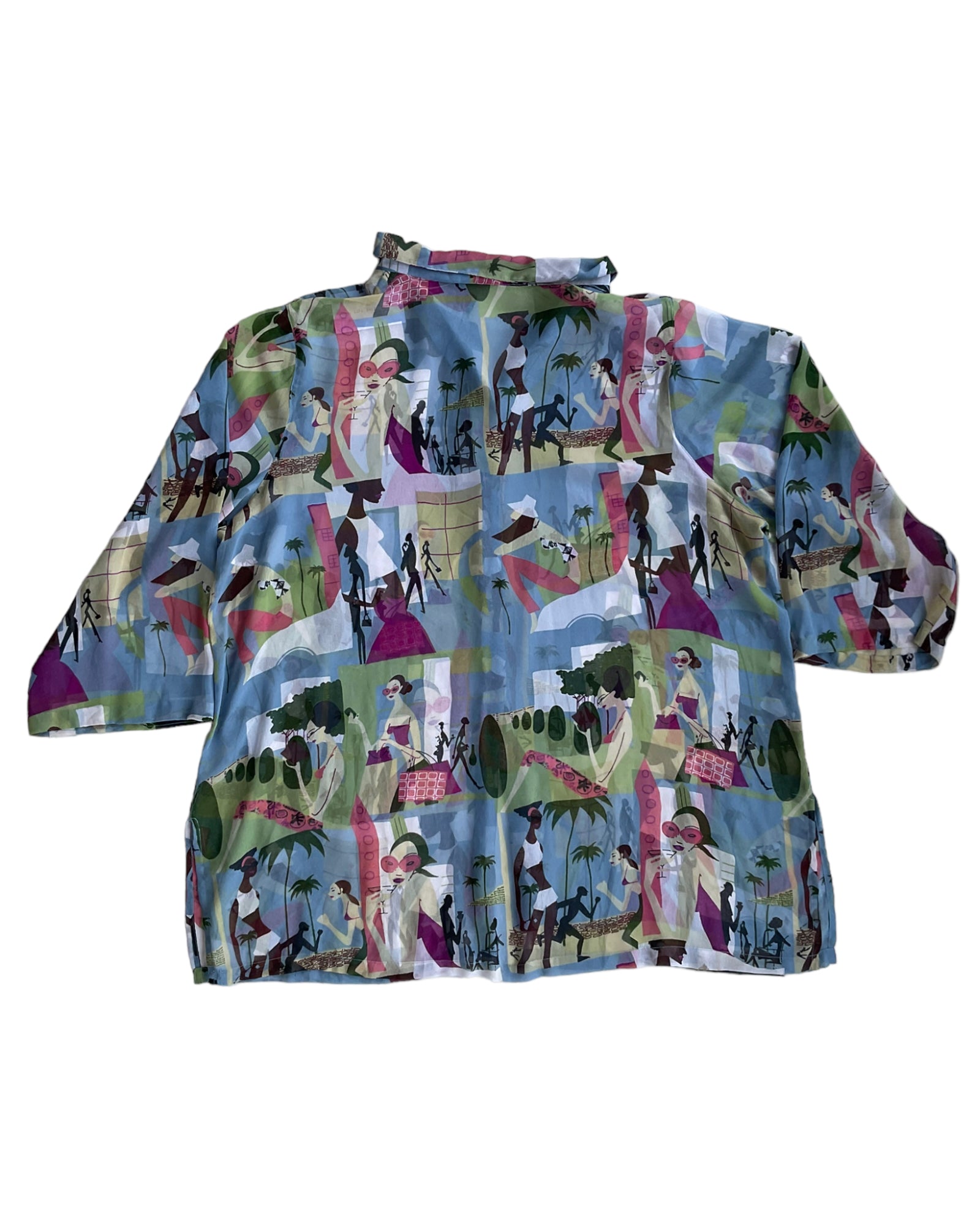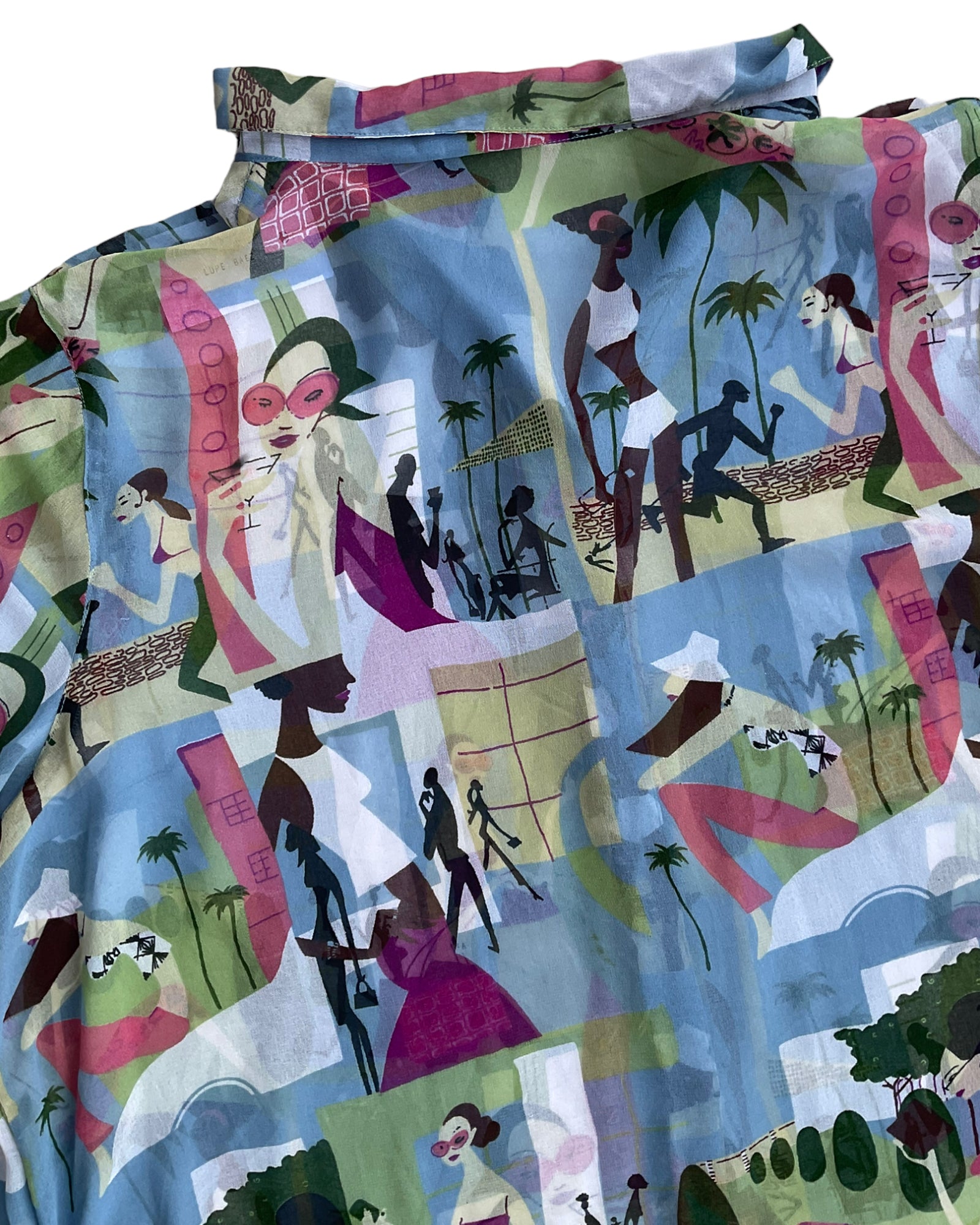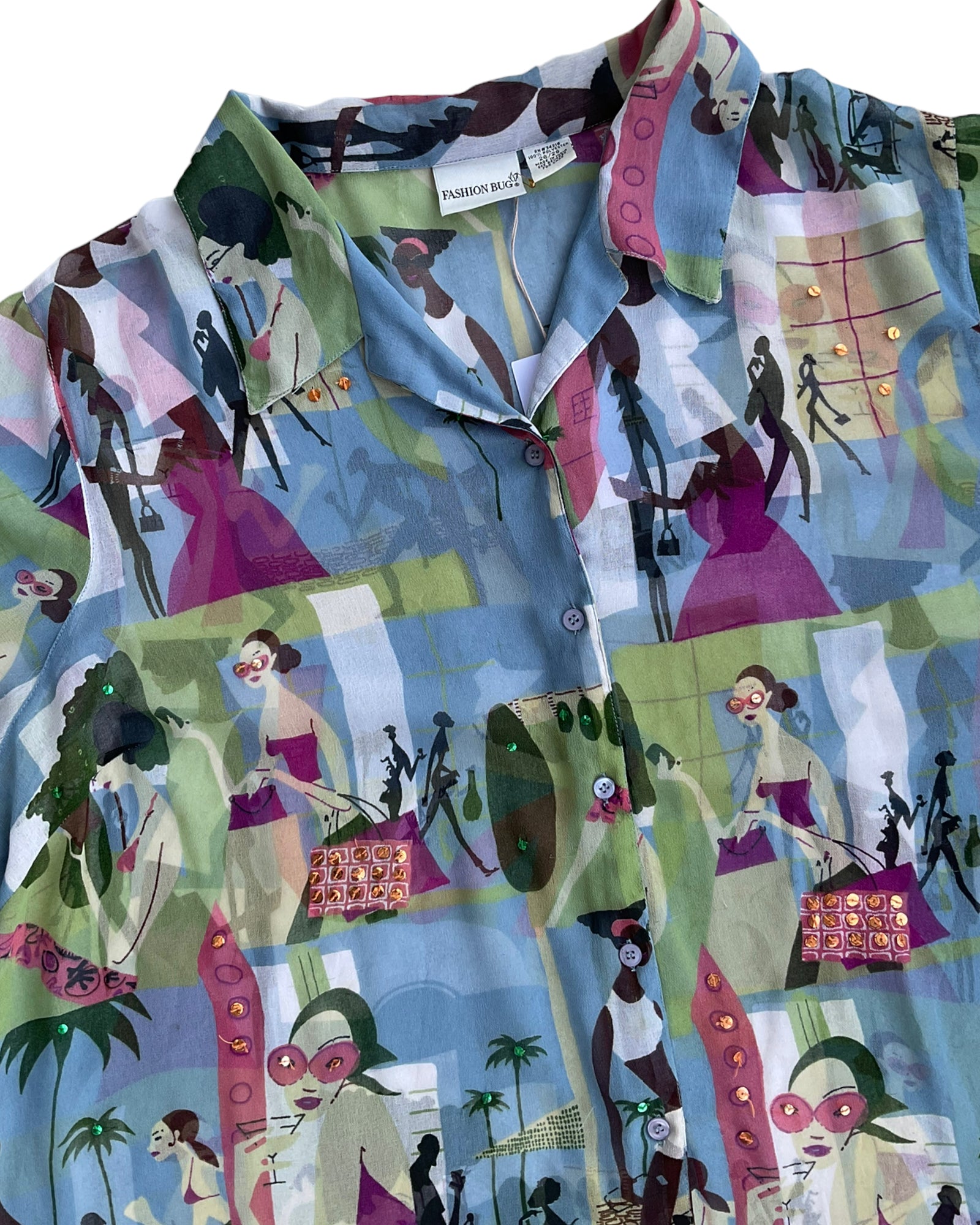 BLUSA DE BOTONES MANGA LARGA 100% POLIÉSTER TELA DE GASA TRANSPARENTE EN COLOR AZUL CON ESTAMPADO DE MUJERES HACIENDO COMPRAS EN COLORES ROSA, NEGRO, VERDE, BLANCO Y AMARILLO, DETALLES DE LENTEJUELAS. SIN DETALLES DE USO.