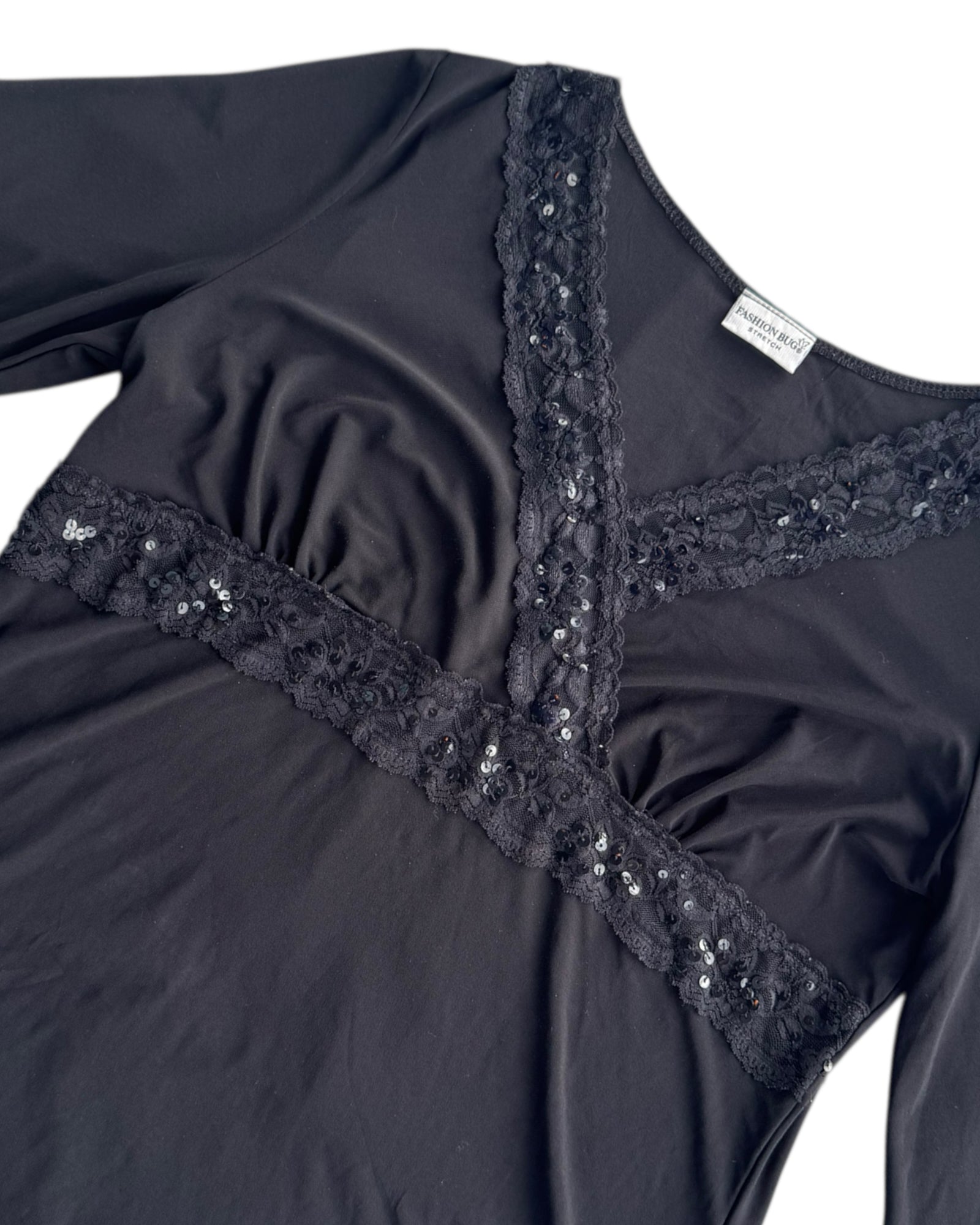 BB, ESTE PARA UNA DATE: TOP FASHION BUG COLOR NEGRO, CUELLO EN V DETALLES DECORATIVOS DE LENTEJUELAS BORDADOS SOBRE ENCAJE AL REDEDOR DEL CUELLO. TELA POLIESTER. ESTIRA :) ES STRETCH