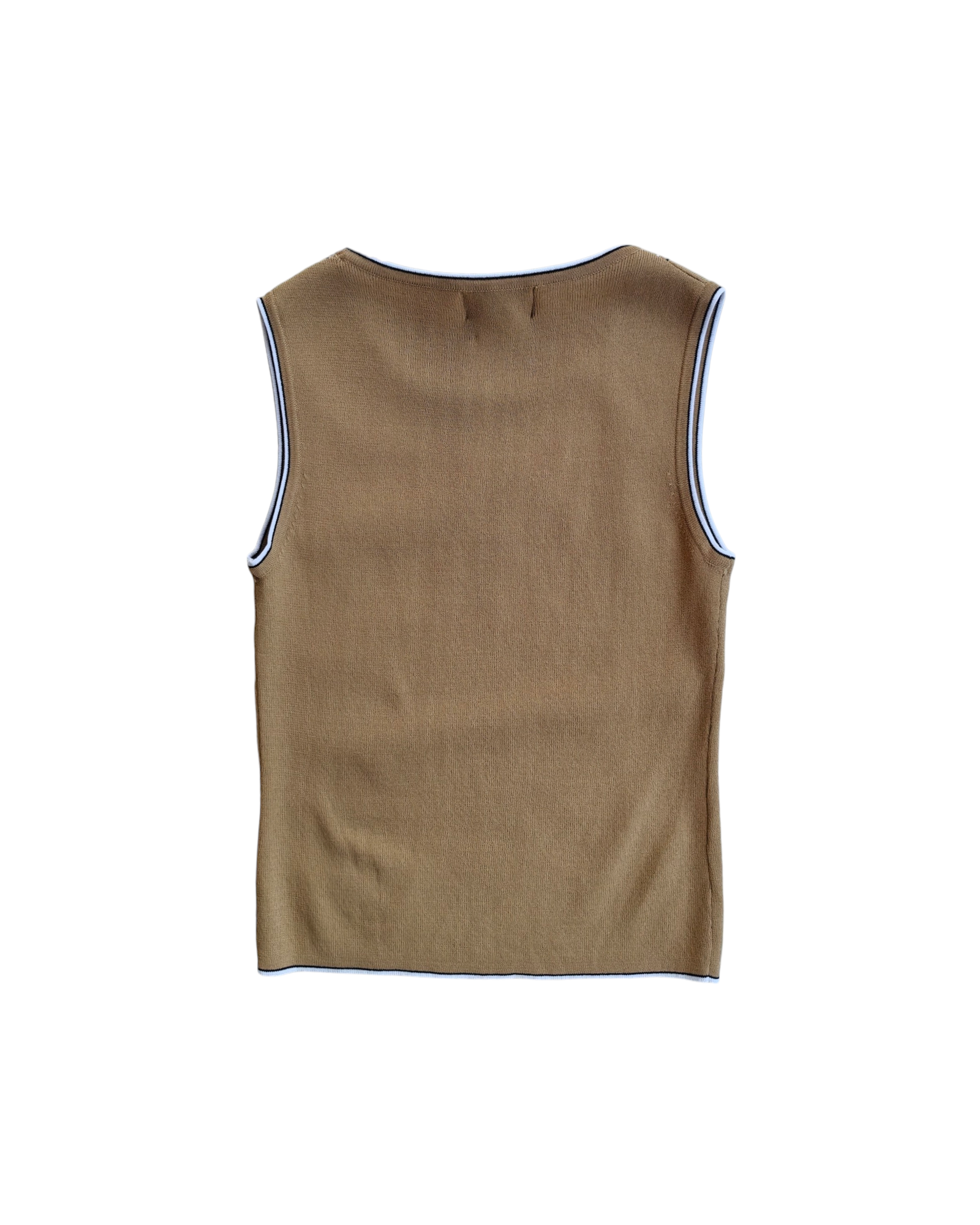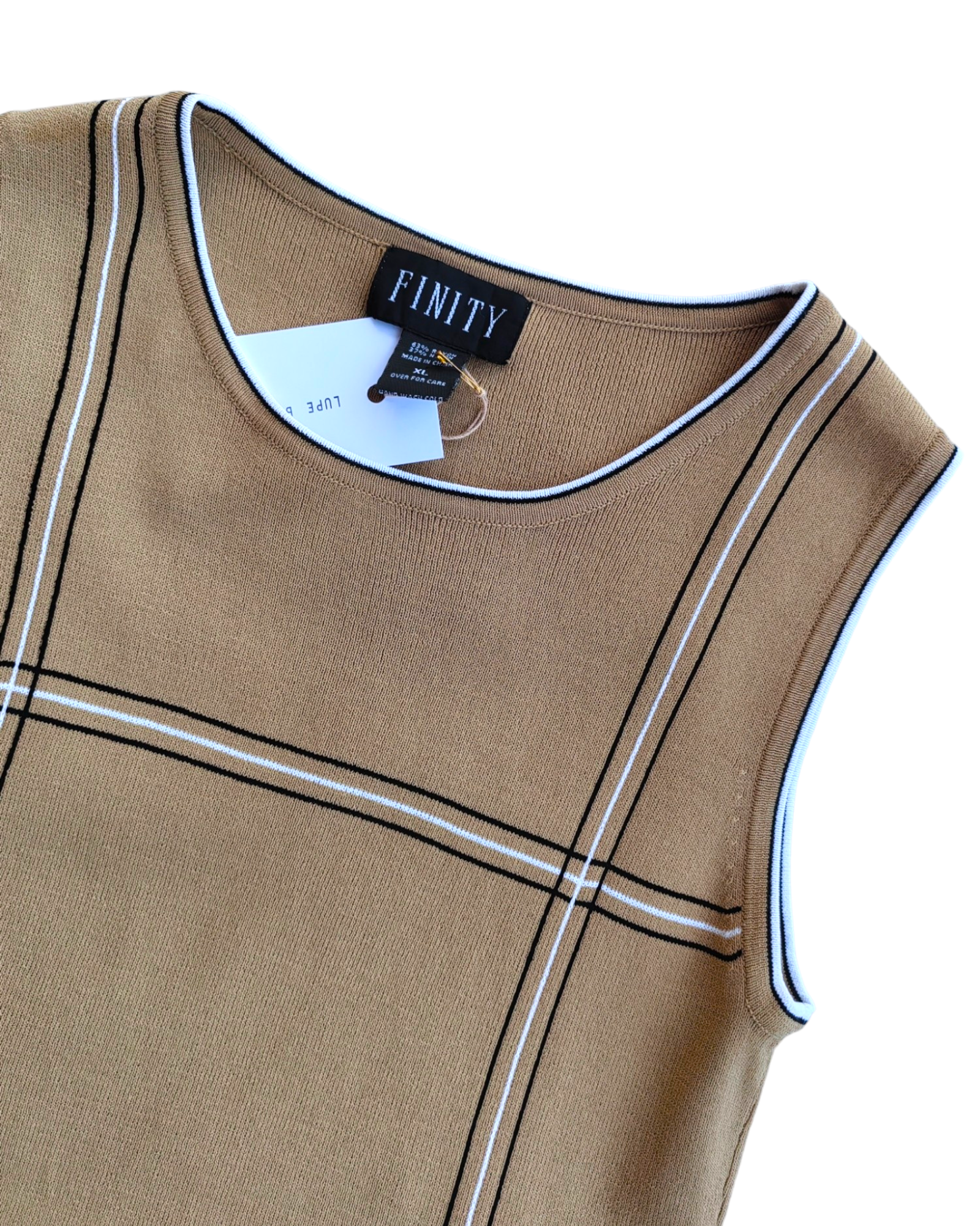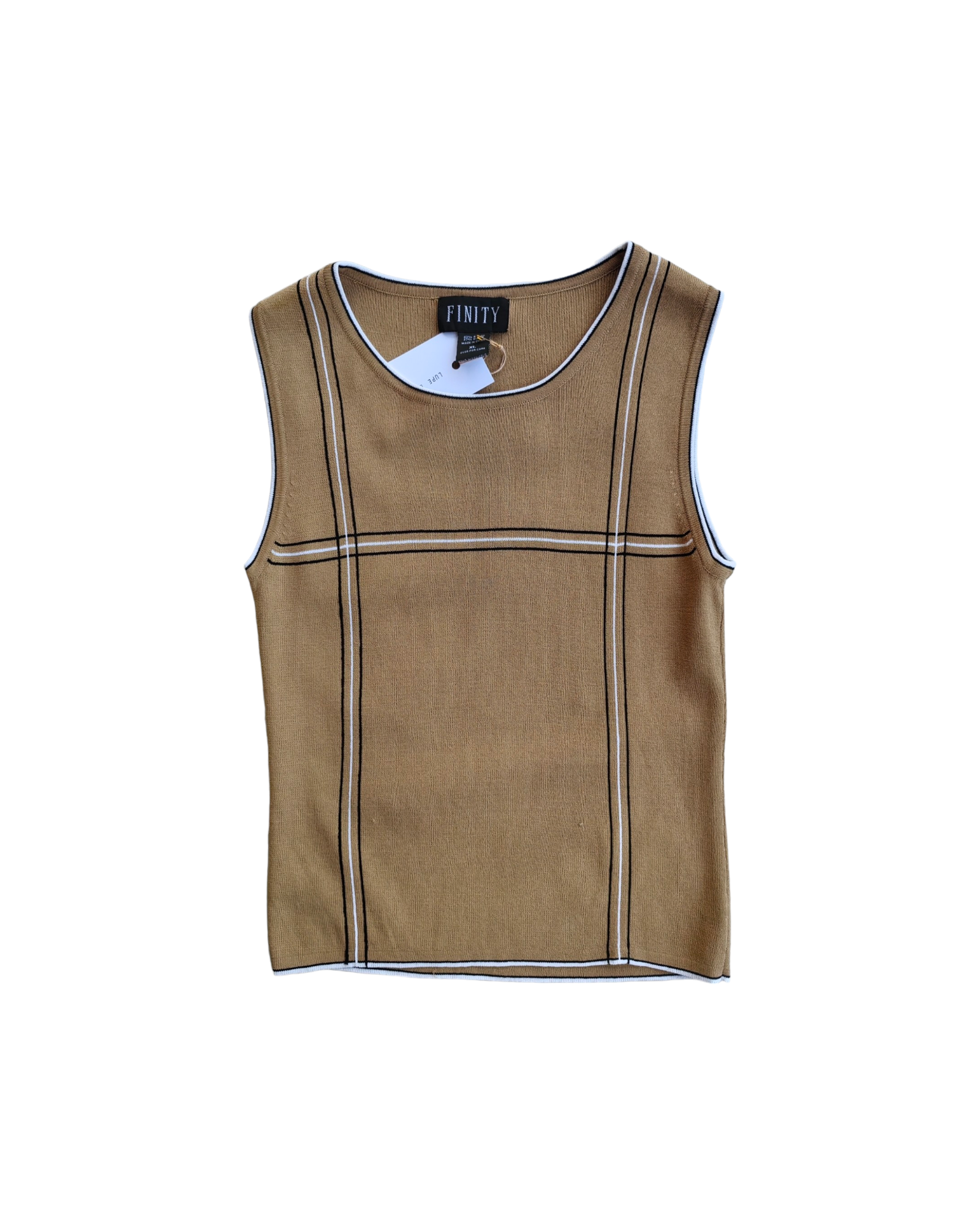 BLUSA 63% RAYÓN 37% NAILON, COLOR BEIGE CON RAYAS VERTICALES Y HORIZONTALES COLOR NEGRO Y BLANCO. SIN DETALLES DE USO.