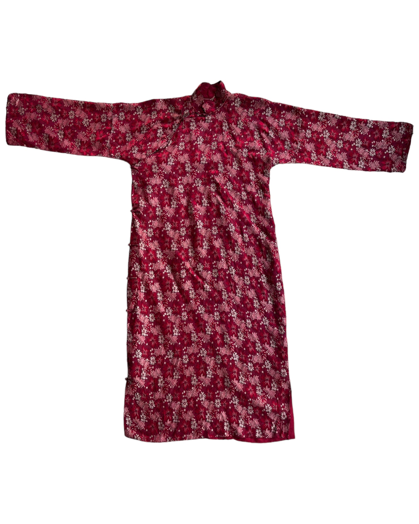 QIPAO JAPONÉS HECHO DE SEDA, FLORES ROJAS Y BLANCA BORDASAS SOBRE LA TELA POR TODO.