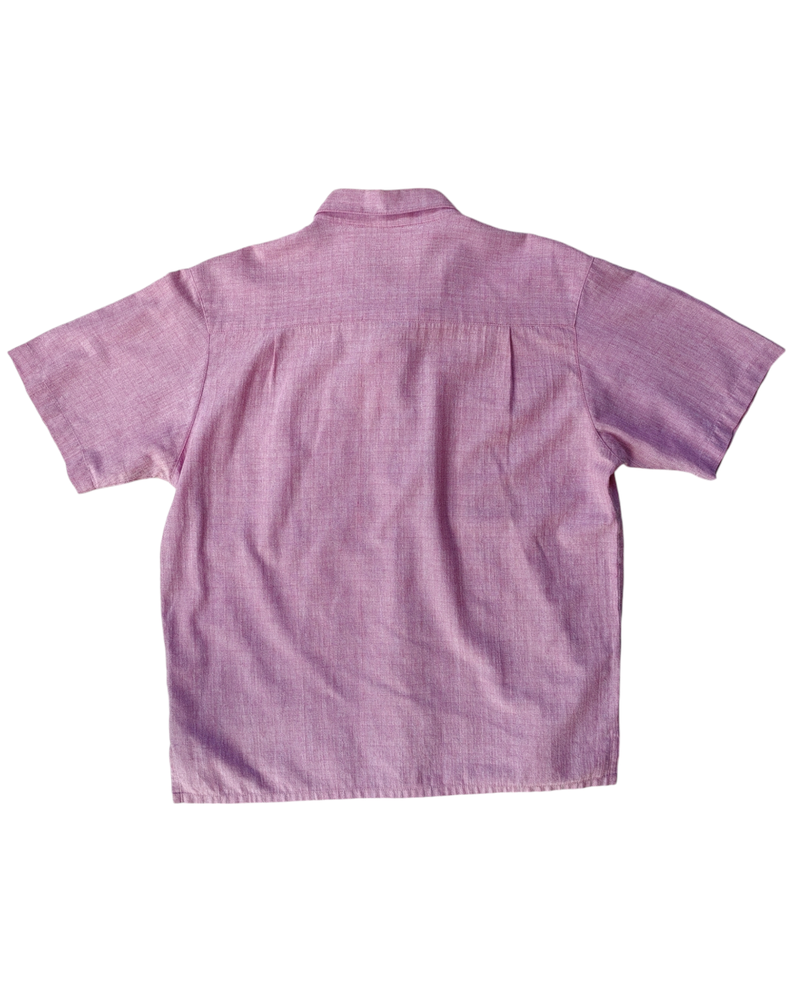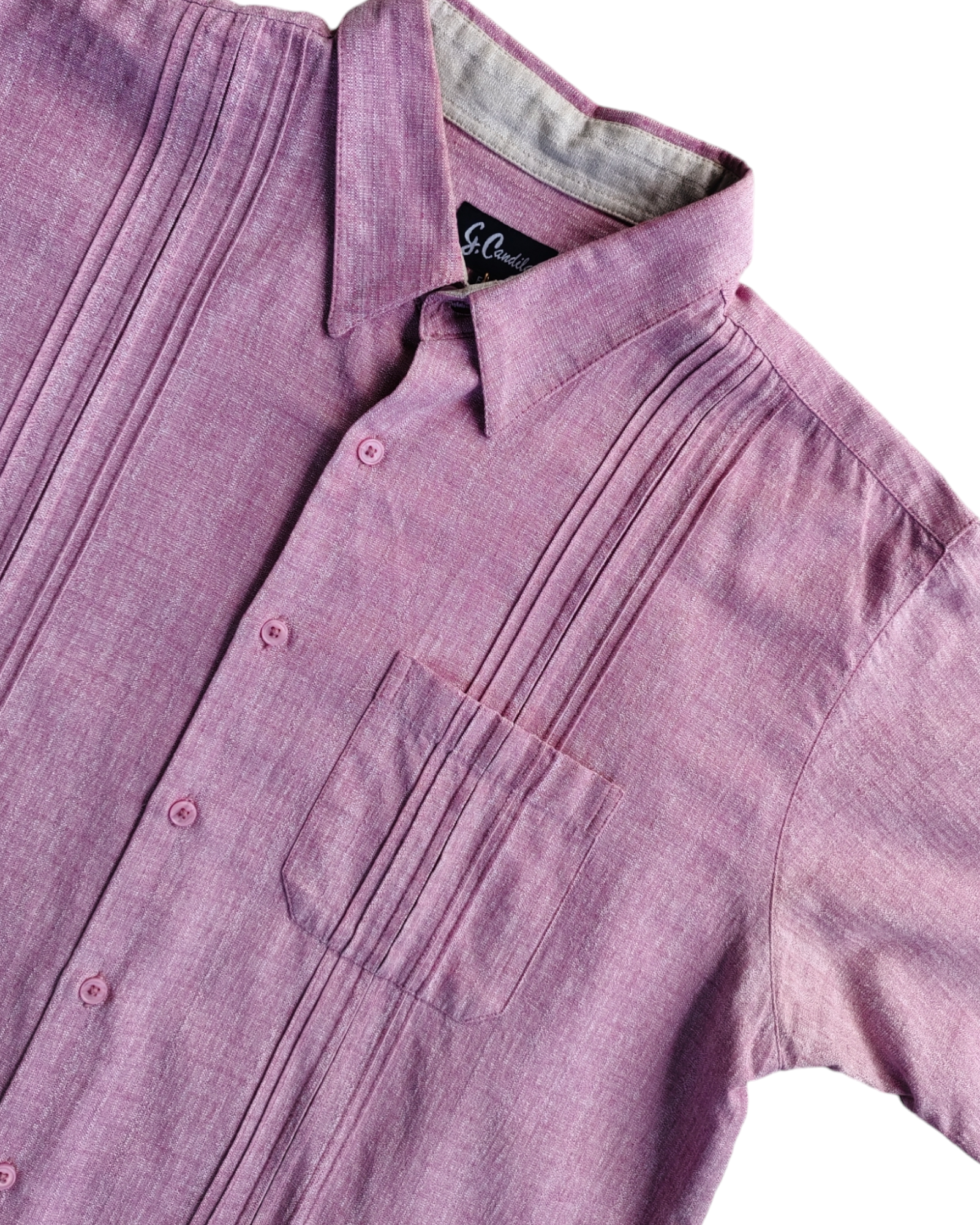 CAMISA COLOR ROSA MEDIO MANGA CORTA ESTILO GUAYABERA CON BOLSILLO DEL LADO IZQUIERDO Y PLIEGUES. SIN DETALLES DE USO.