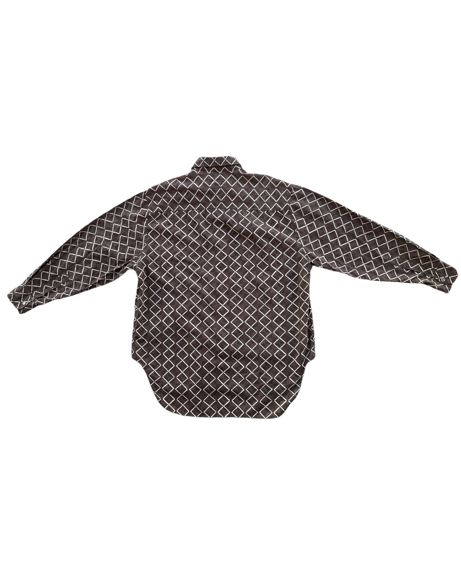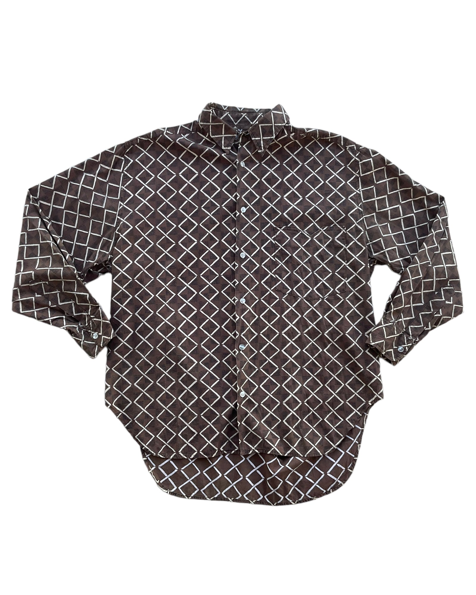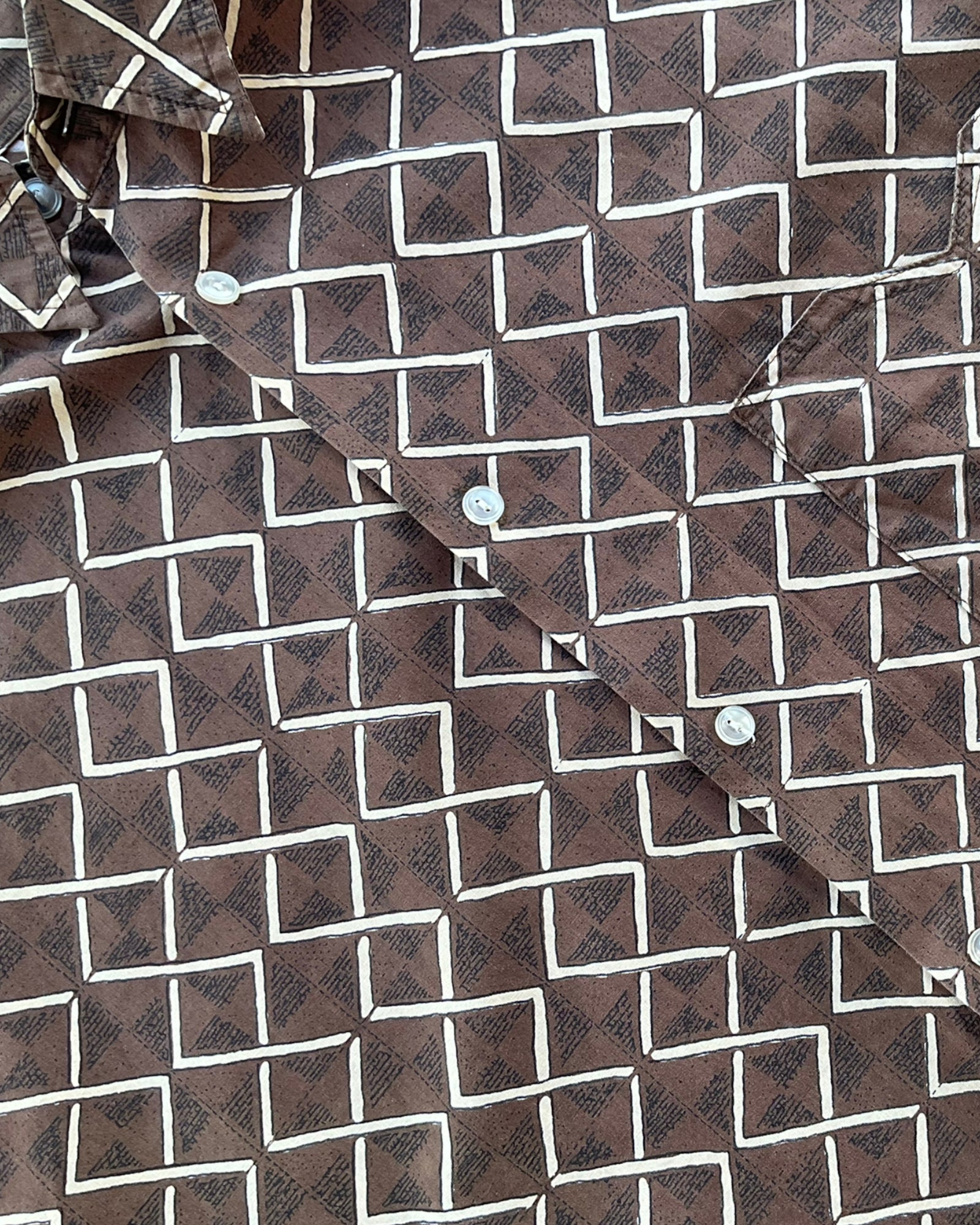 CAMISA DE BOTONES MANGA LARGA COLOR CAFÉ CON ESTAMPADO DE LINEAS BLANCAS EN ZIG ZAG, BOLSILLOS FRONTAL. SIN DETALLES DE USO.