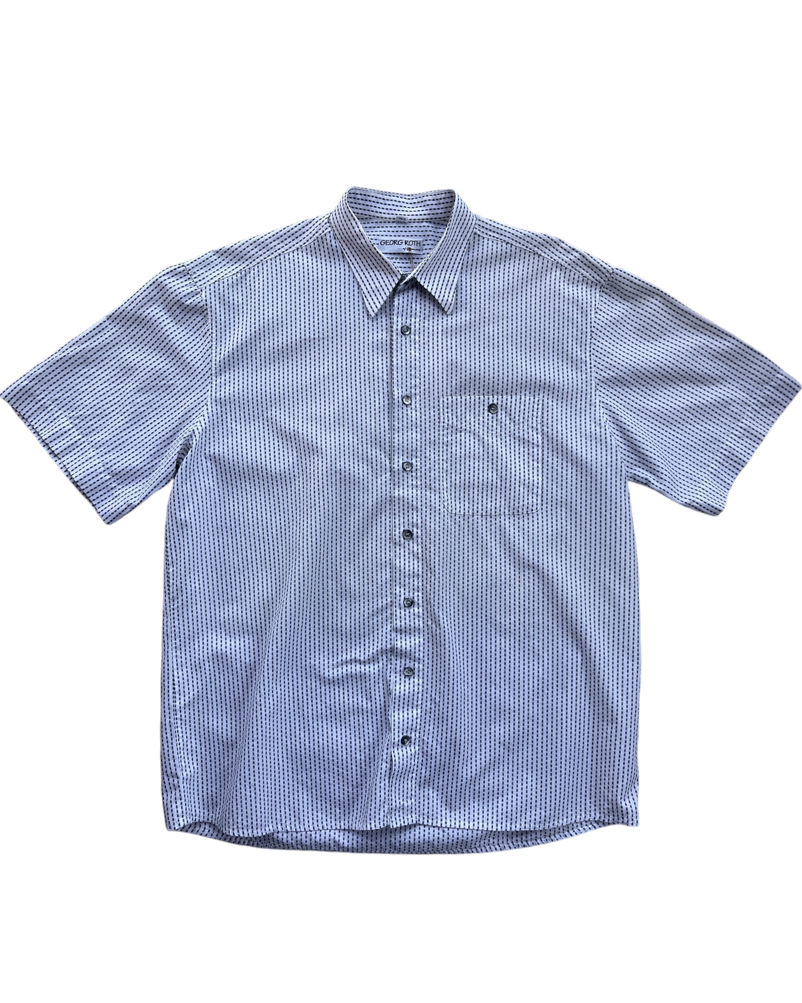 CAMISA BLANCA CON ESTAMPADO DE MINI RECTÁNGULOS NEGROS, MANGA CORTA, BOTONES AL FRENTE, UN BOLSILLO EN EL PECHO, 100% ALGODÓN