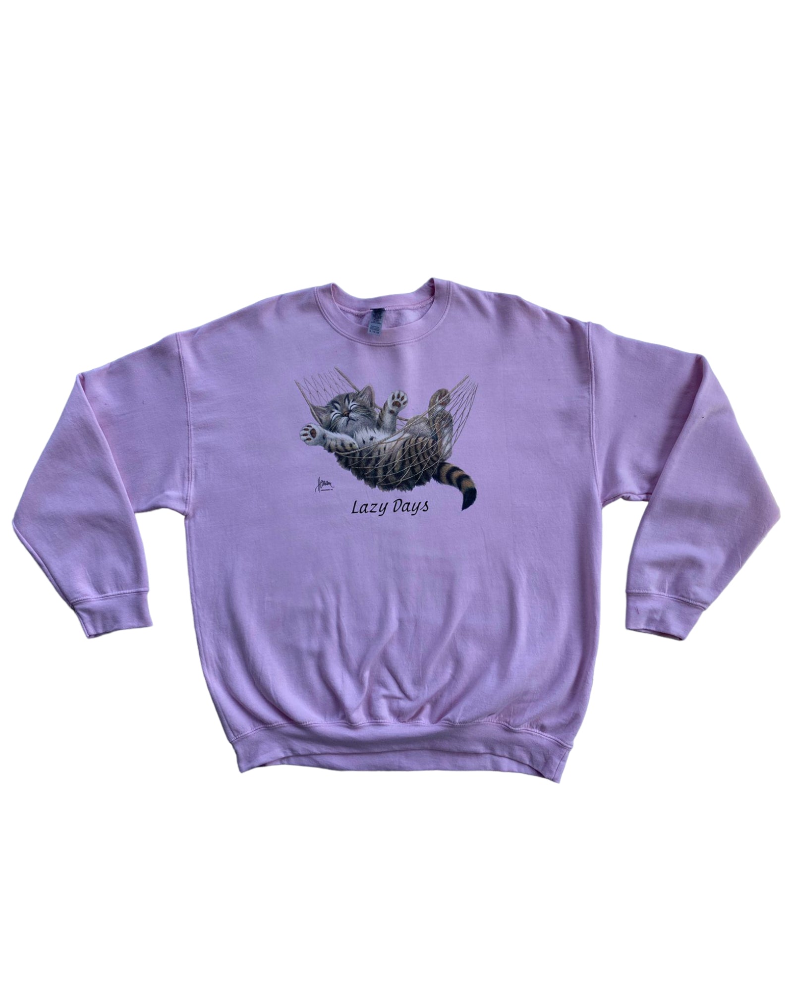 SUDADERA GILDAN 50% ALGODON 50% POLYESTER ROSA CLARO CON PRINT "LAZY DAYS" Y GATITO ACOSTADO EN UNA HAMACA. SIN DETALLES DE USO.