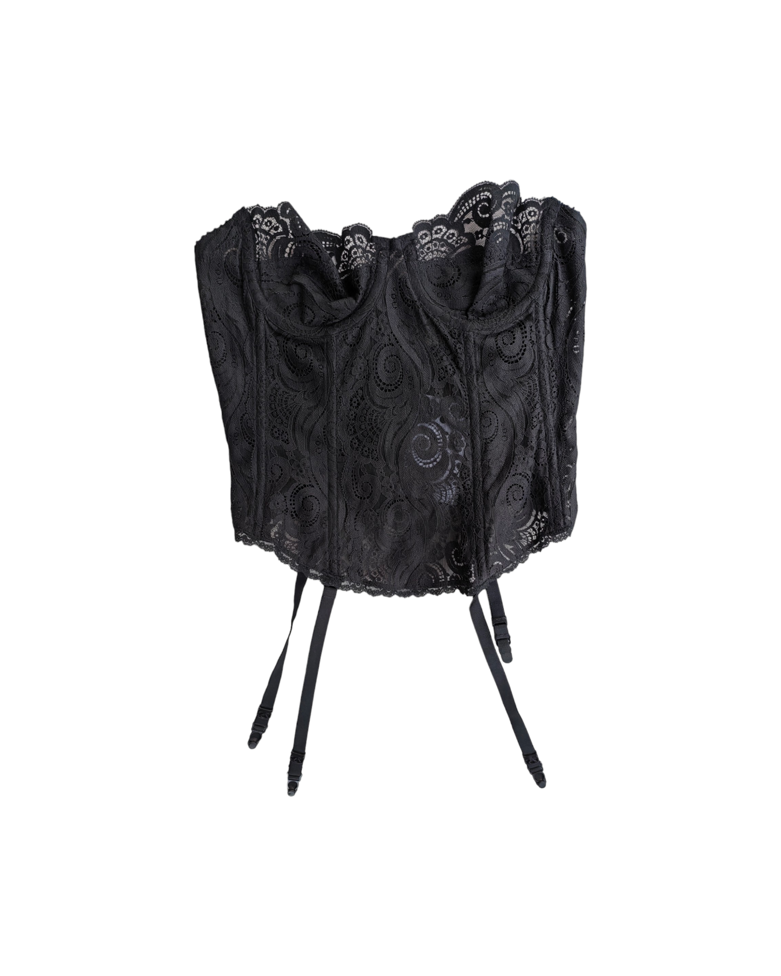 TOP NEGRO DE ENCAJE SIN FORRO. DETALLE DE LISTONES COLGANDO. 100% NYLON. SIN DETALLES DE USO