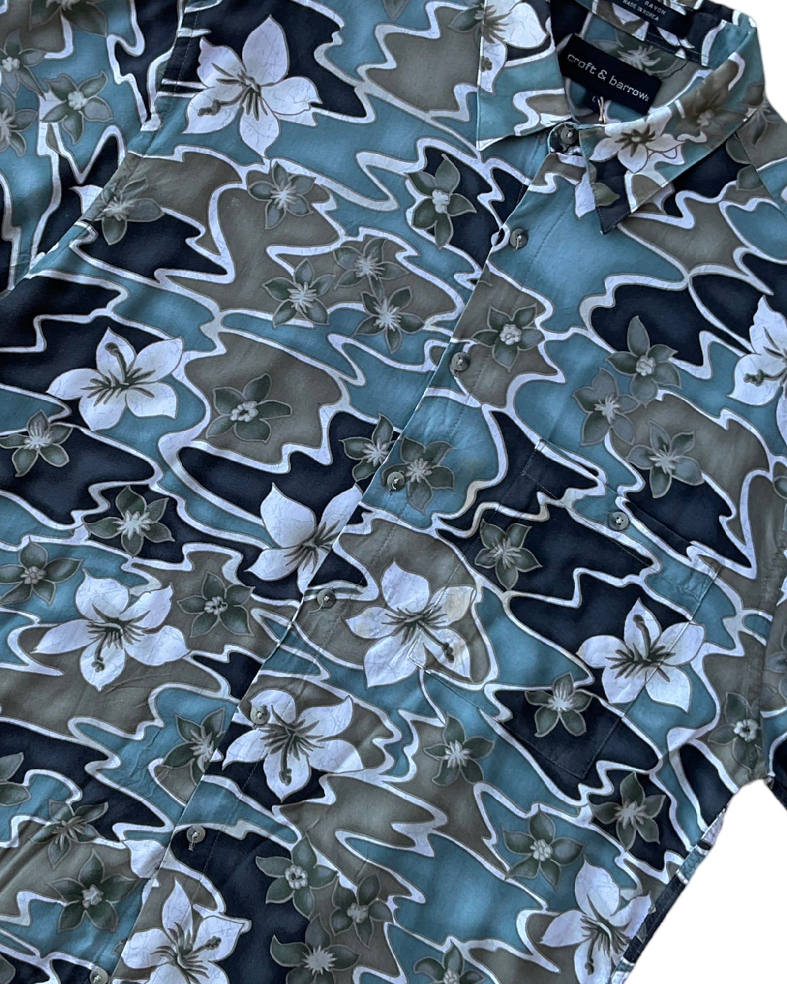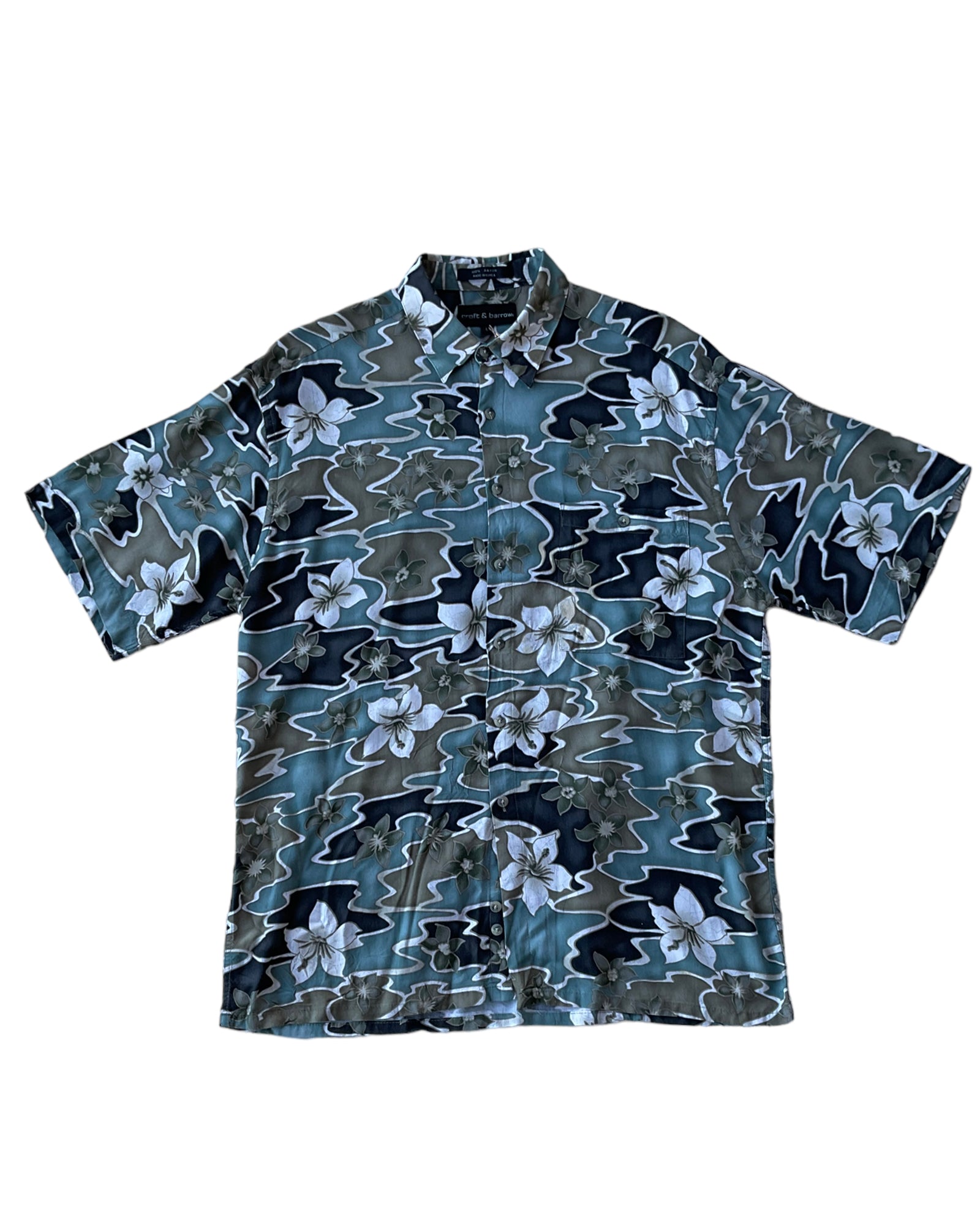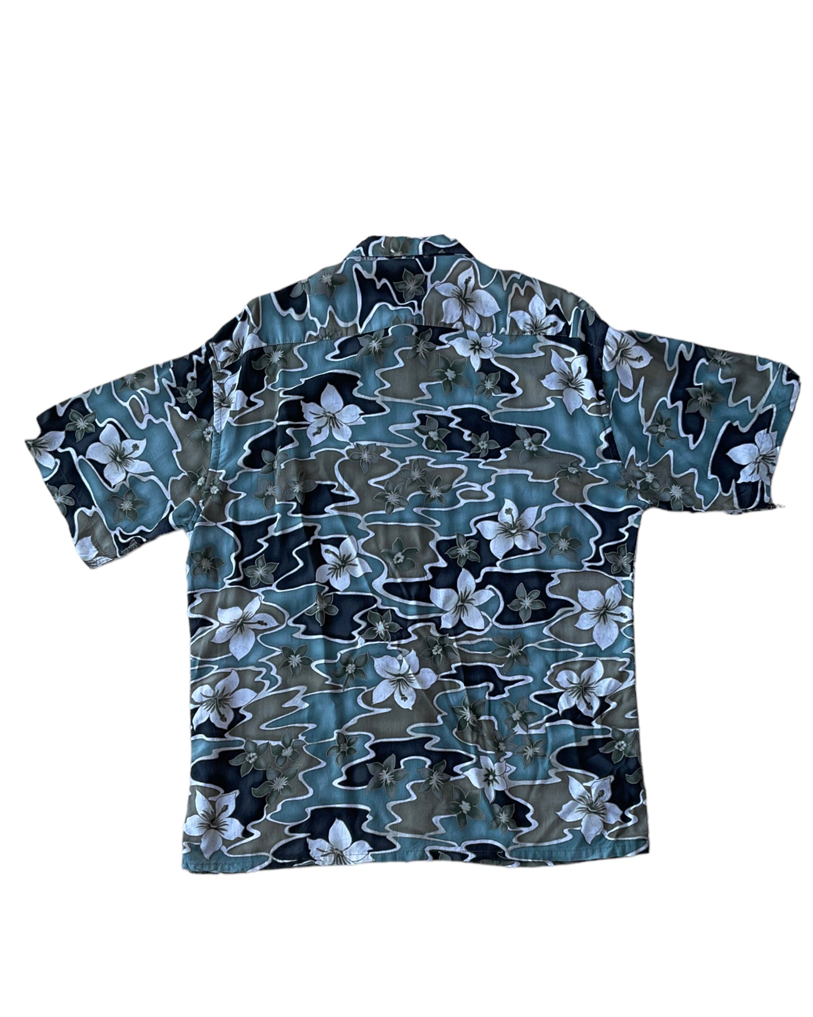 CAMISA HAWAIIANA CON ESTAMPADOS VERDES. BOLSILLO FRONTAL. 100% RAYÓN.