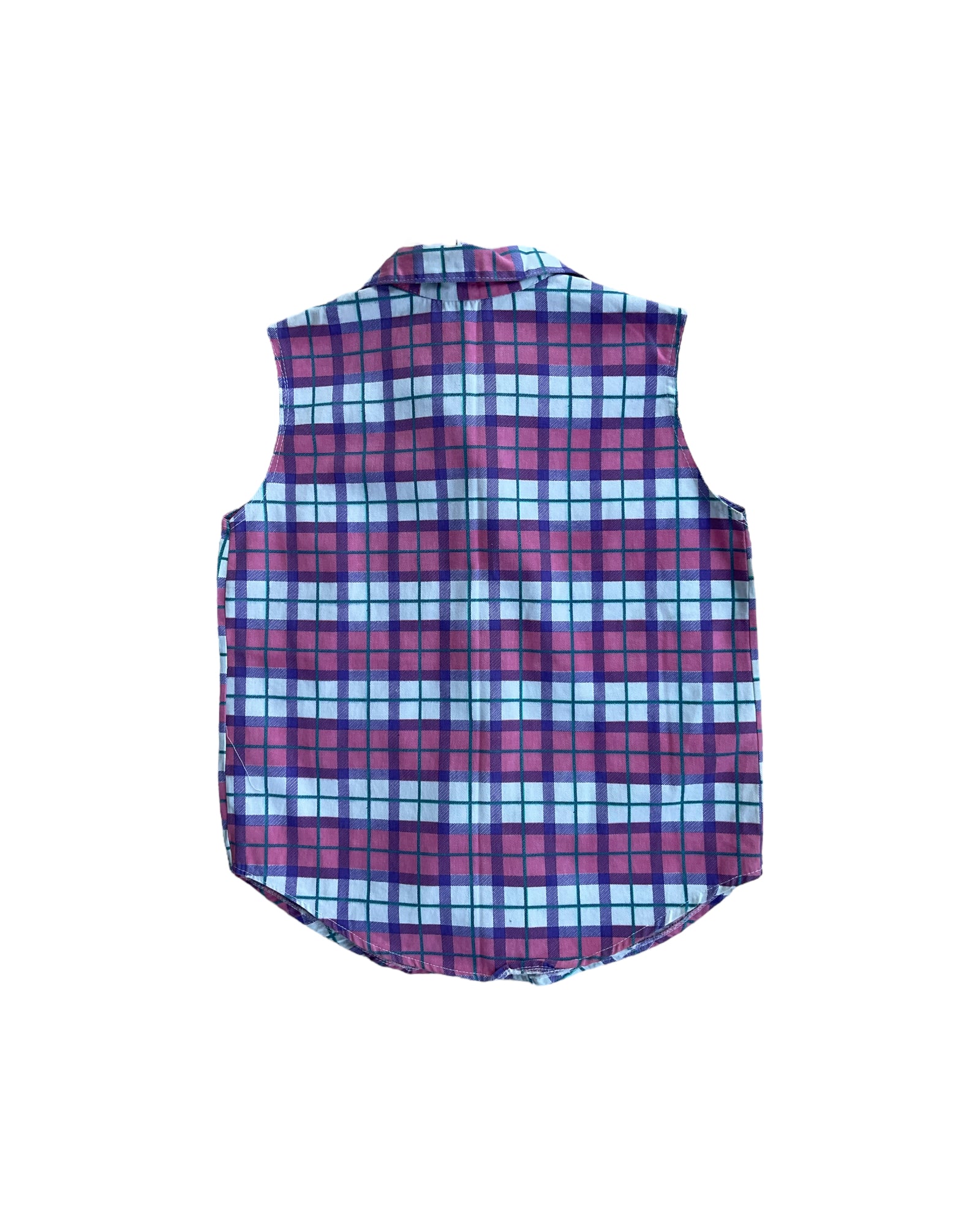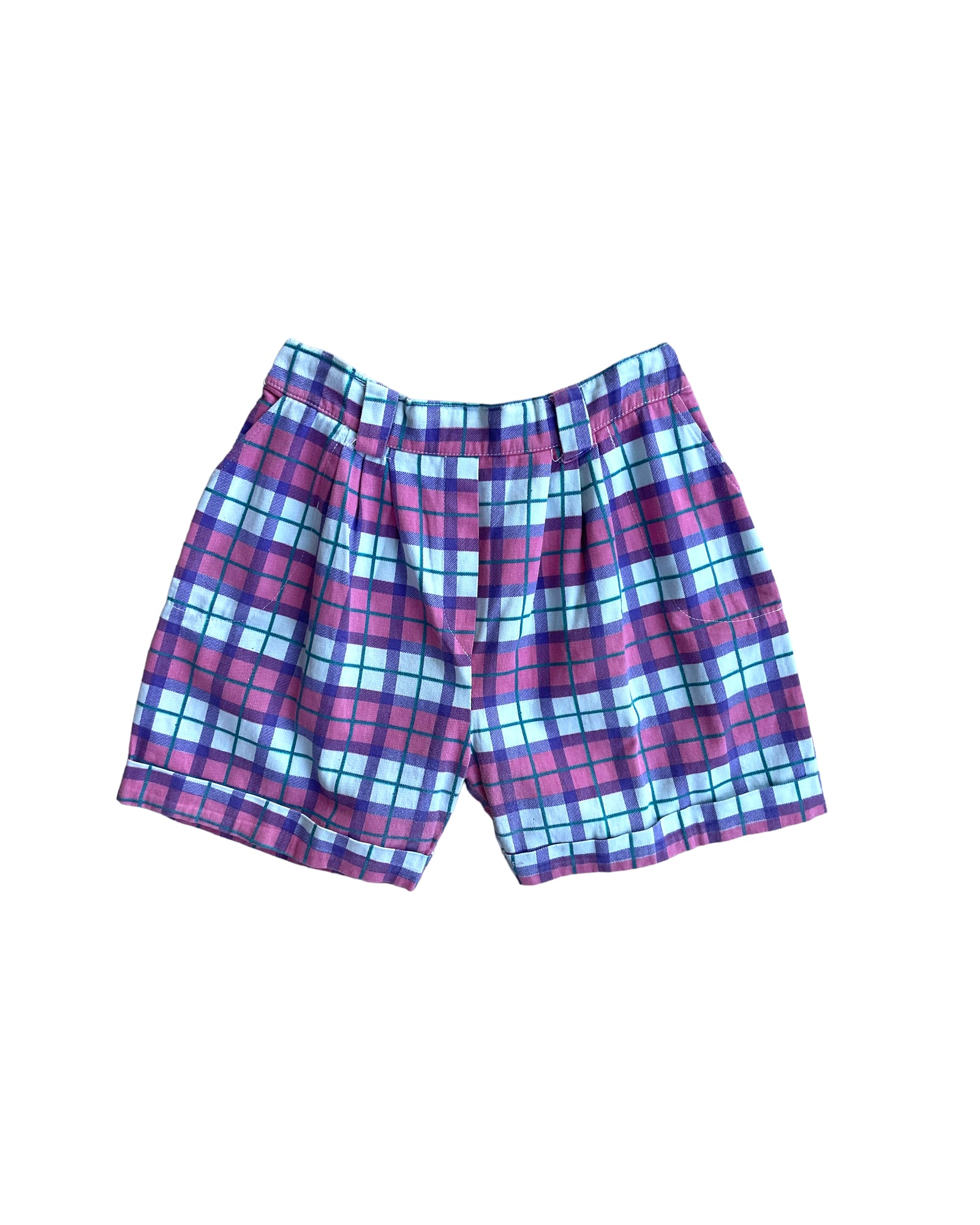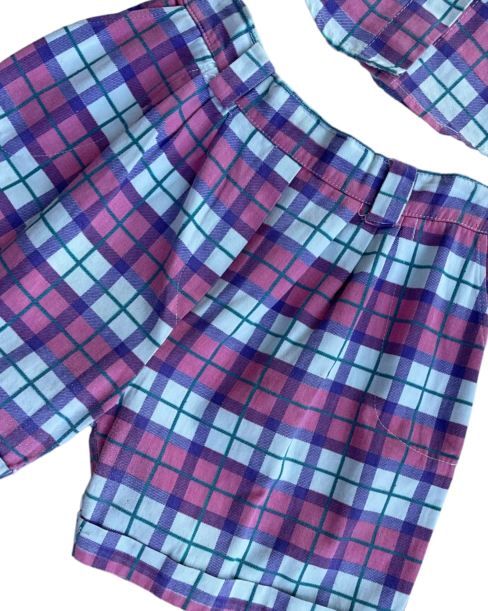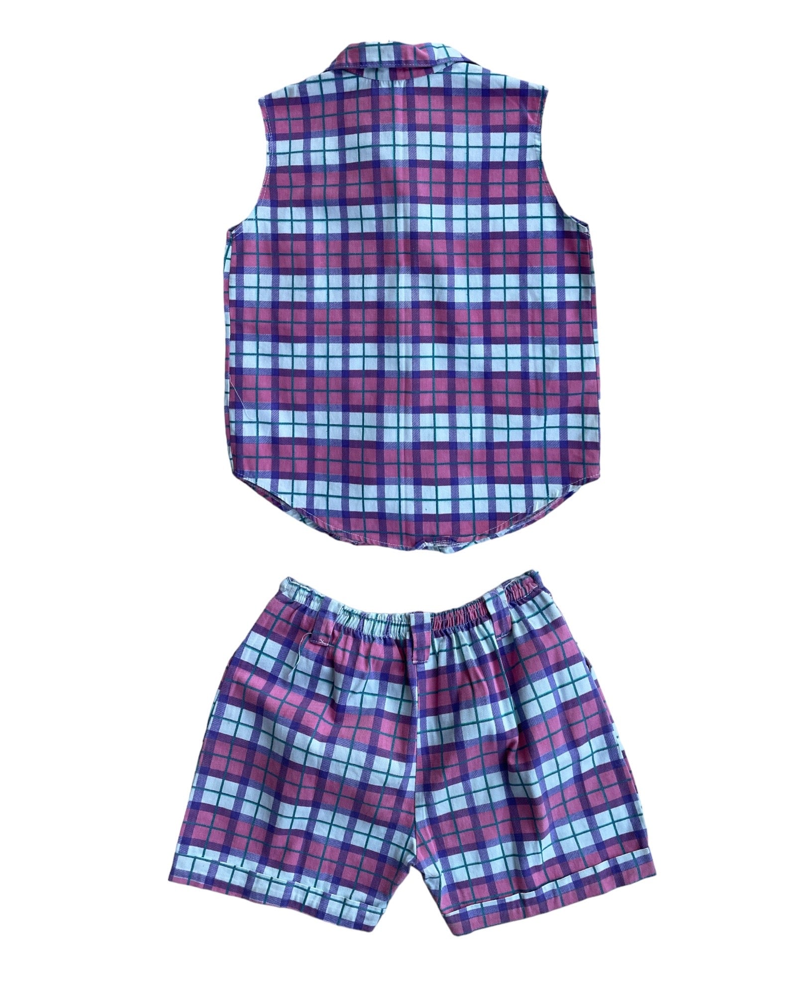 CONJUNTO DE CAMISA DE BOTONES SIN MANGAS Y SHORTS DE ESTAMPADO DE CUADROS MORADO, ROSA, BLANCO Y AZUL. CINTURA CON STRETCH EN LA PARTE TRASERA Y BOLSILLOS DELANTEROS. HECHO A MANO. SIN DETALLES DE USO.