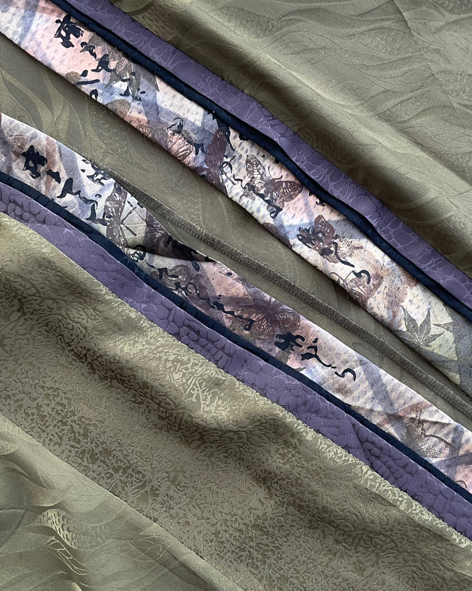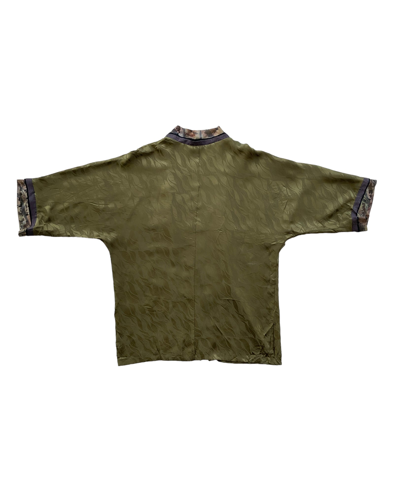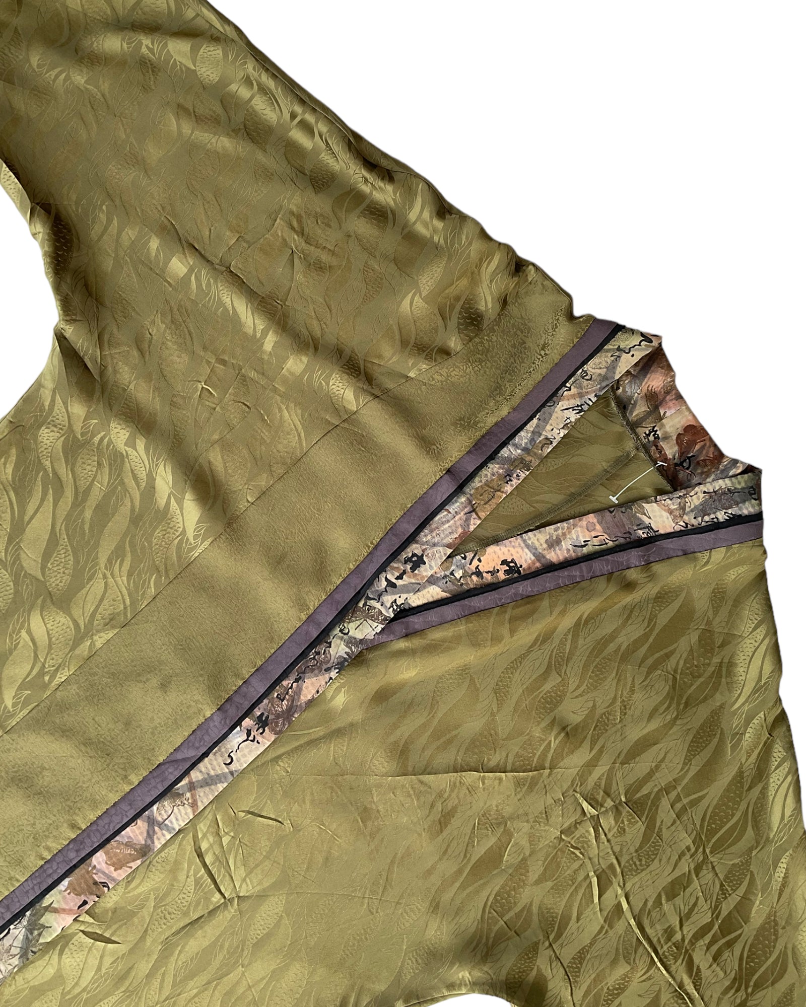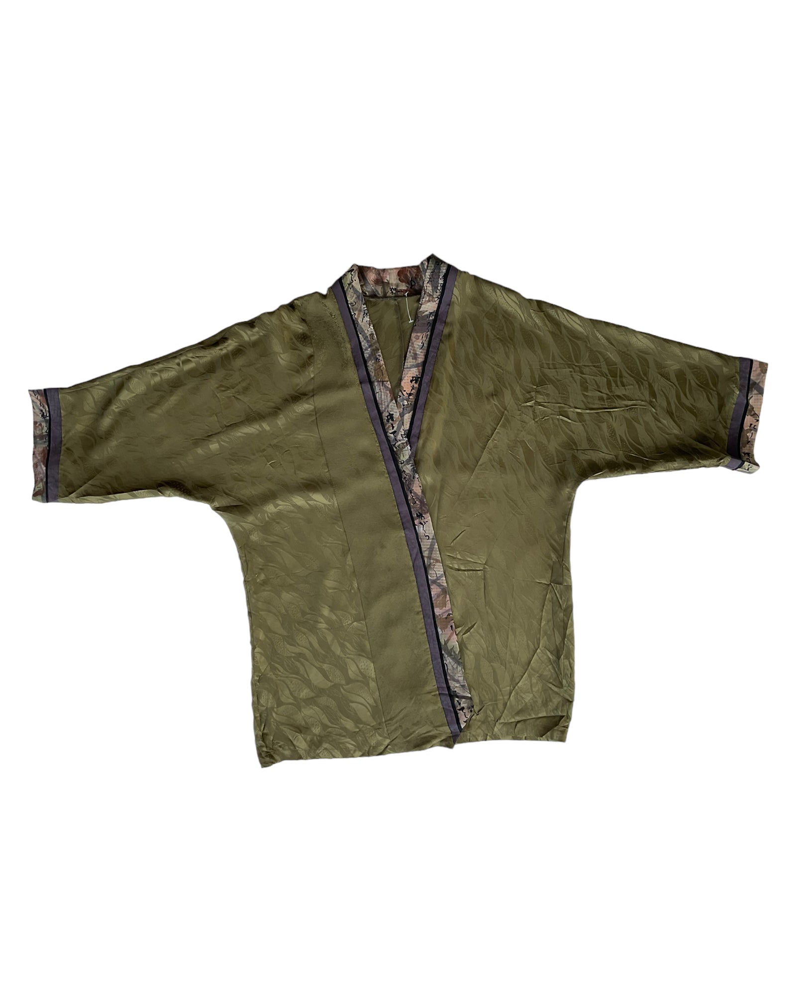 BATA ESTILO HAPPI JAPONÉS EN COLOR VERDE OLIVA, CON DETALLES DE HOJAS SUBLIMADAS EN LA TELA, CARACTERES ASIÁTICOS PINTADOS EN LOS BORDES Y LAS MANGAS. SIN DETALLES DE USO.