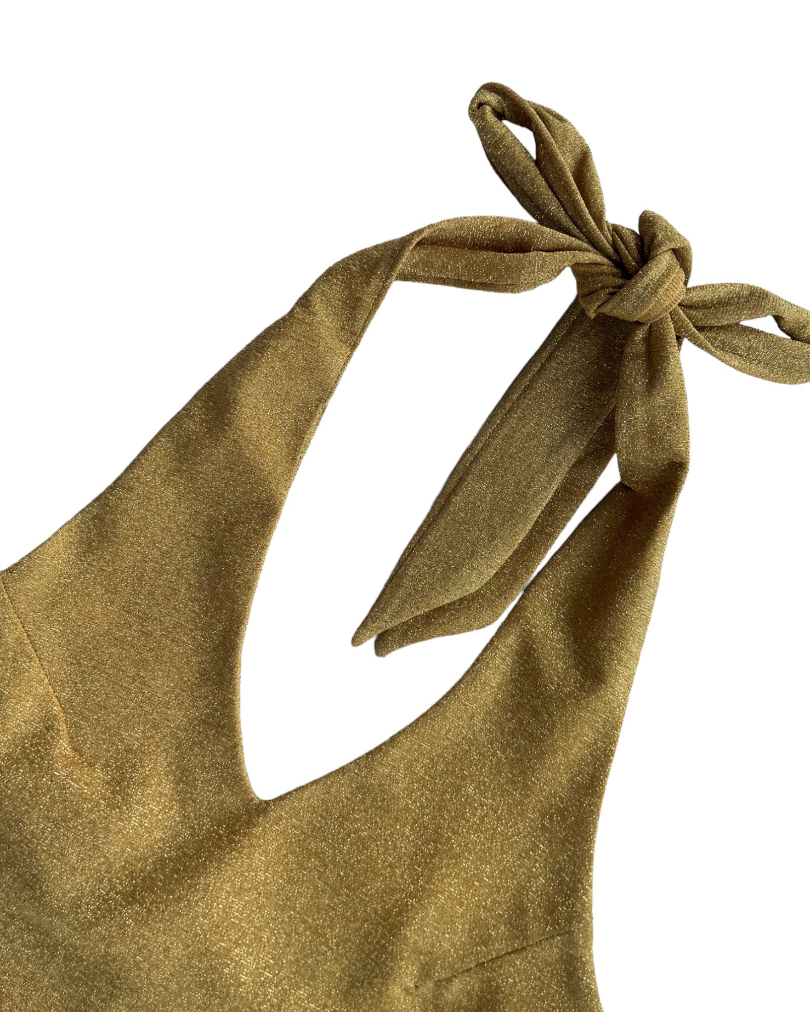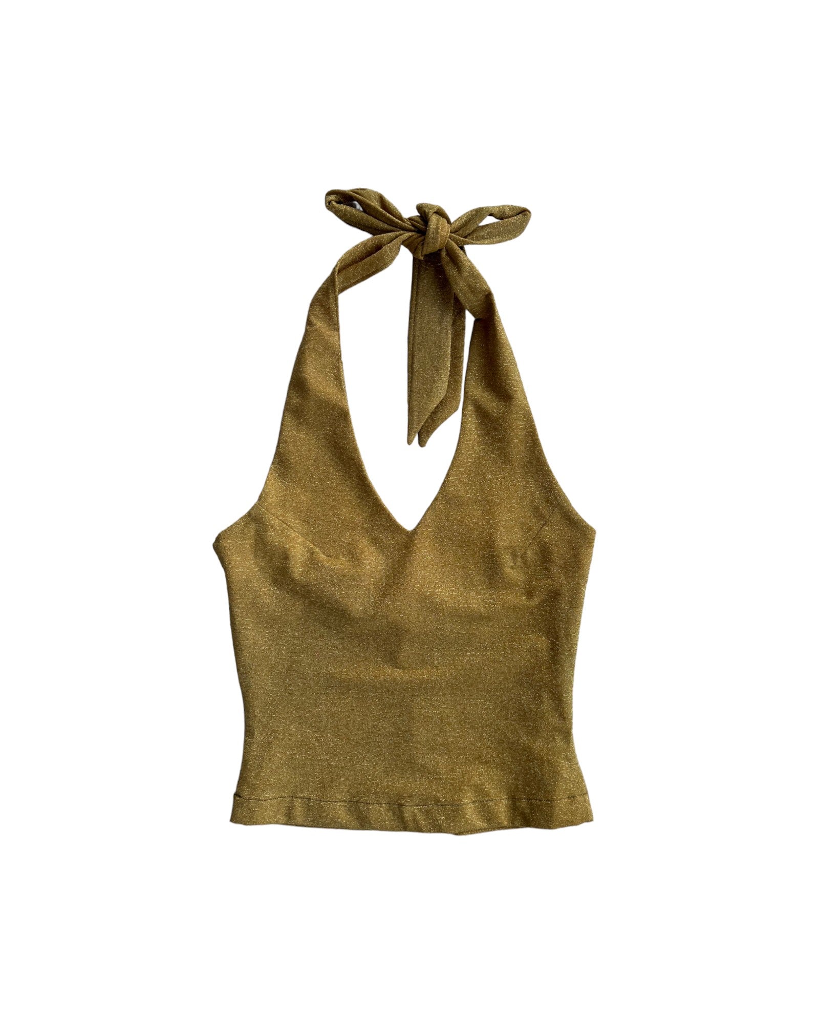 TOP HALTER PARA AMARRAR AL CUELLO. AJUSTABLE Y AMOLDA AL CUERPO. DORADO CON BRILLITOS. SIN DETALLES DE USO.