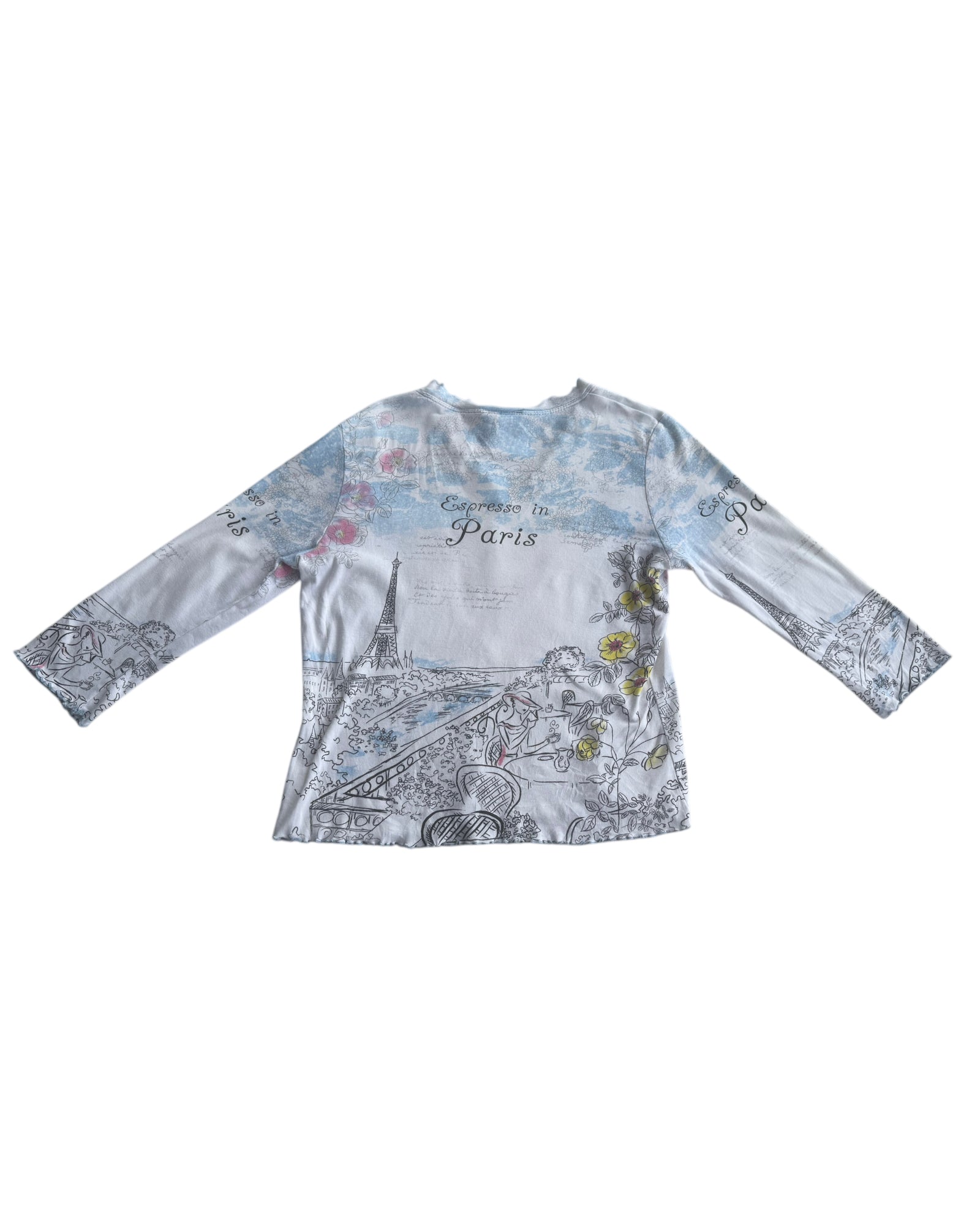 TOP IMPULSE PRINT CUTE DE PARIS BB, PEQUEÑOS BRILLANTES PEGADOS SOBRE LAS LETRAS QUE DICEN PARIS, CUELLO EN V. COLOR BLANCO CON BABY BLUE, PRINT EN DIFERENTES COLORES, CAFE, NEGRO, AMARILLO, ESTÁ ULTRA SUAVE PORQUE ES 100% ALGODÓN.