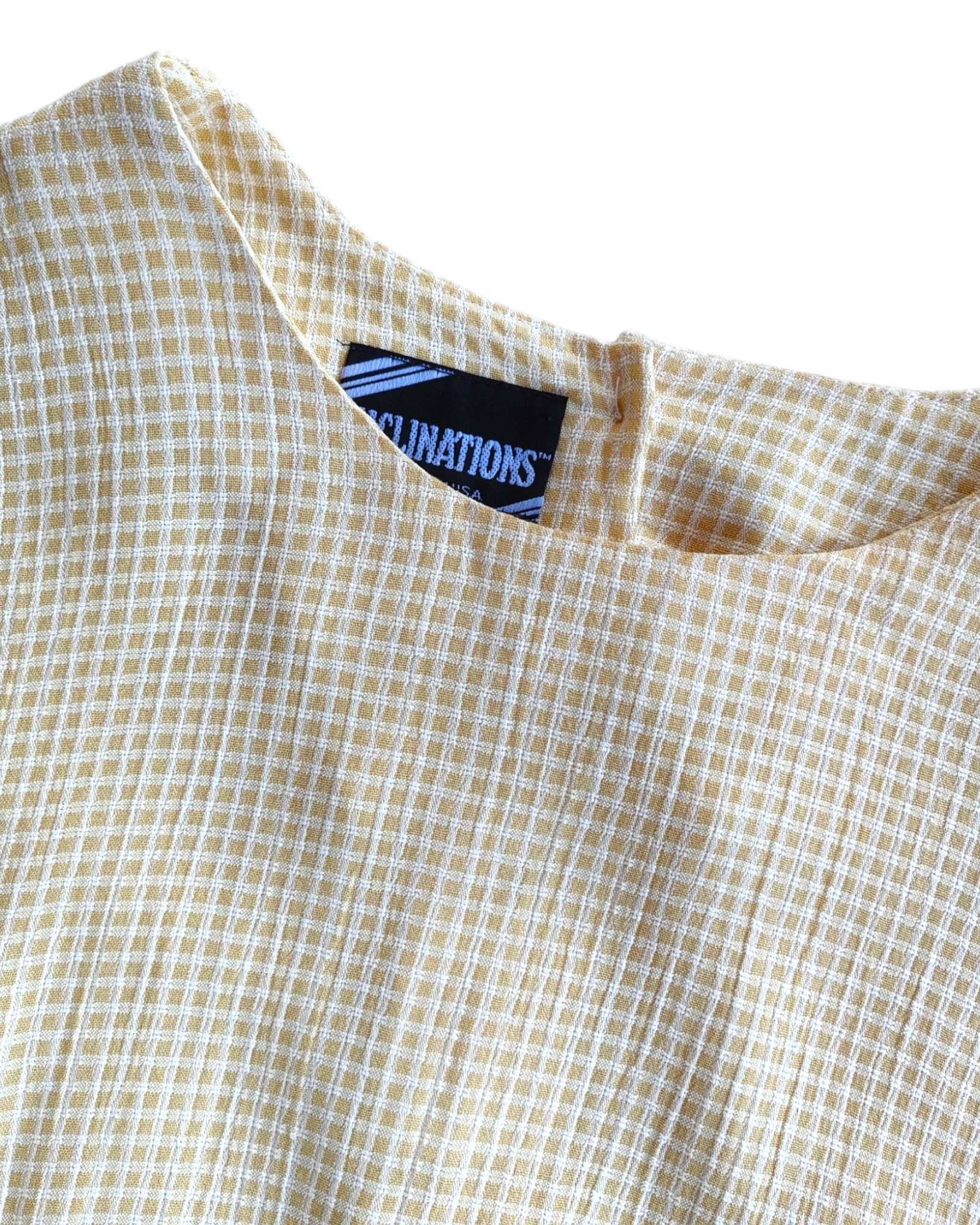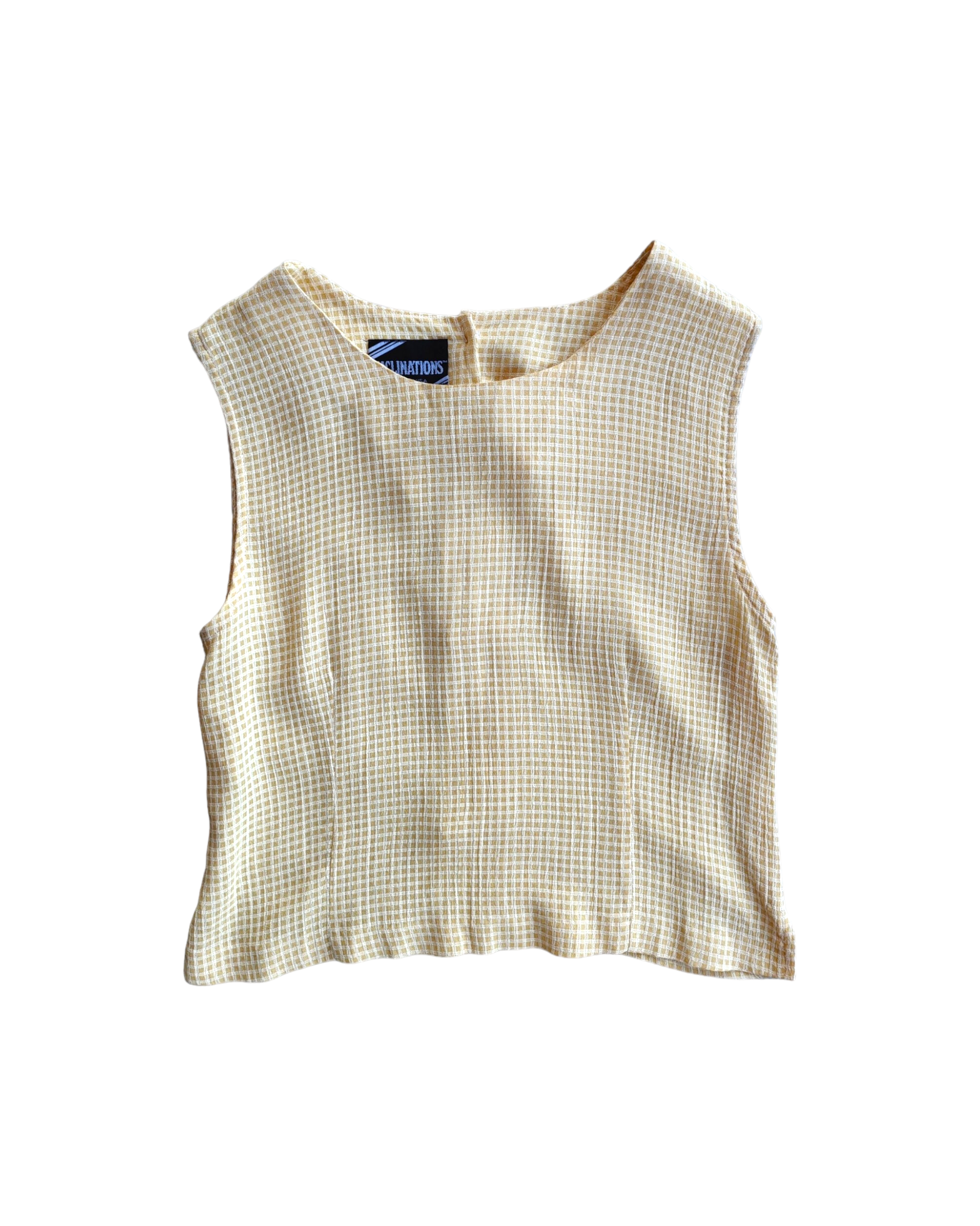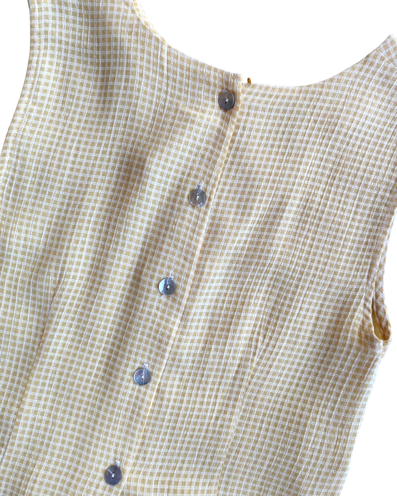 BLUSA SIN MANGAS 53% ACETATO 47% RAYÓN, CUADROS BLANCOS CON AMARILLO. BOTONES CENTRALES COLOR PLATEADO. SIN DETALLES.