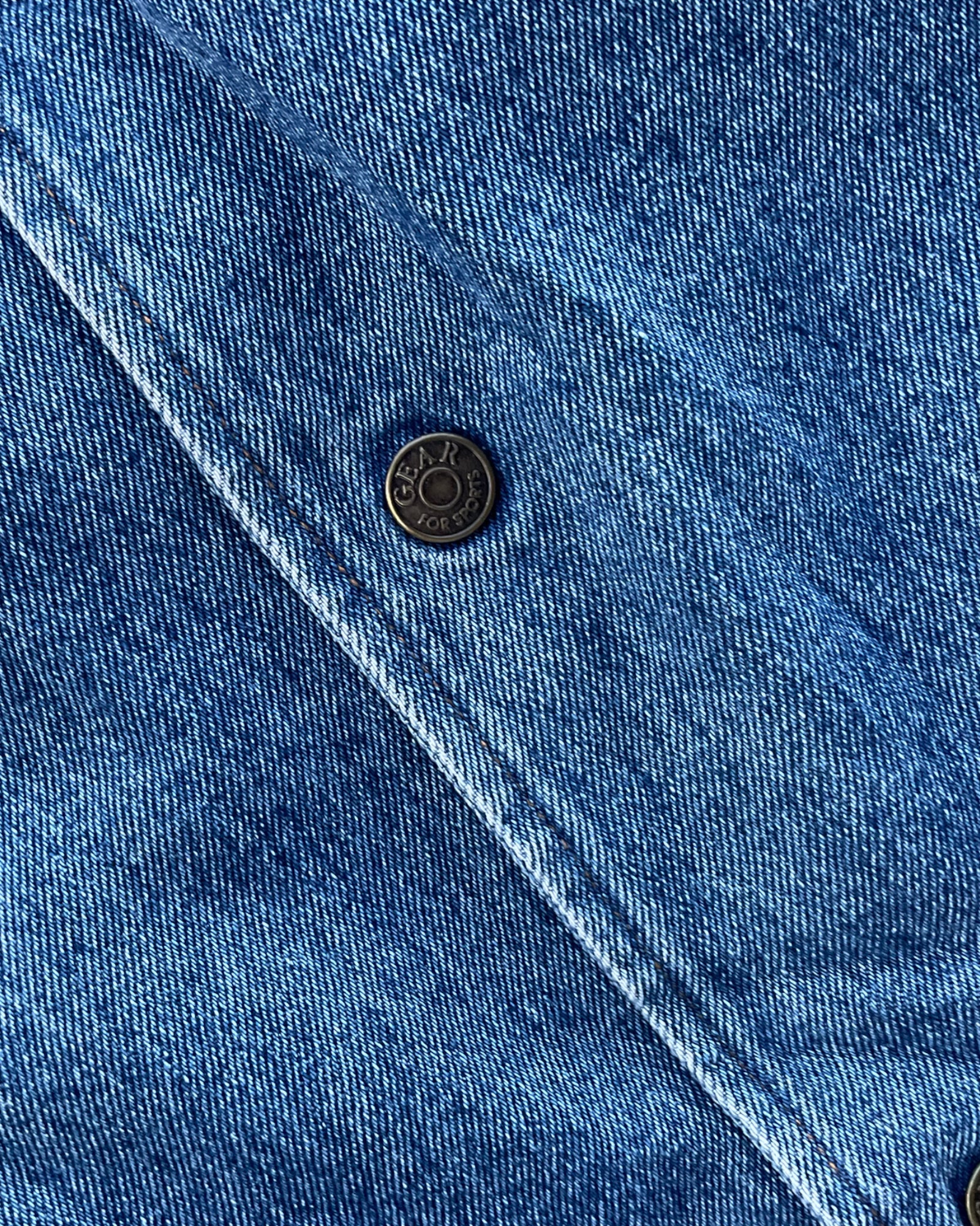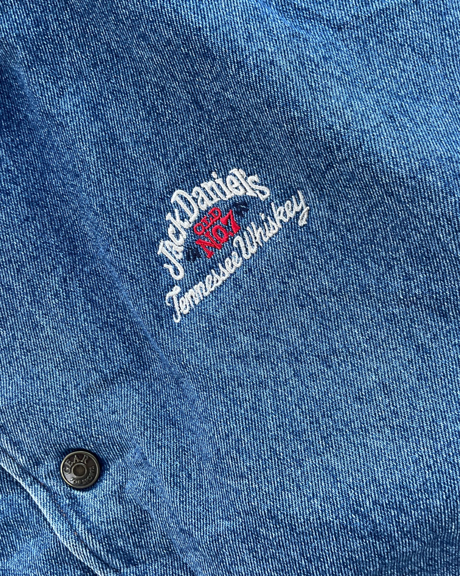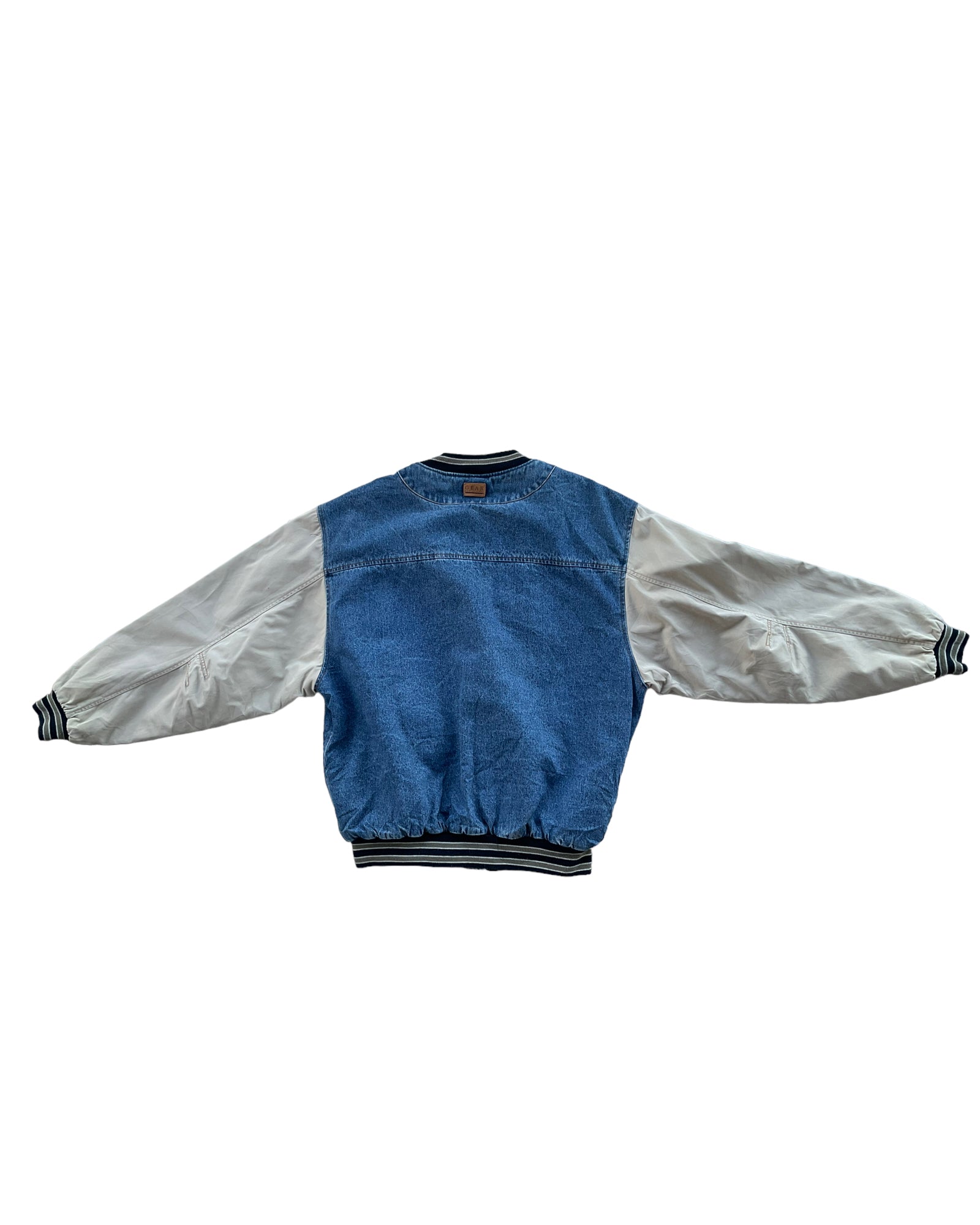 CHAMARRA DE MEZCLILLA TIPO VARSITY SPORTS, BORDADO EN EL PECHO DE LADO IZQUIERDO. MANGAS DE COLOR BEIGE. 100% ALGODÓN