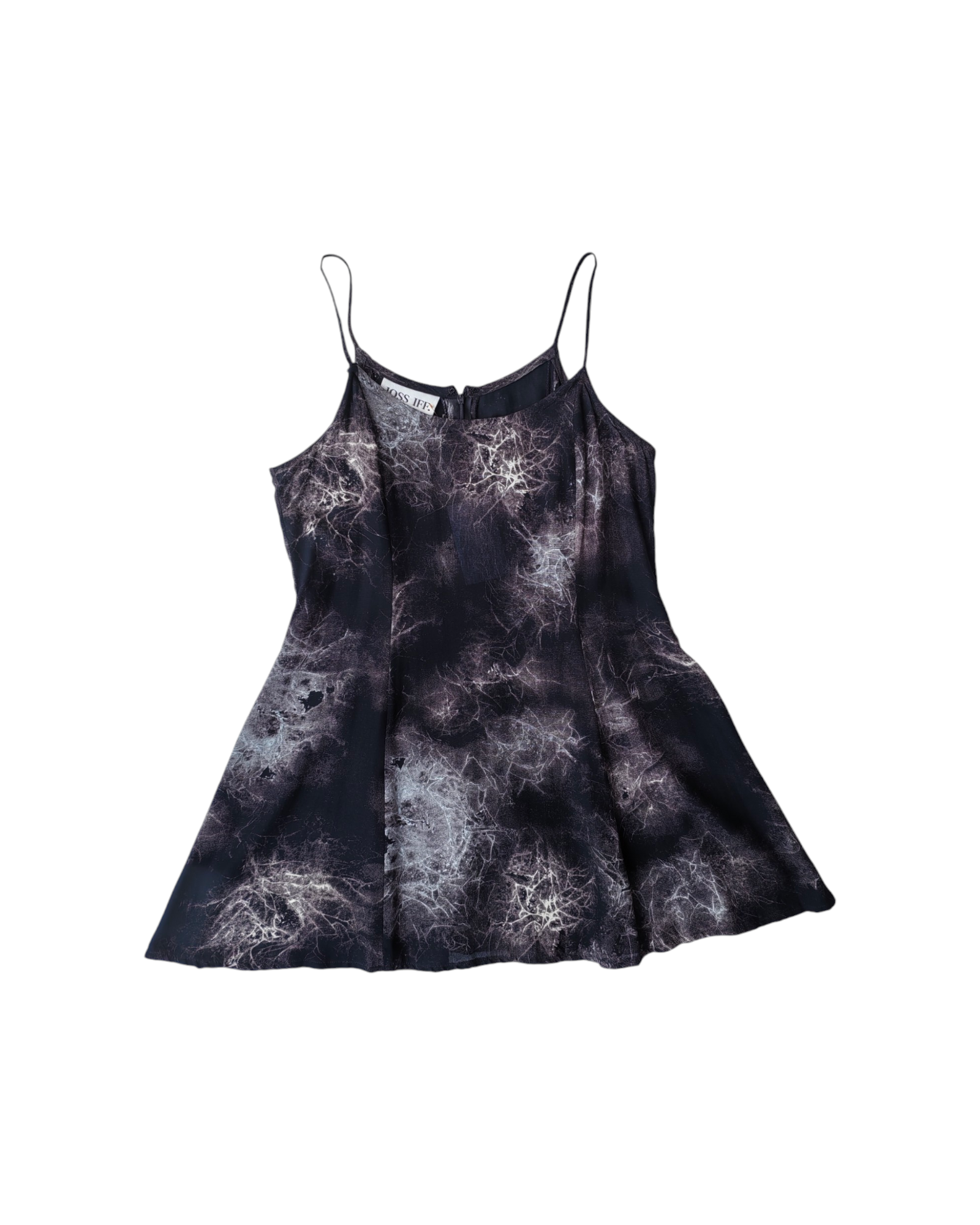 VESTIDO DE TIRANTES, COLOR NEGRO CON DETALLES DE RAYAS BLANCAS Y GRISES TIPO RAYOS. CIERRE TRASERO CON BROCHE. LIGERA TRANSPARENCIA.