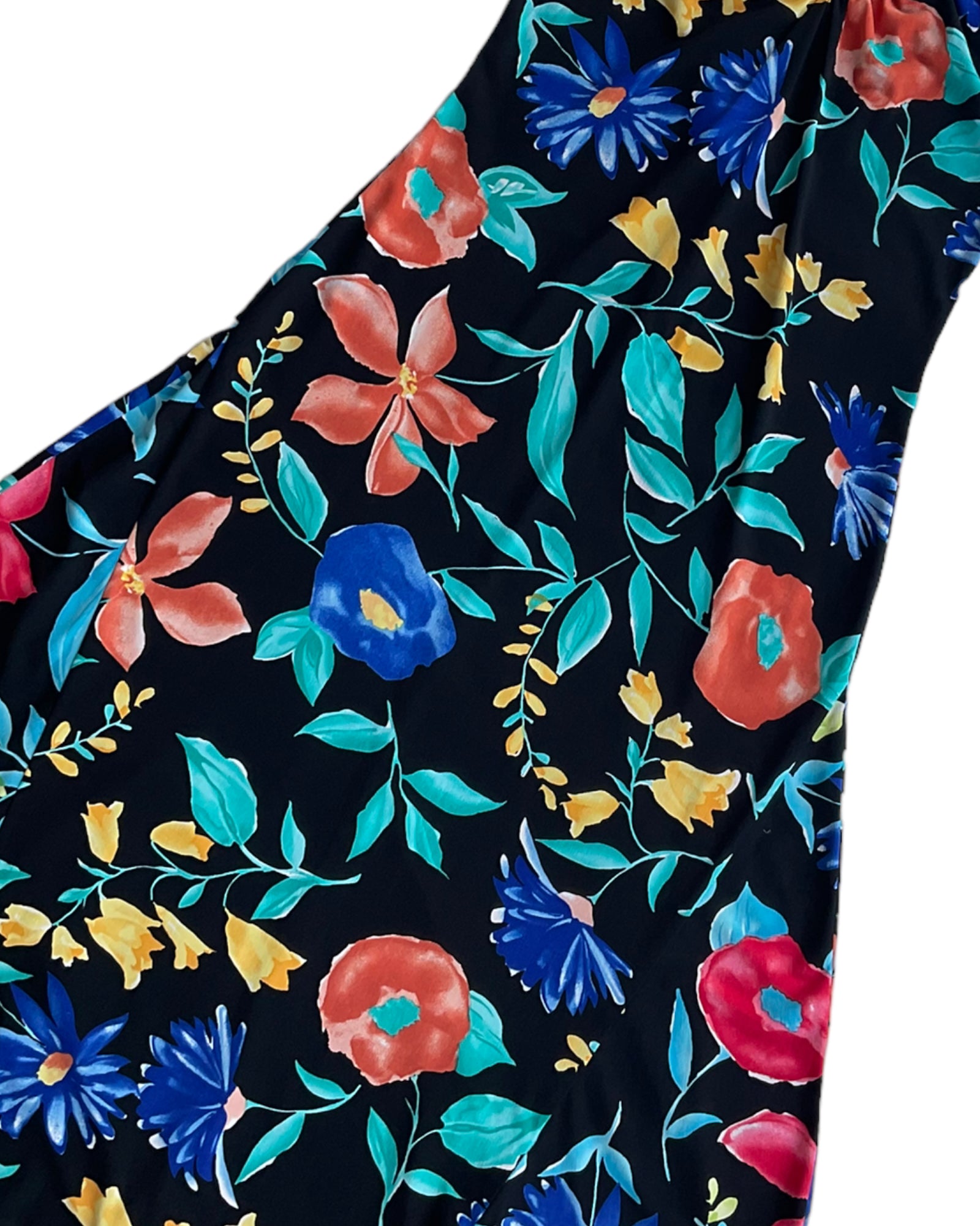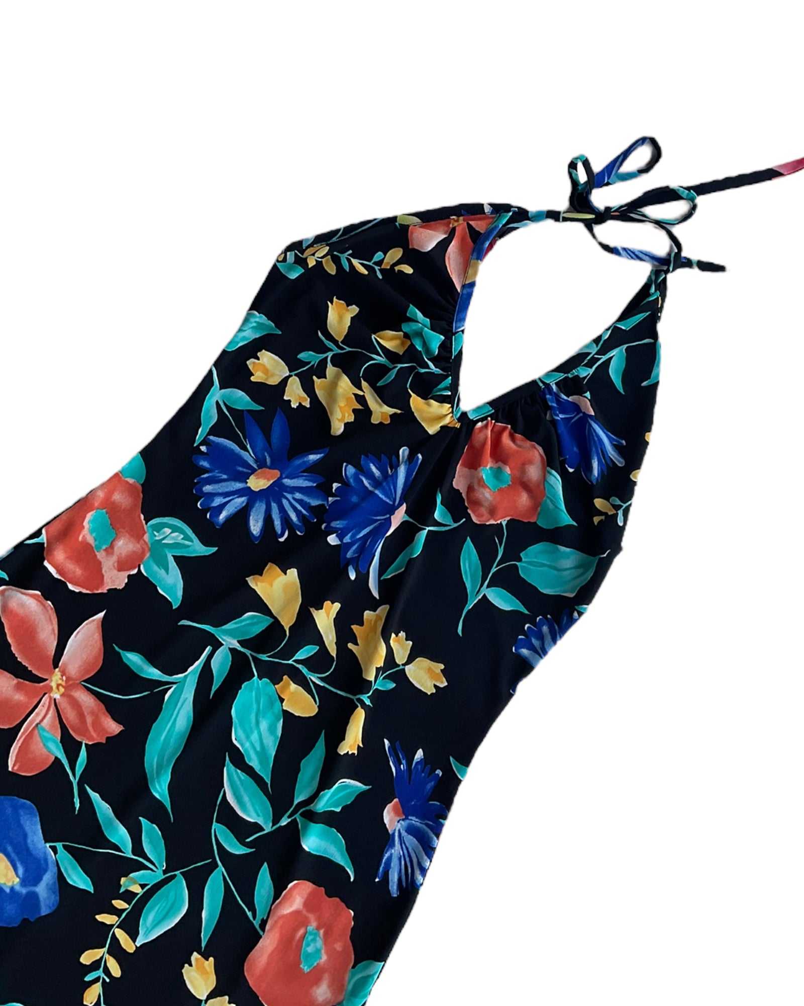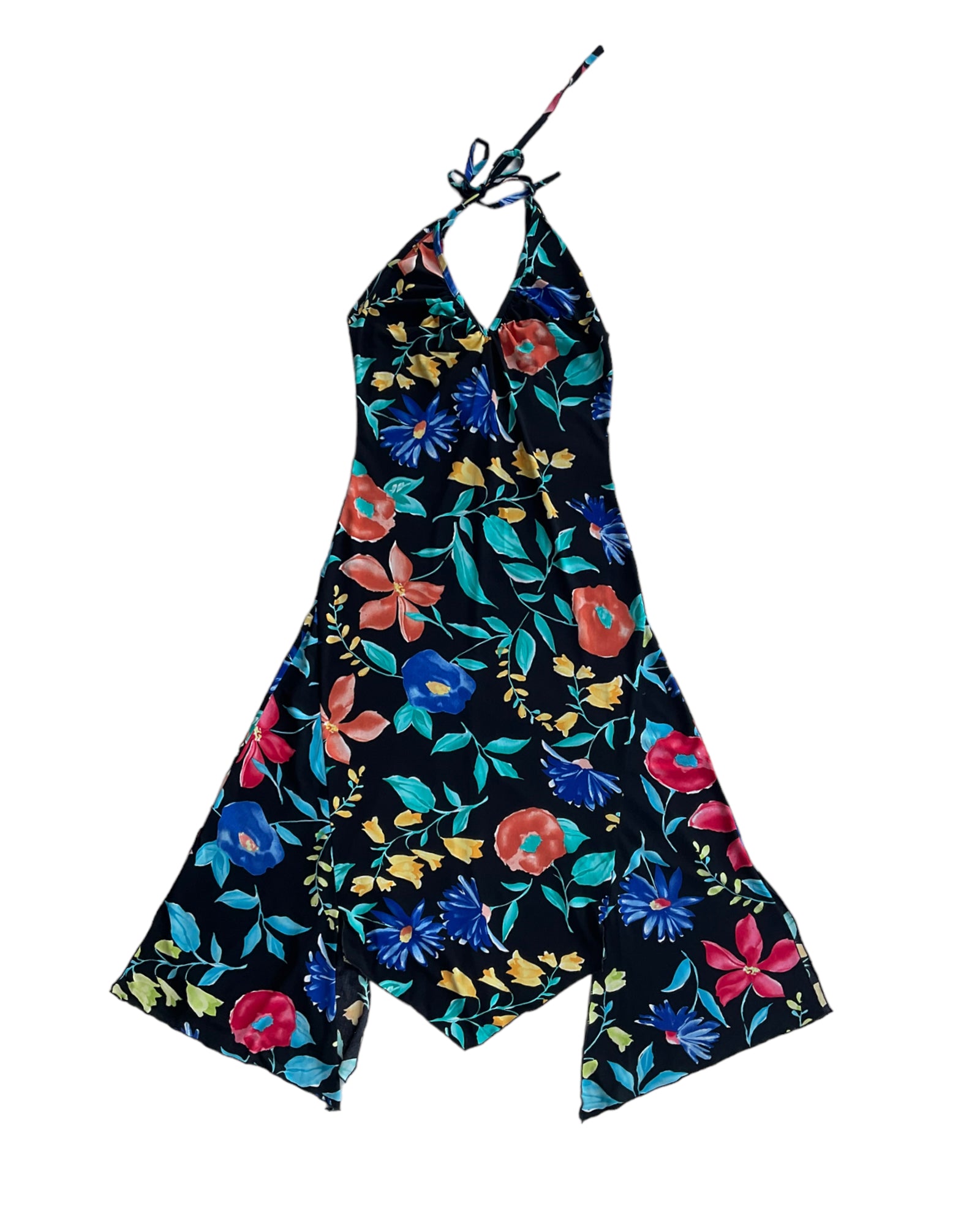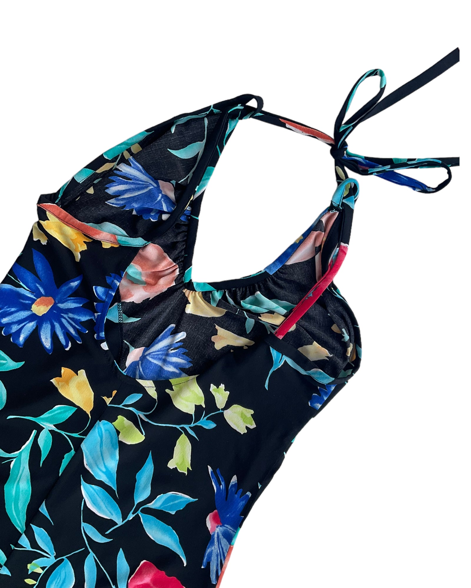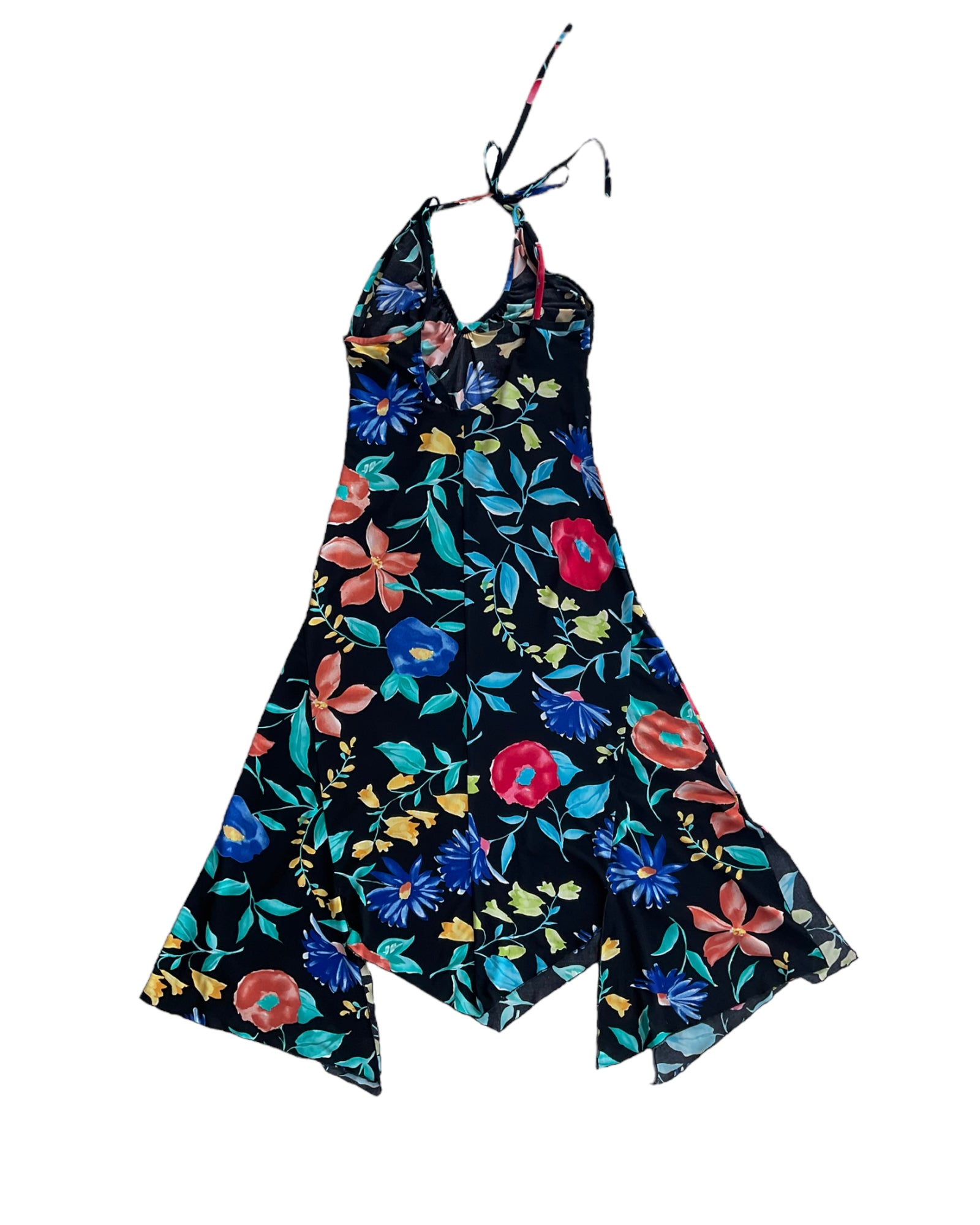 VESTIDO NEGRO DE TIRANTES AJUSTABLES QUE SE AMARRAN EN LA ESPALDA, DE COLOR NEGRO CON FLORES DE COLORES AZUL, ROJO, VERDE Y AMARILLO. ESCOTE EN LA ESPALDA. CORTE ASIMÉTRICO EN LA FALDA. SIN DETALLES DE USO.