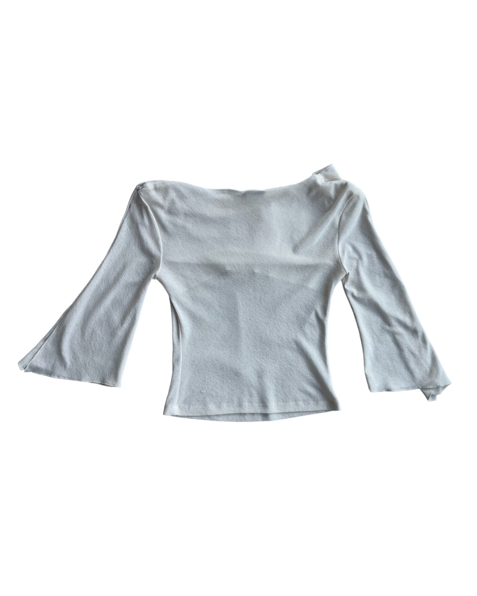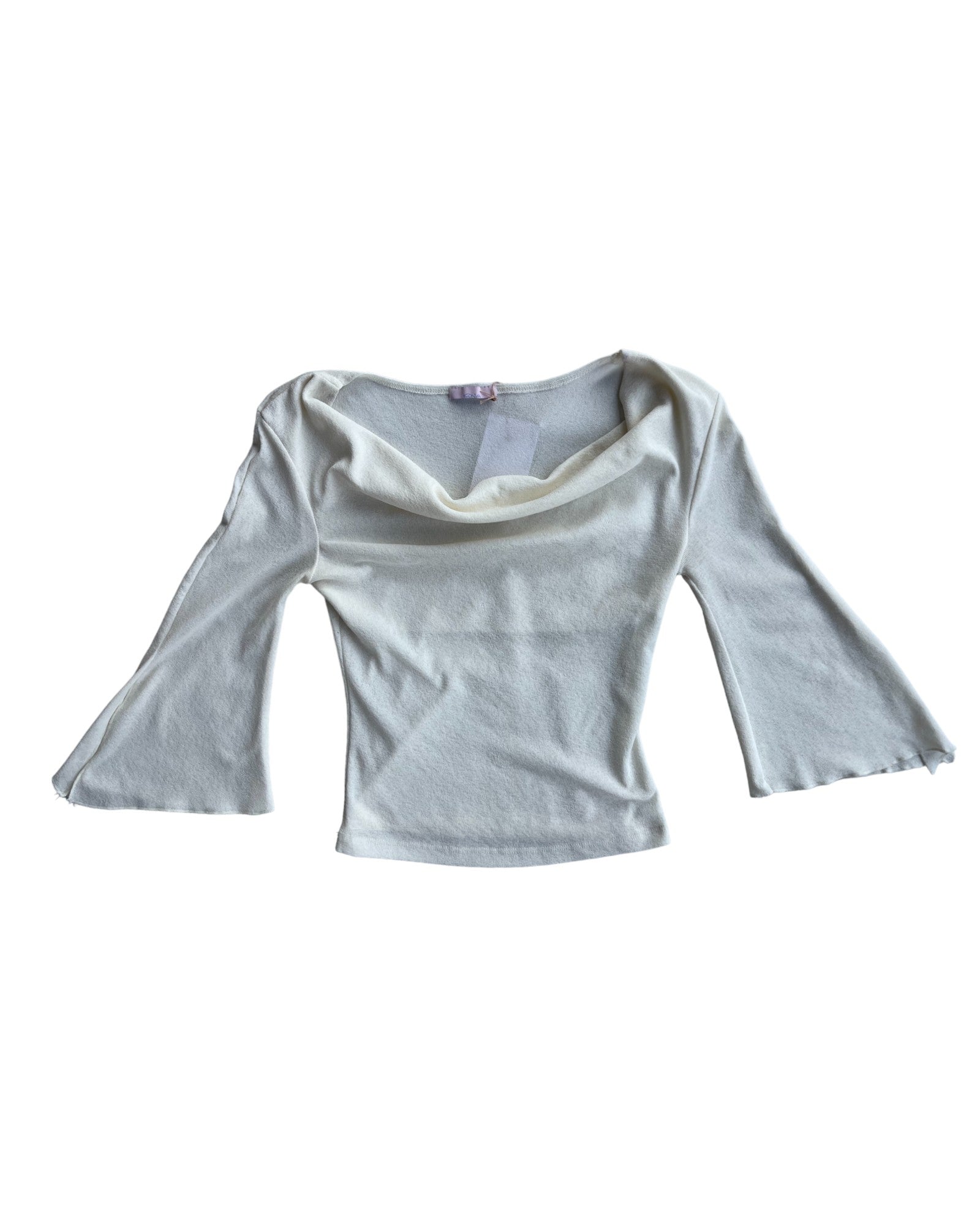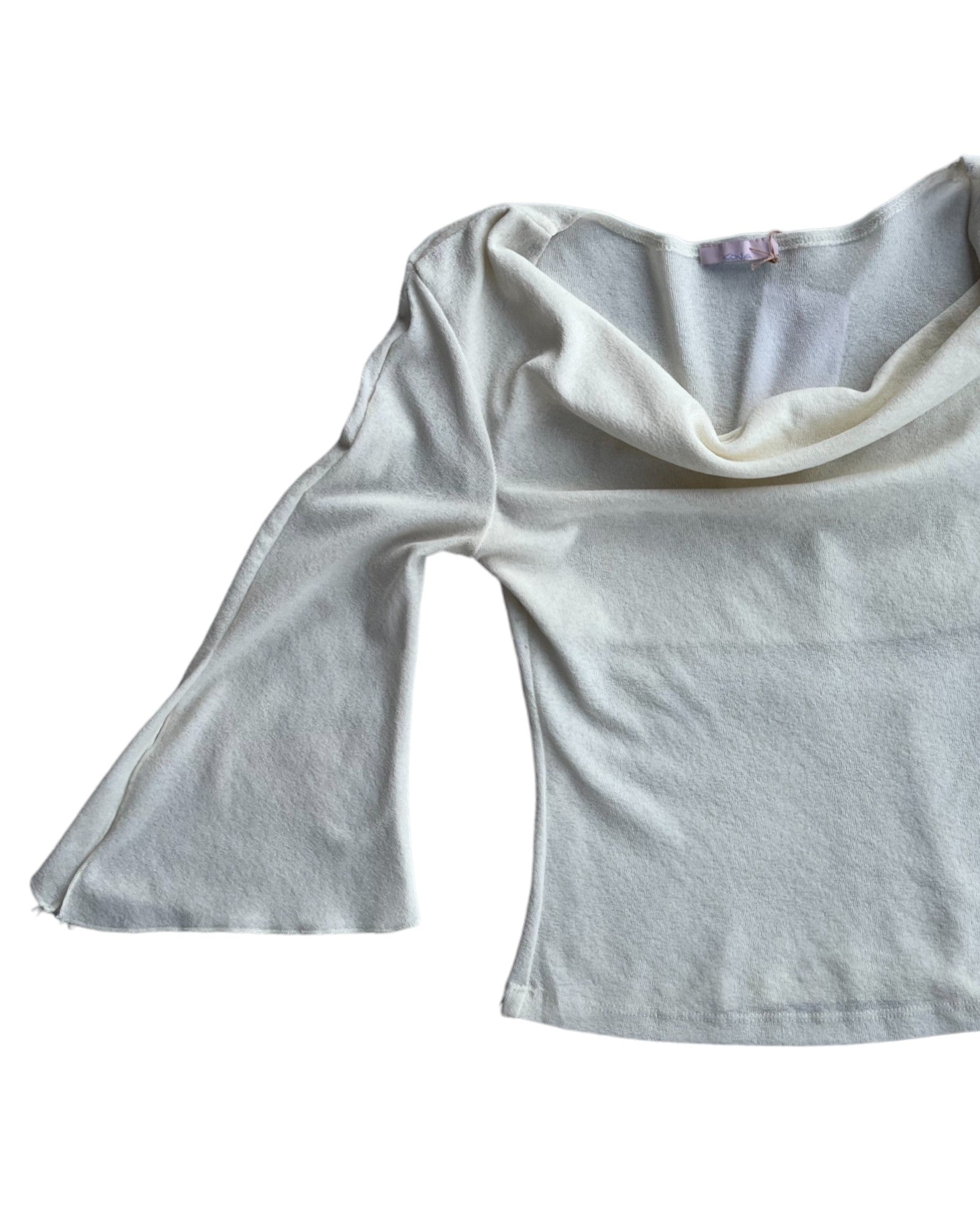 TOP BLANCO MICRO MESH CON CUELLO DRAPEADO. MANGAS TRES CUARTOS CON PEQUEÑA ABERTURA. SIN DETALLES DE USO.