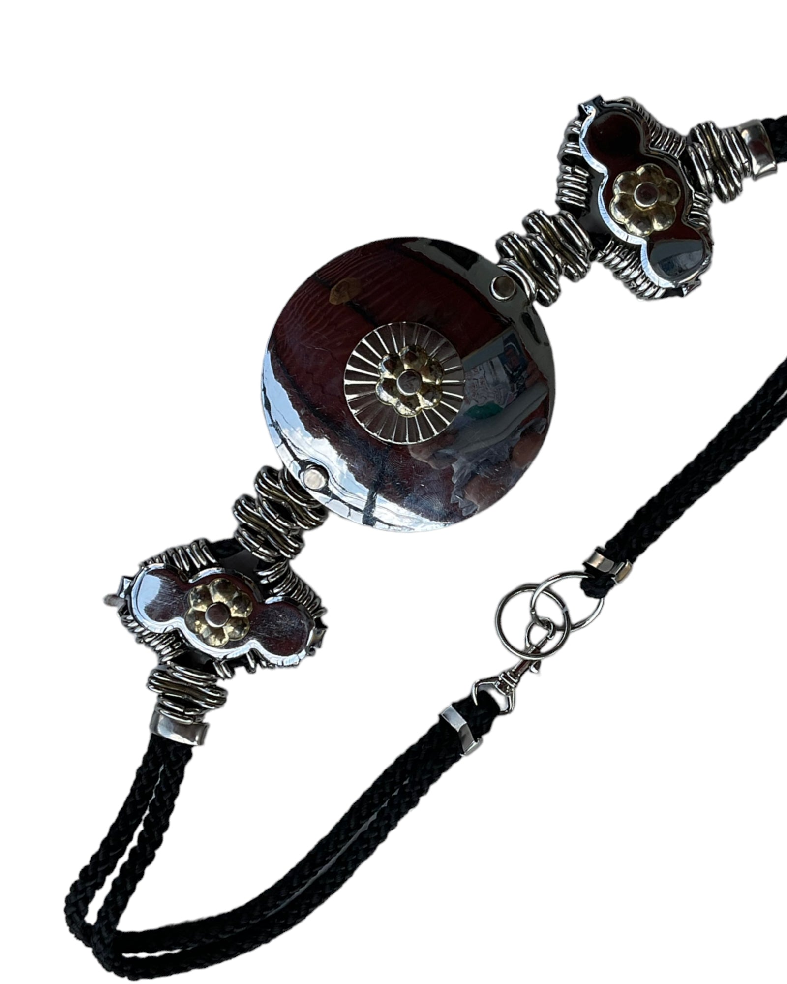 CINTURON NEGRO BORDADO CON DETALLES DE METAL PLATEADOS Y HEBILLA CIRCULAR EN EL MEDIO. SIN DETALLES DE USO.