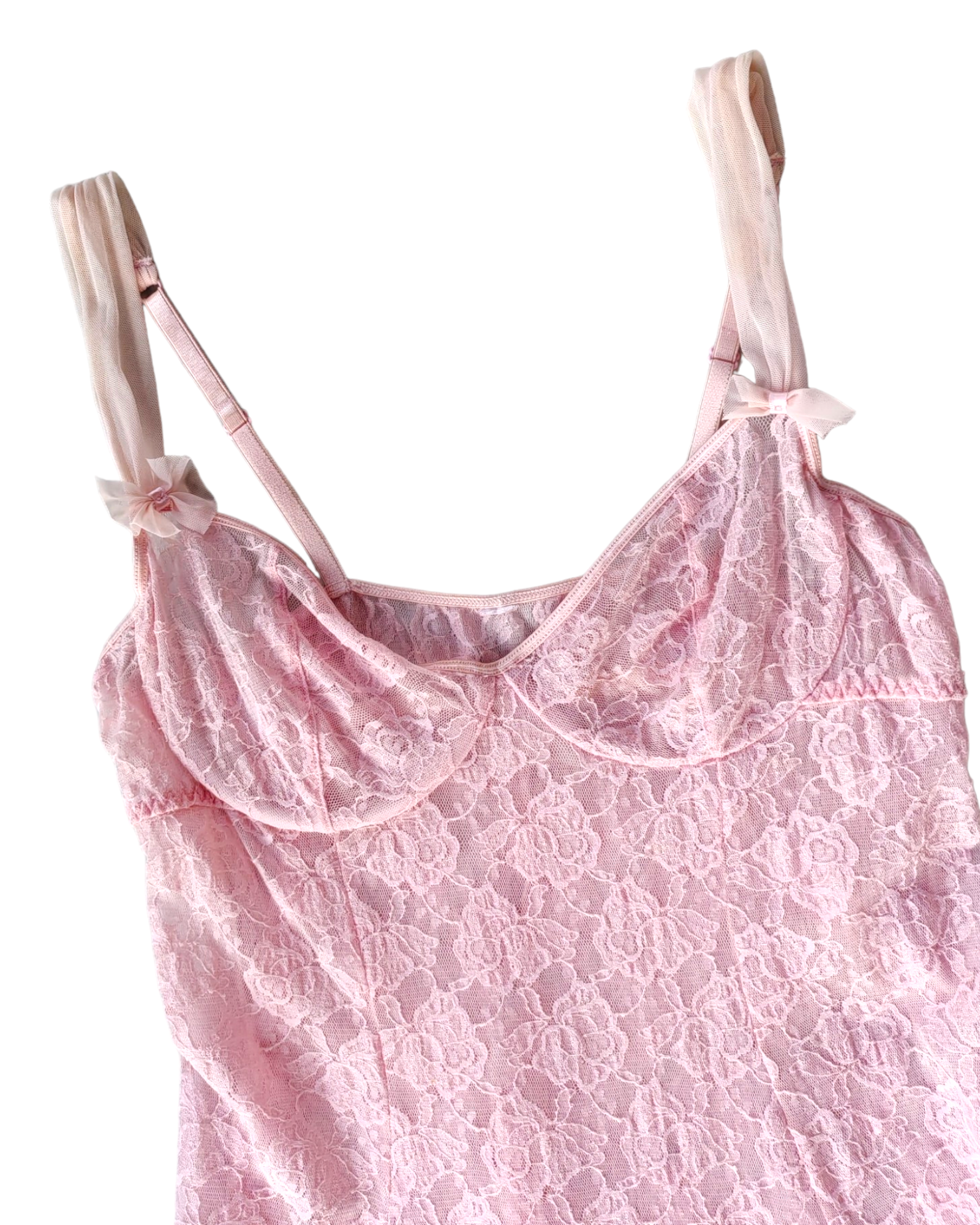 VESTIDO ROSA DE ENCAJE LENCERO. TIRANTES AJUSTABLES Y CON LISTON POR LA PARTE DELANTERA. ESTIRA. NO TIENE FORRO. SIN DETALLES DE USO.
