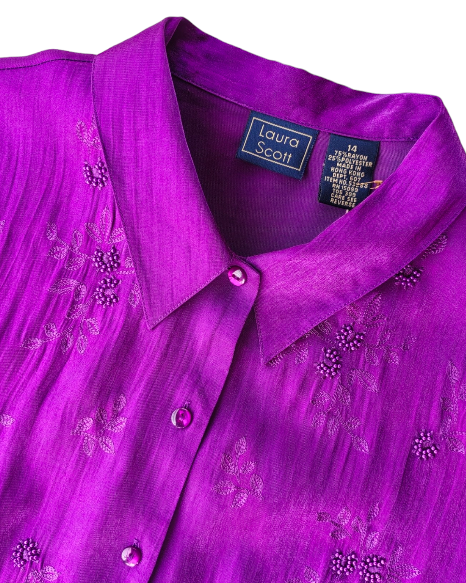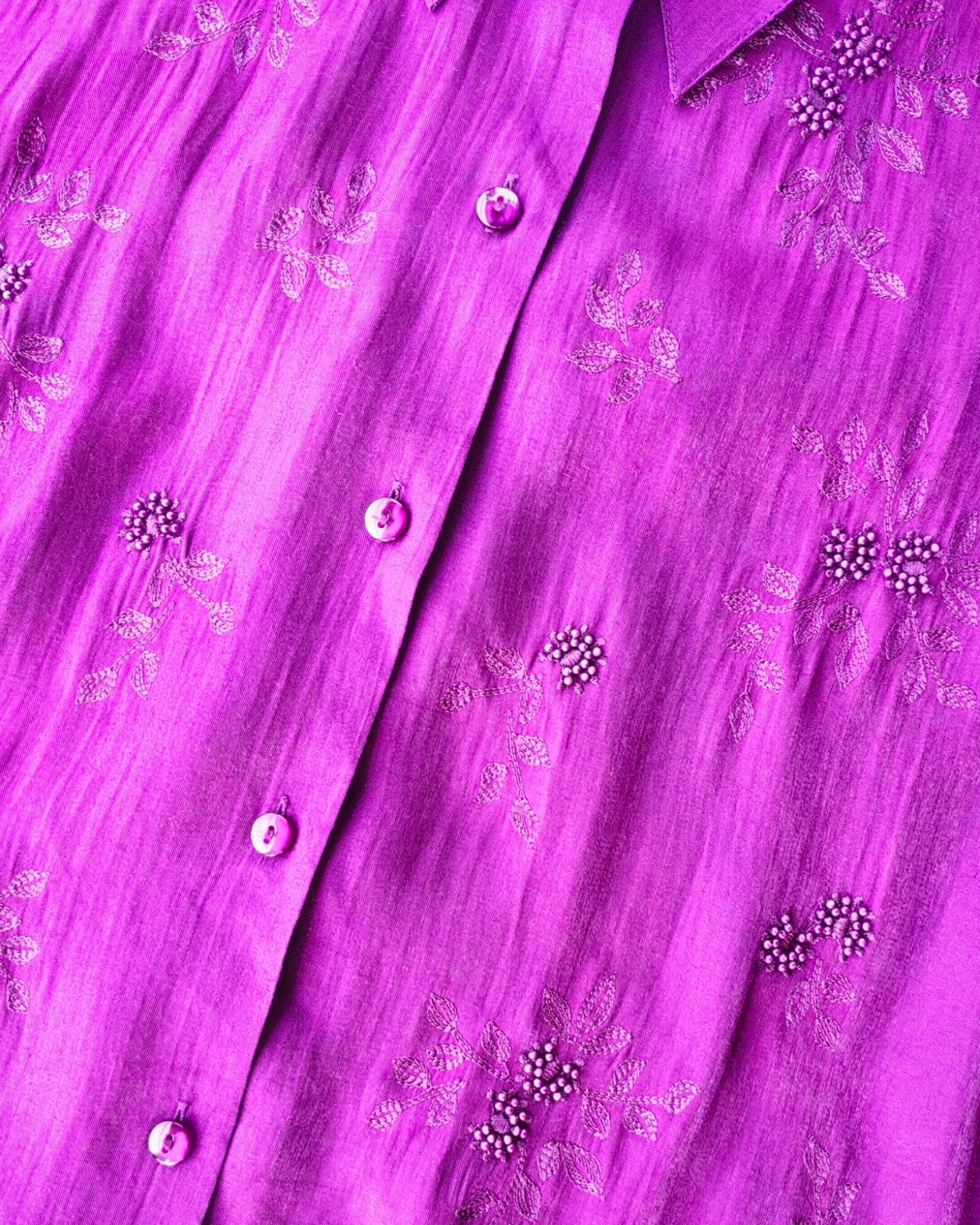 BLUSA MANGA LARGA 75% RAYÓN 25% POLIESTER DE COLOR MAGENTA CON DETALLES DE FLORES BORDADOS EN RELIEVE Y CUENTAS MAGENTAS. SIN DETALLES DE USO.