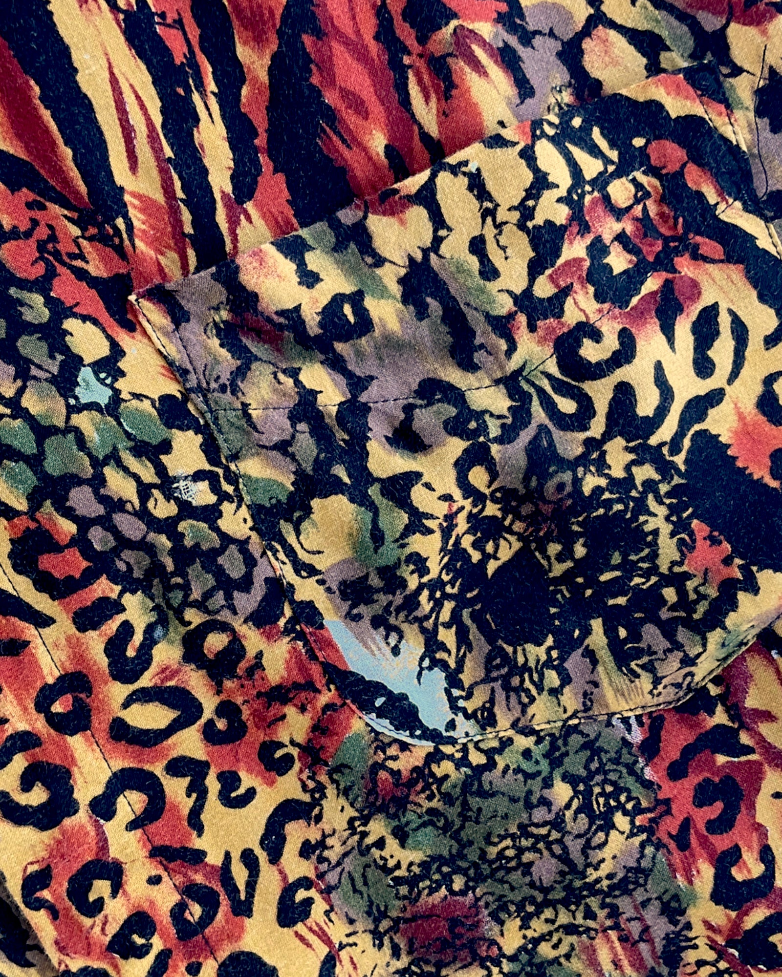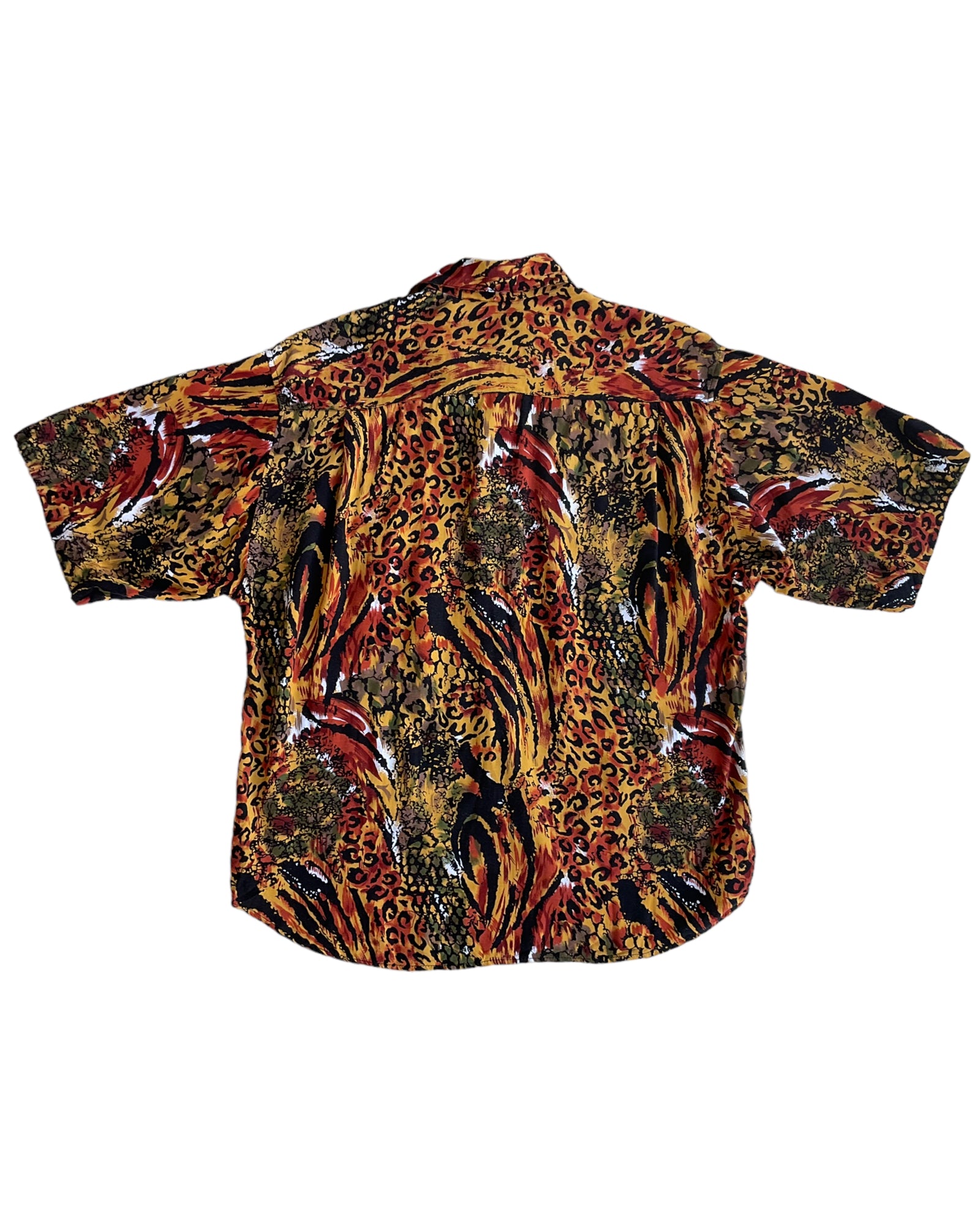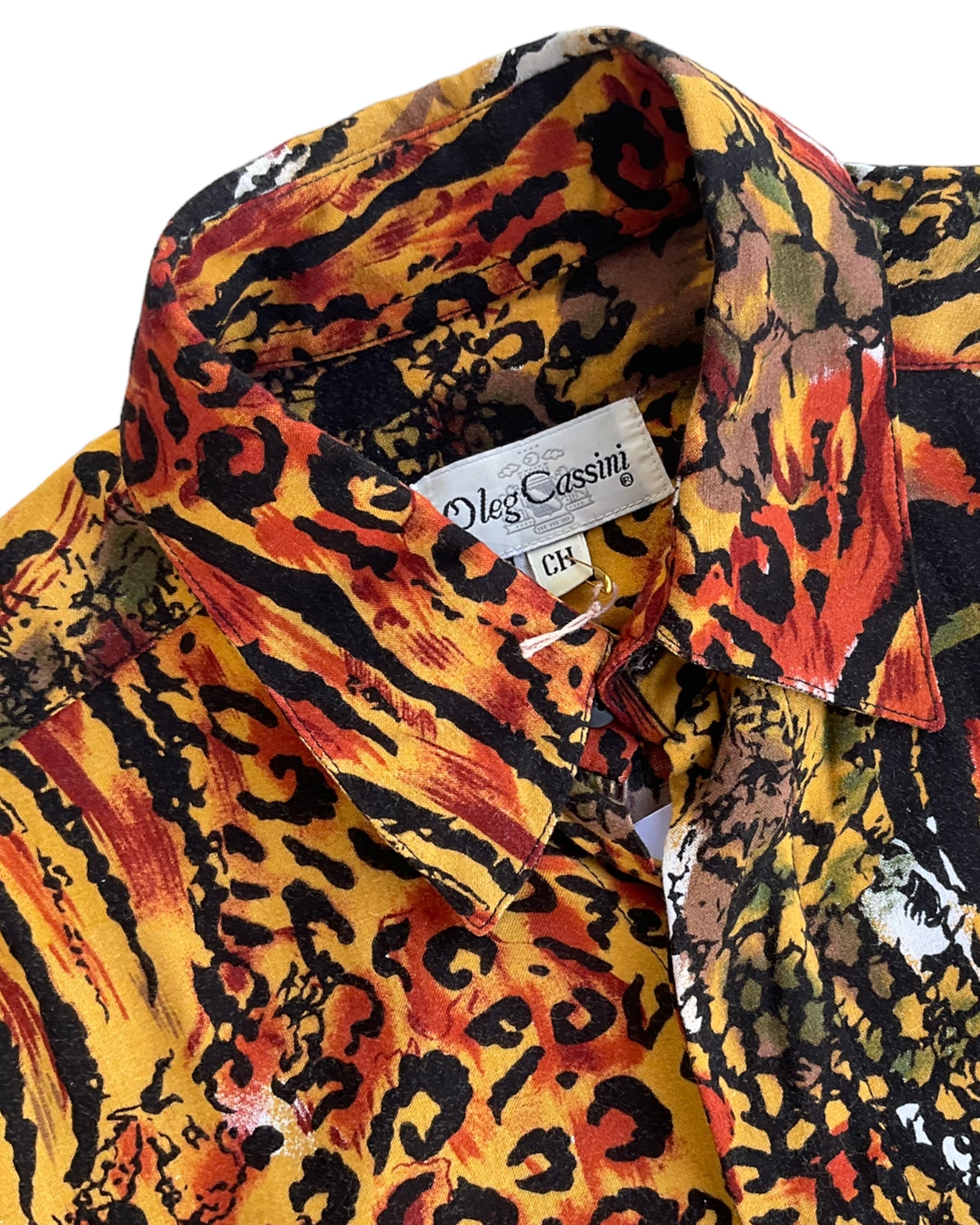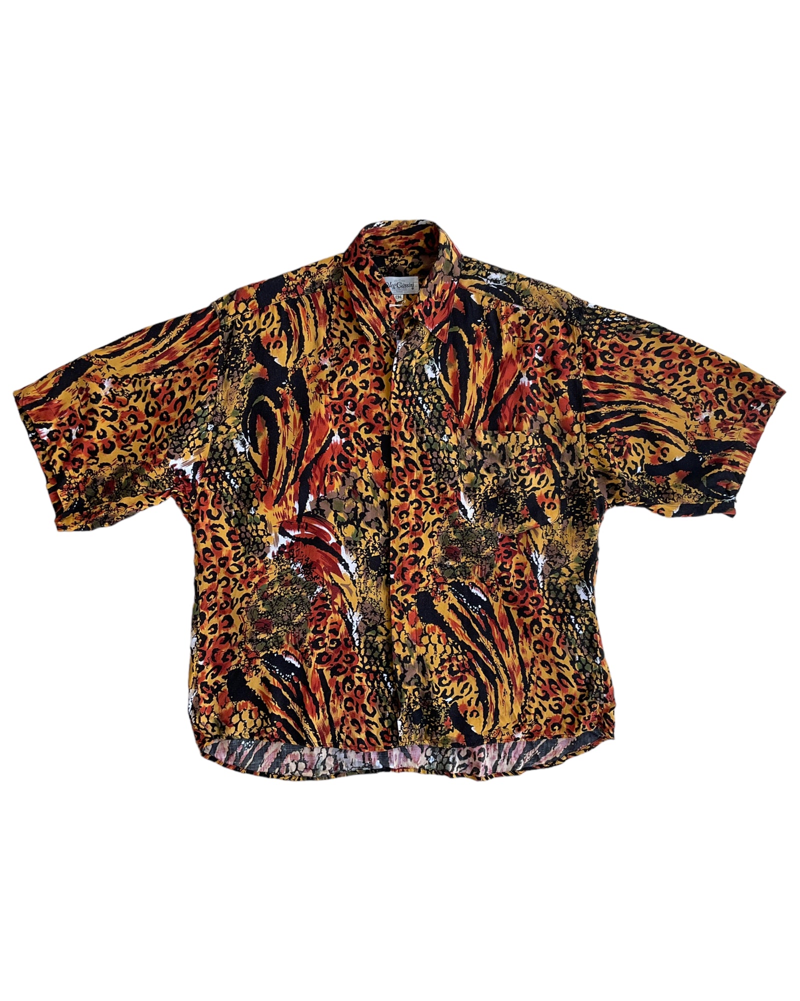 CAMISA DE BOTONES OLEG CASSINI CON ANIMAL PRINT DE LEOPARDO, CEBRA Y SERPIENTE, EN COLORES LADRILLO, VERDE Y AMARILLO. BOLSILLO FRONTAL. SIN DETALLES DE USO