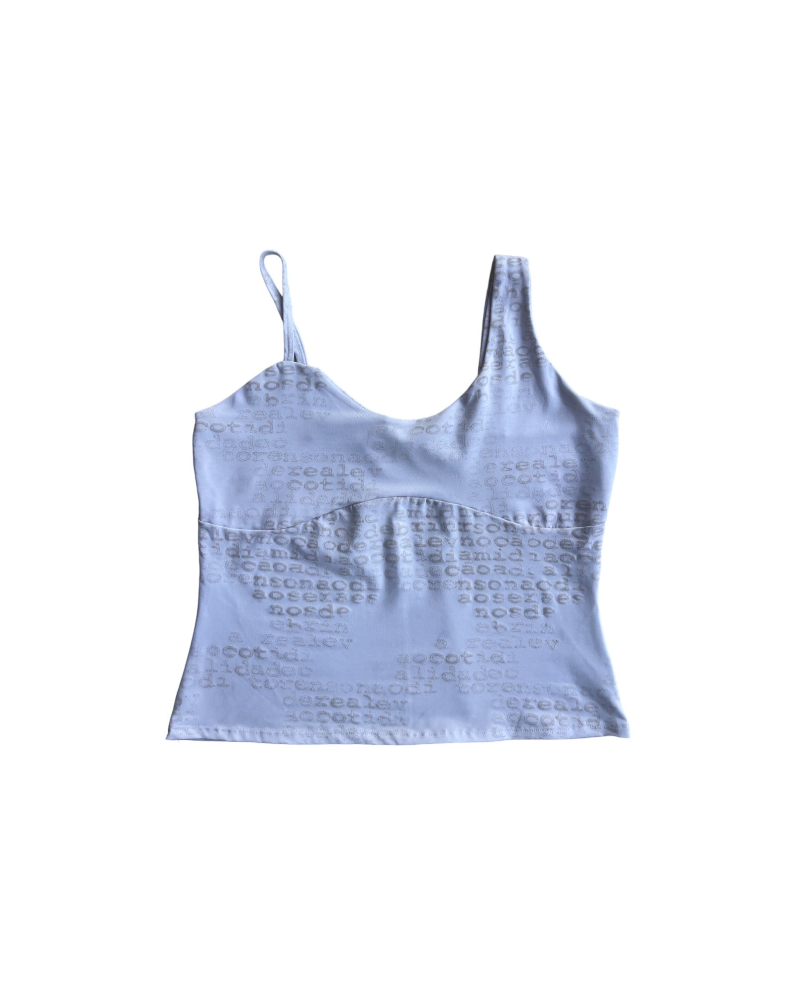 TOP BLANCO CON UN TIRANTE DELGADO Y OTRO GRUESO. PRINT DE PALABRAS POR TODO EL TOP. DETALLE SE SUJETADOR EN LA PARTE DEL BUSTO. 88% POLIAMIDA Y 12% ELASTANO. SIN DETALLES DE USO