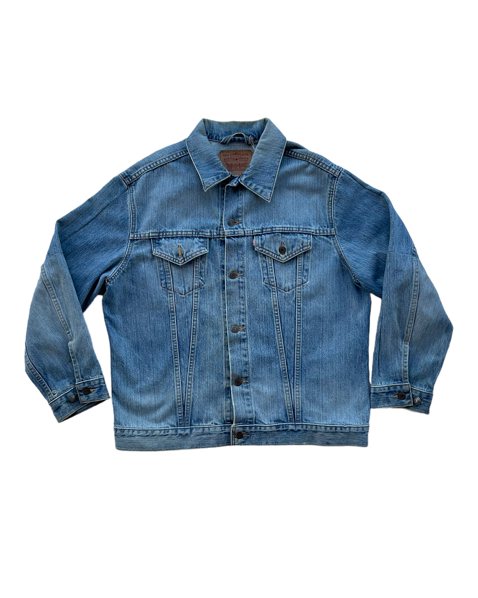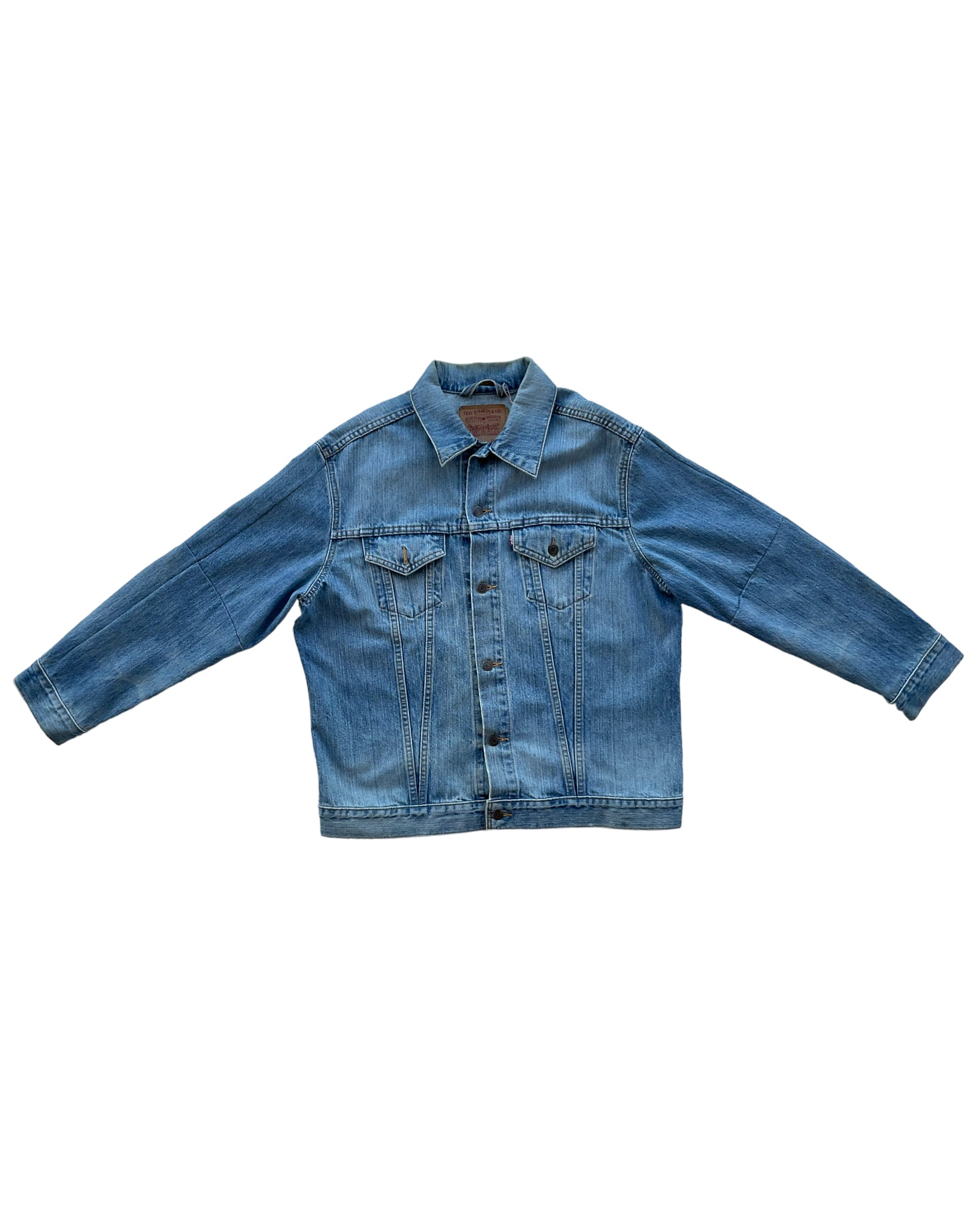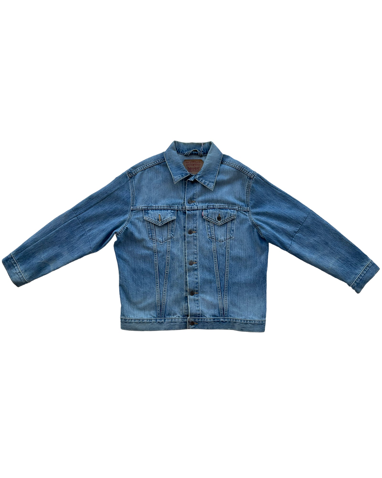 CHAMARRA DE MEZCLILLA COLOR AZUL CLARO. MANGAS CUSTOM MADE, DOS BOLSILLOS FRONTALES. LIGERO DESGASTE POR ANTIGÜEDAD.