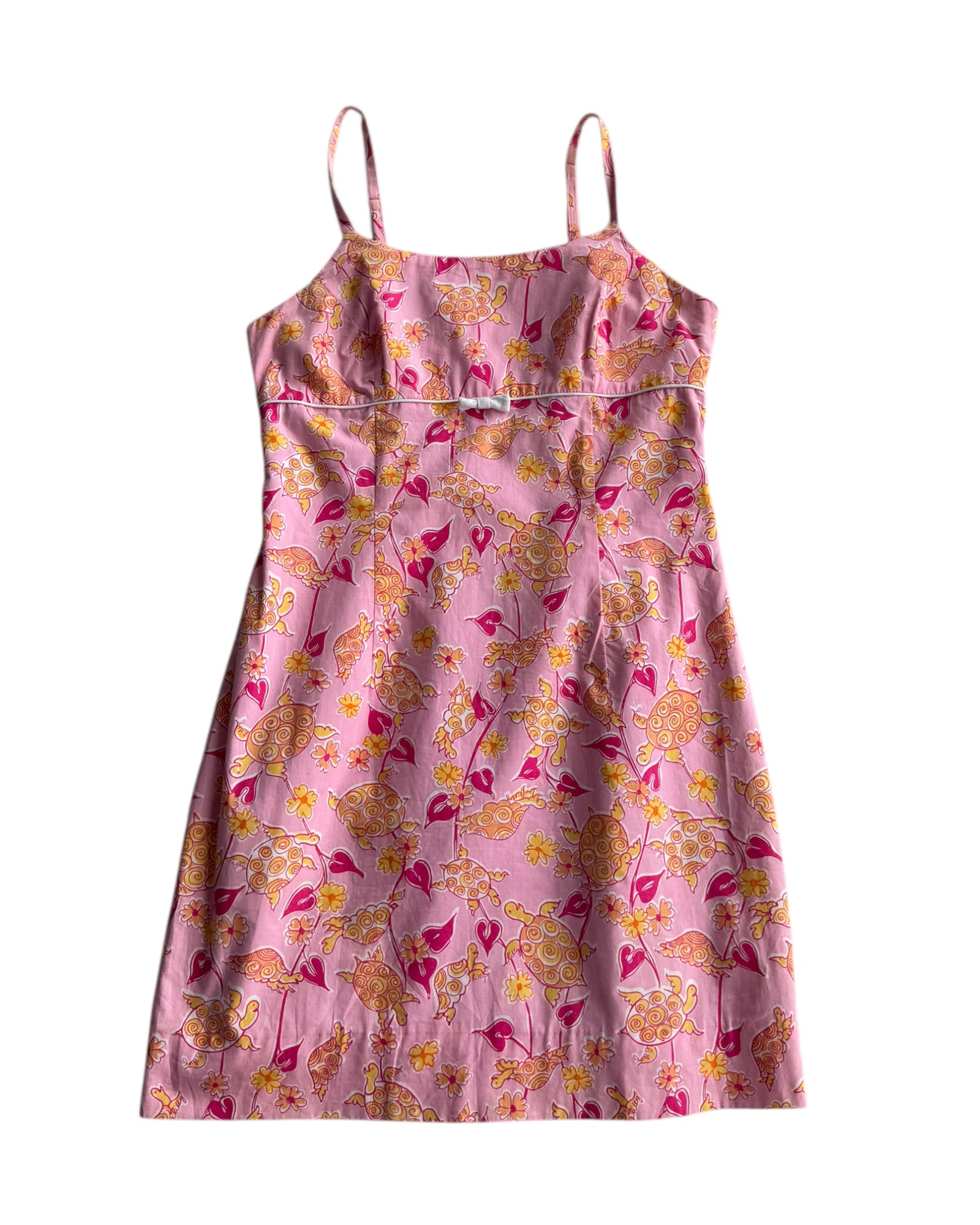 VESTIDO LILLY PULLITZET DE TIRANTES COLOR ROSA, ESTAMPADO DE TORTUGAS FELICES COLOR AMARILLO Y CORAZONES EN TELA 100% ALGODON, FORRO 35% ALGODON 65% POLIESTER