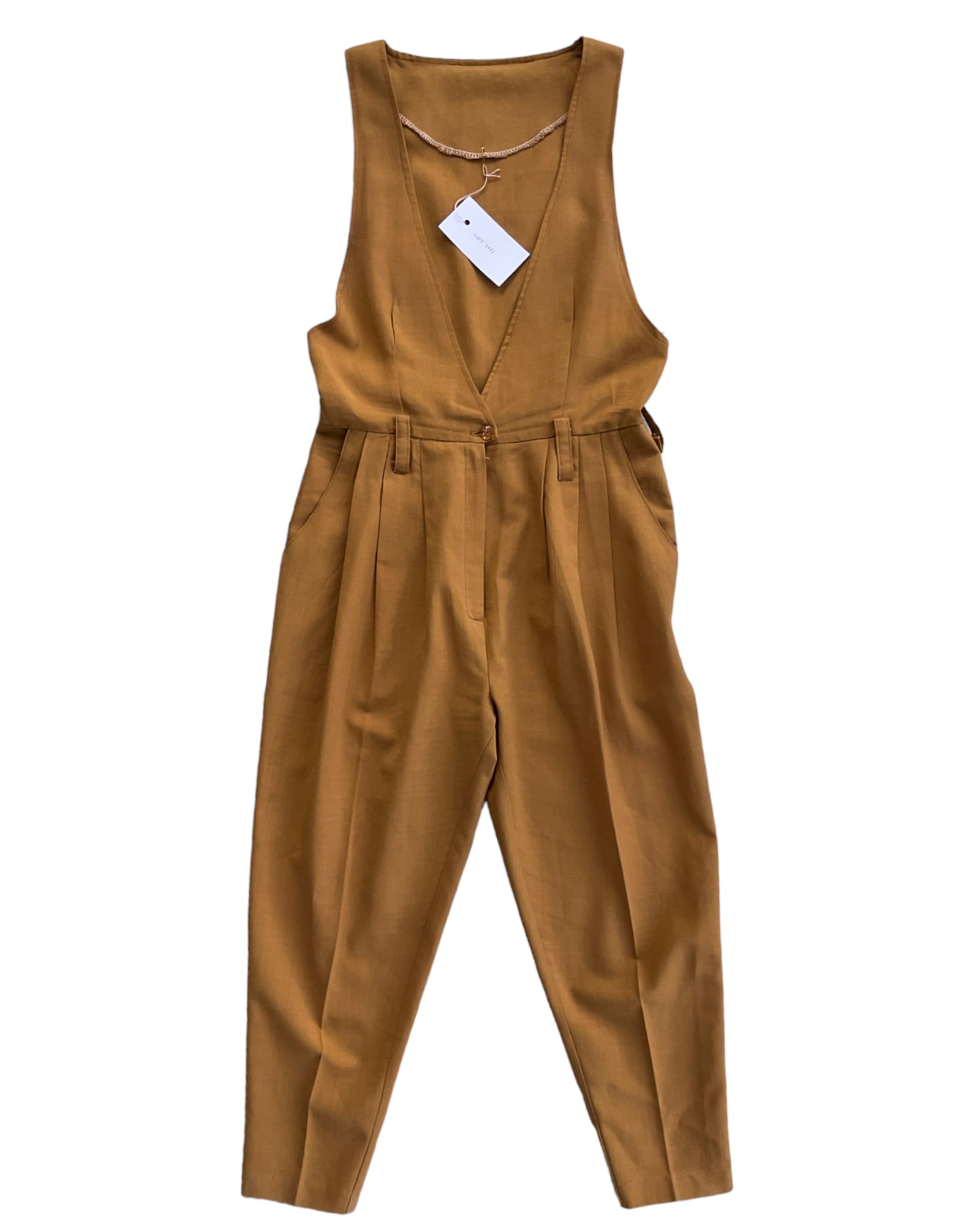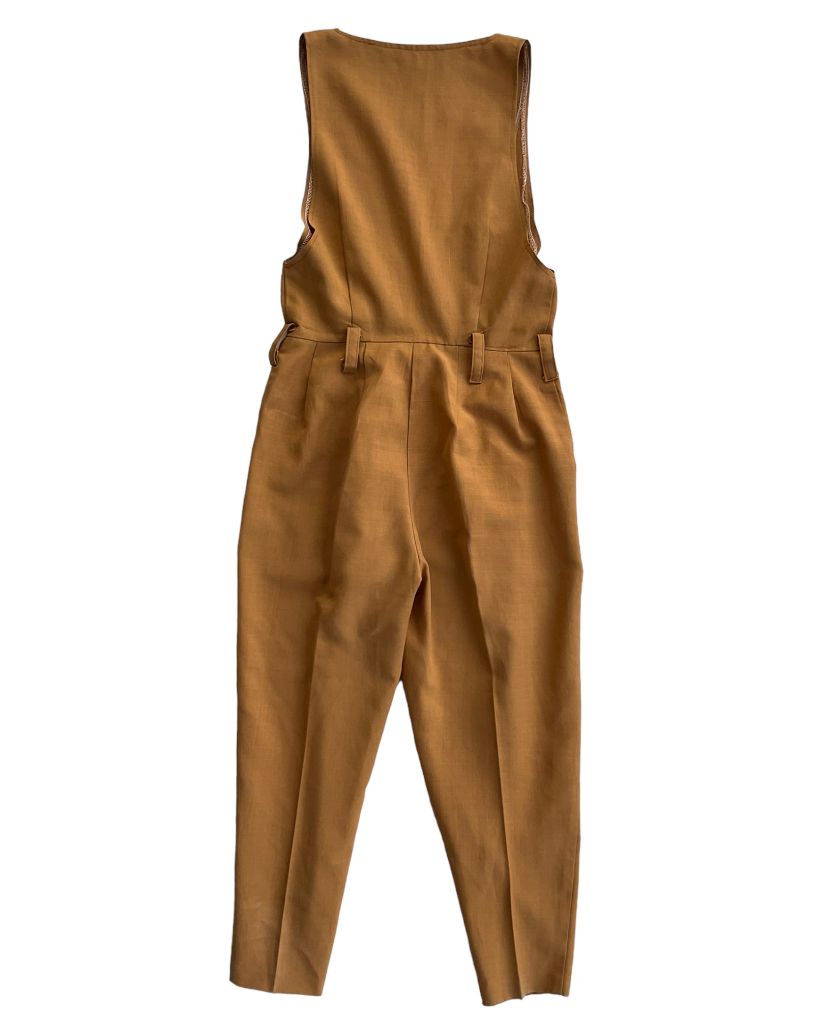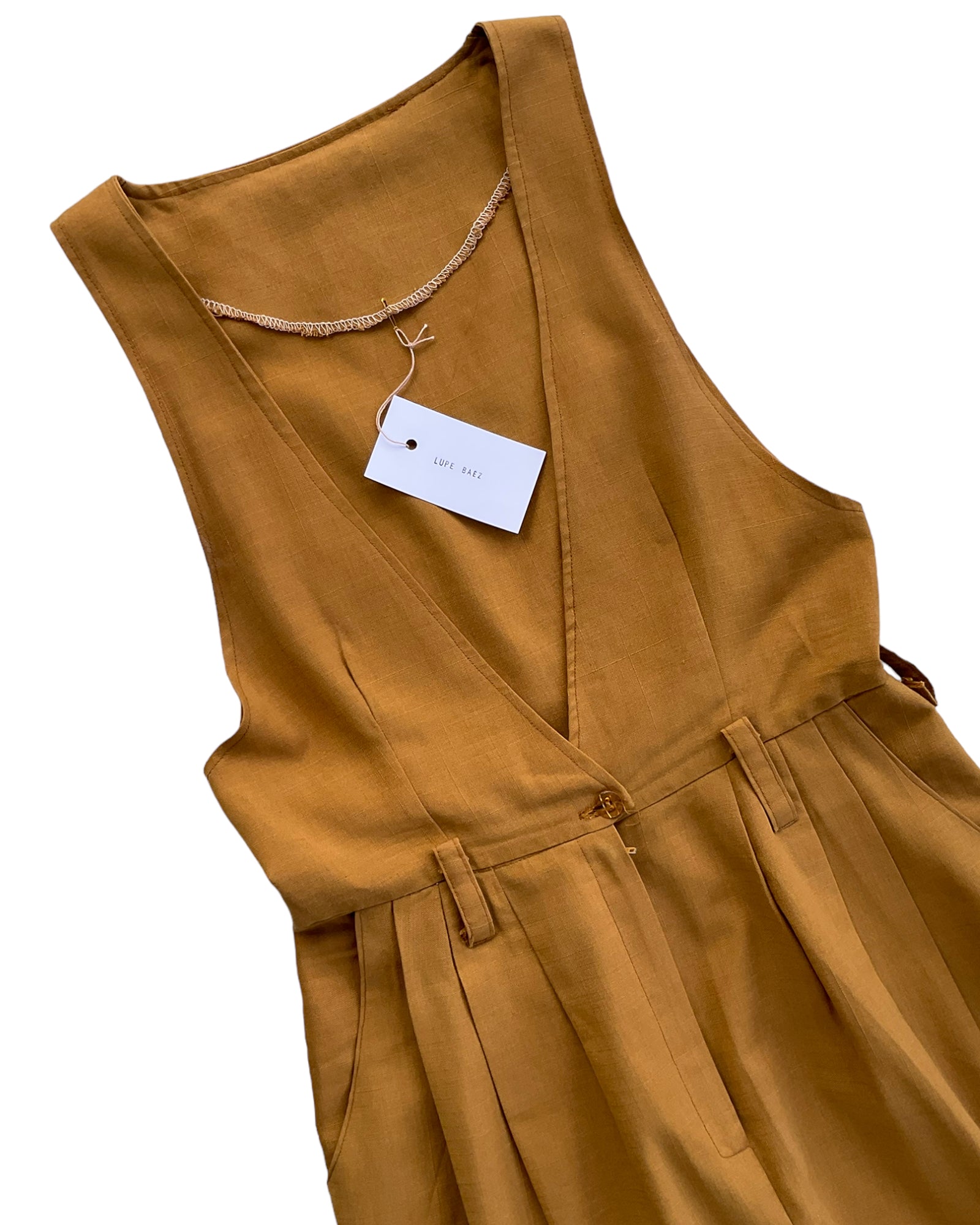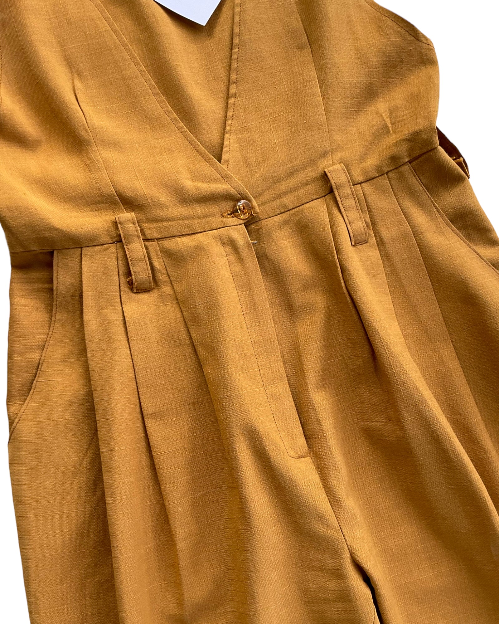 JUMPER SIN MANGAS CON ESCOTE V DE COLOR AMARILLO MOSTAZA, CIERRE Y BOTÓN FRONTAL, DOS BOLSILLOS, CON TRABILLAS PARA CINTURÓN. SIN DETALLES DE USO.