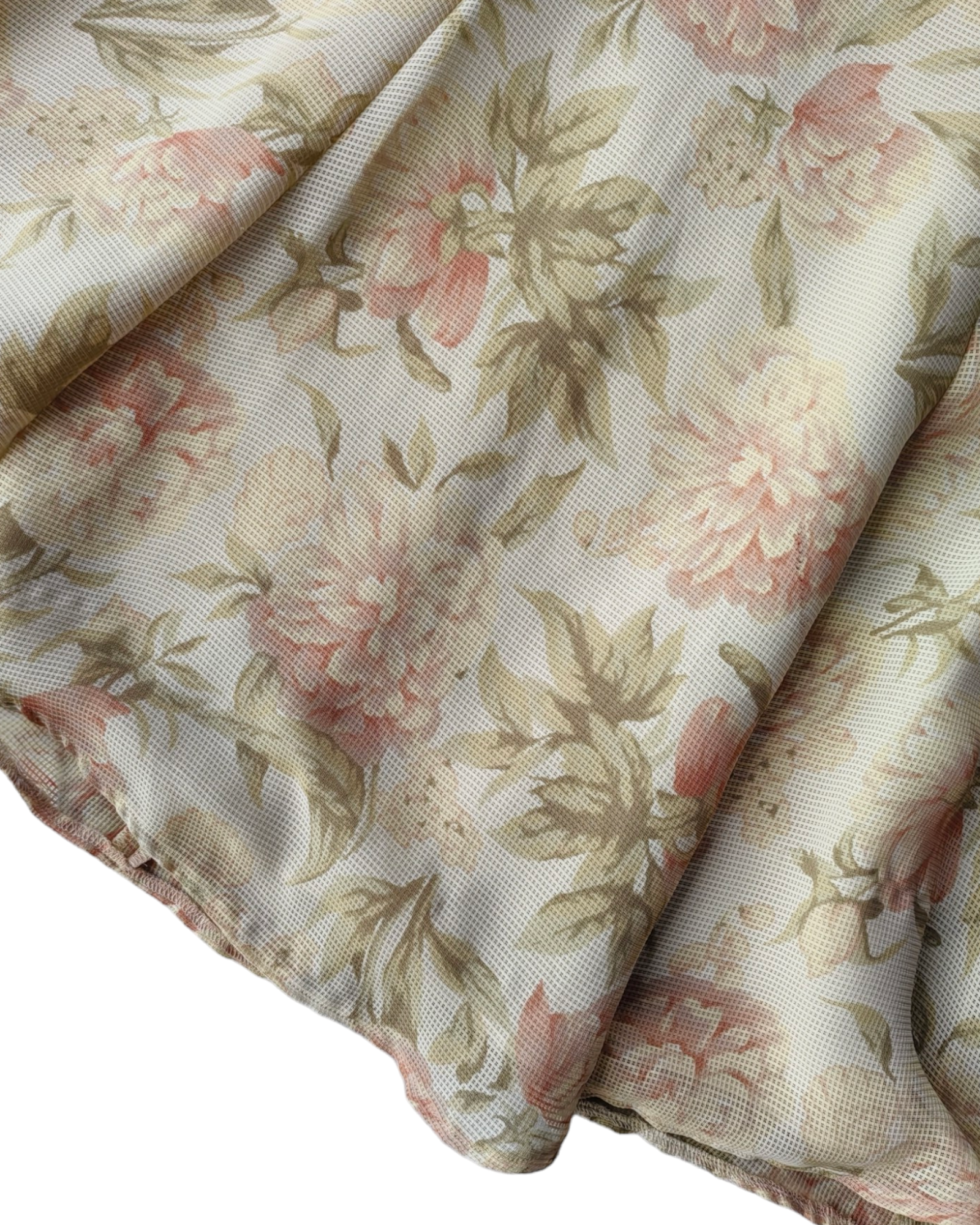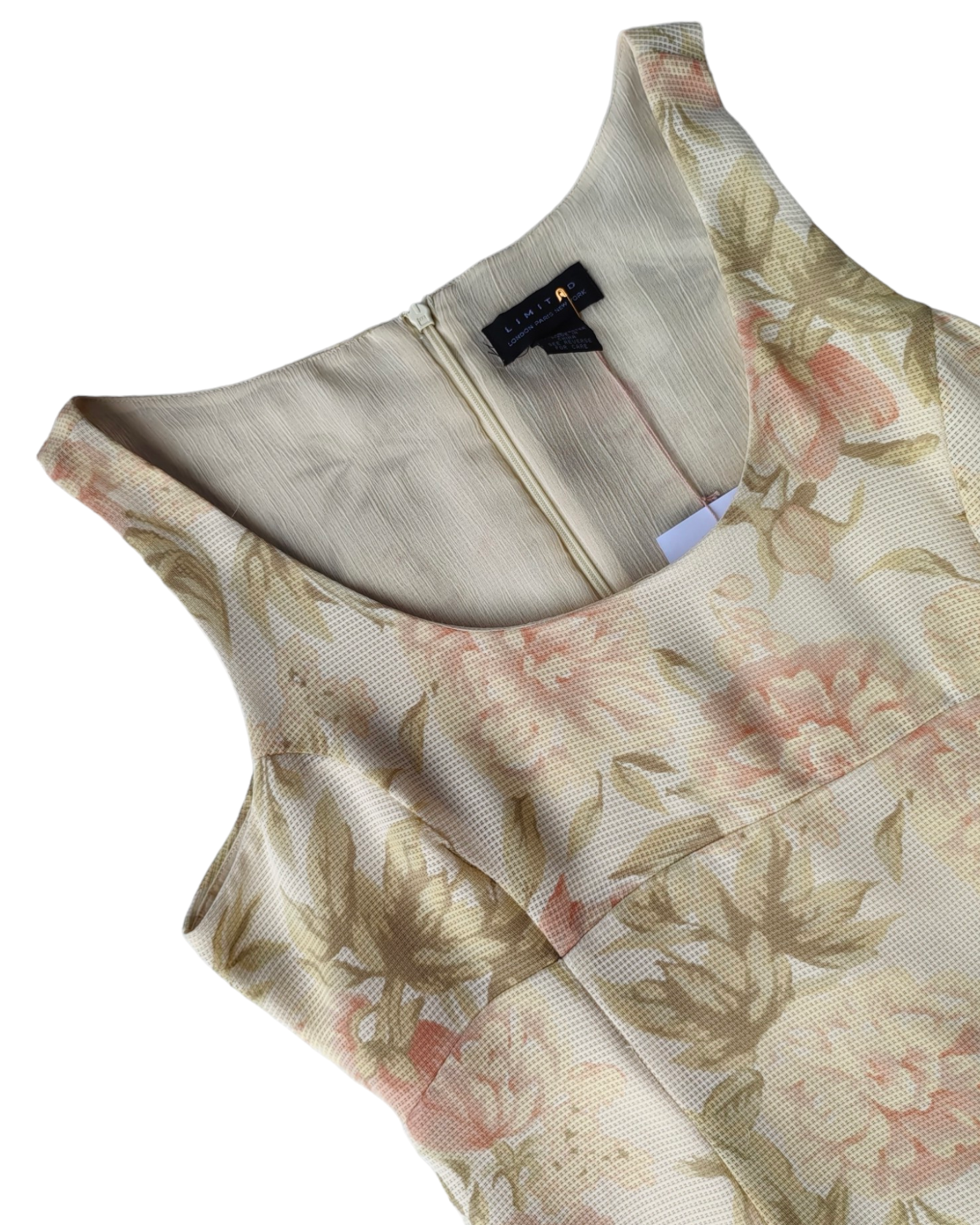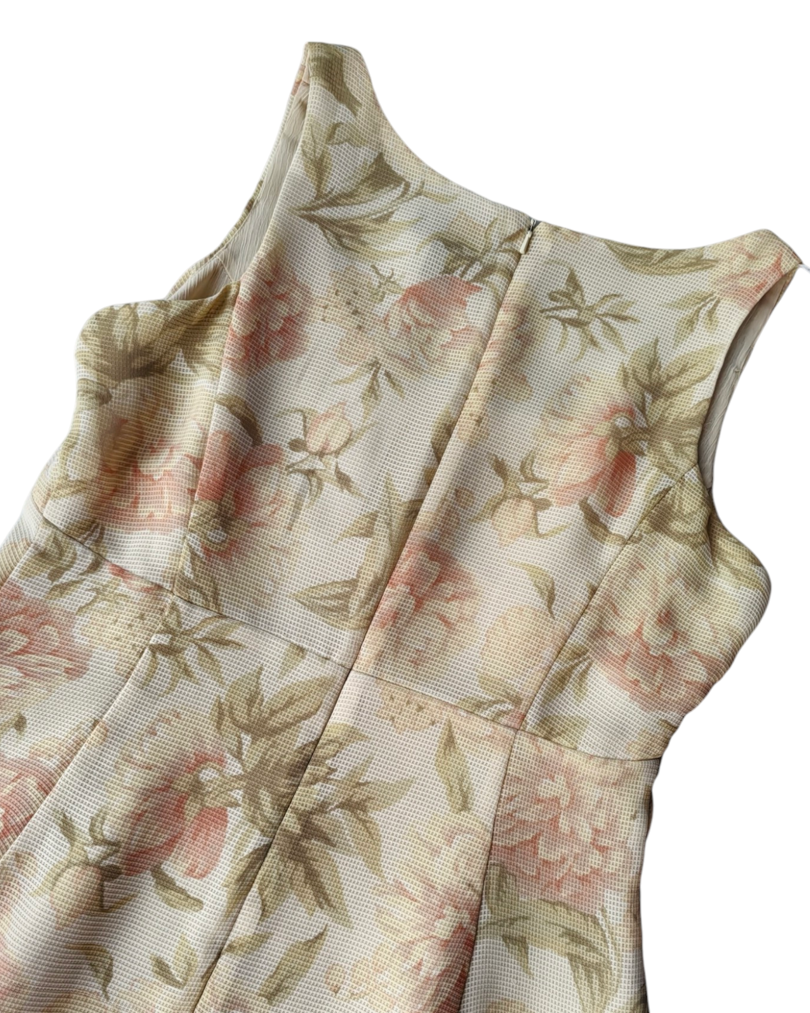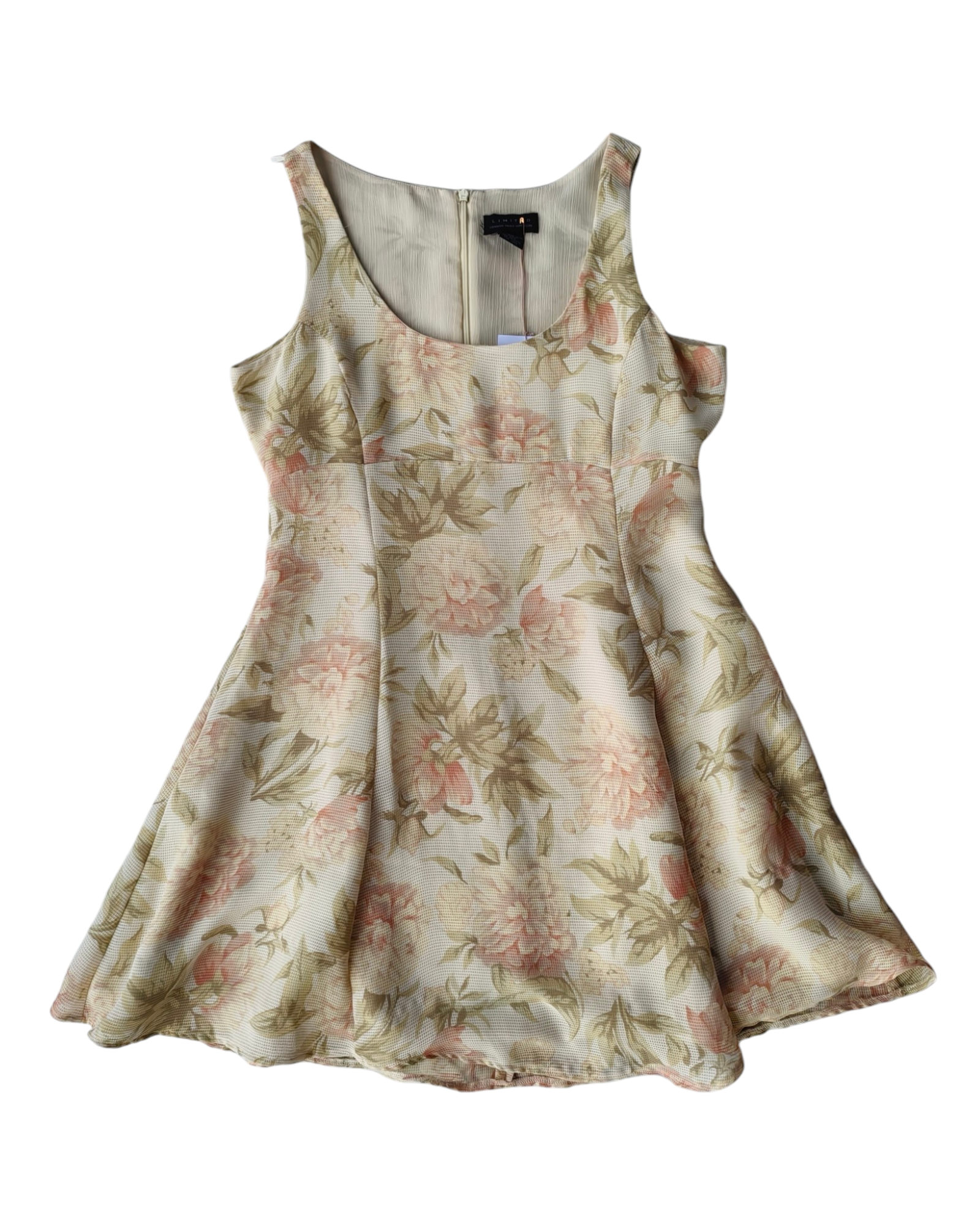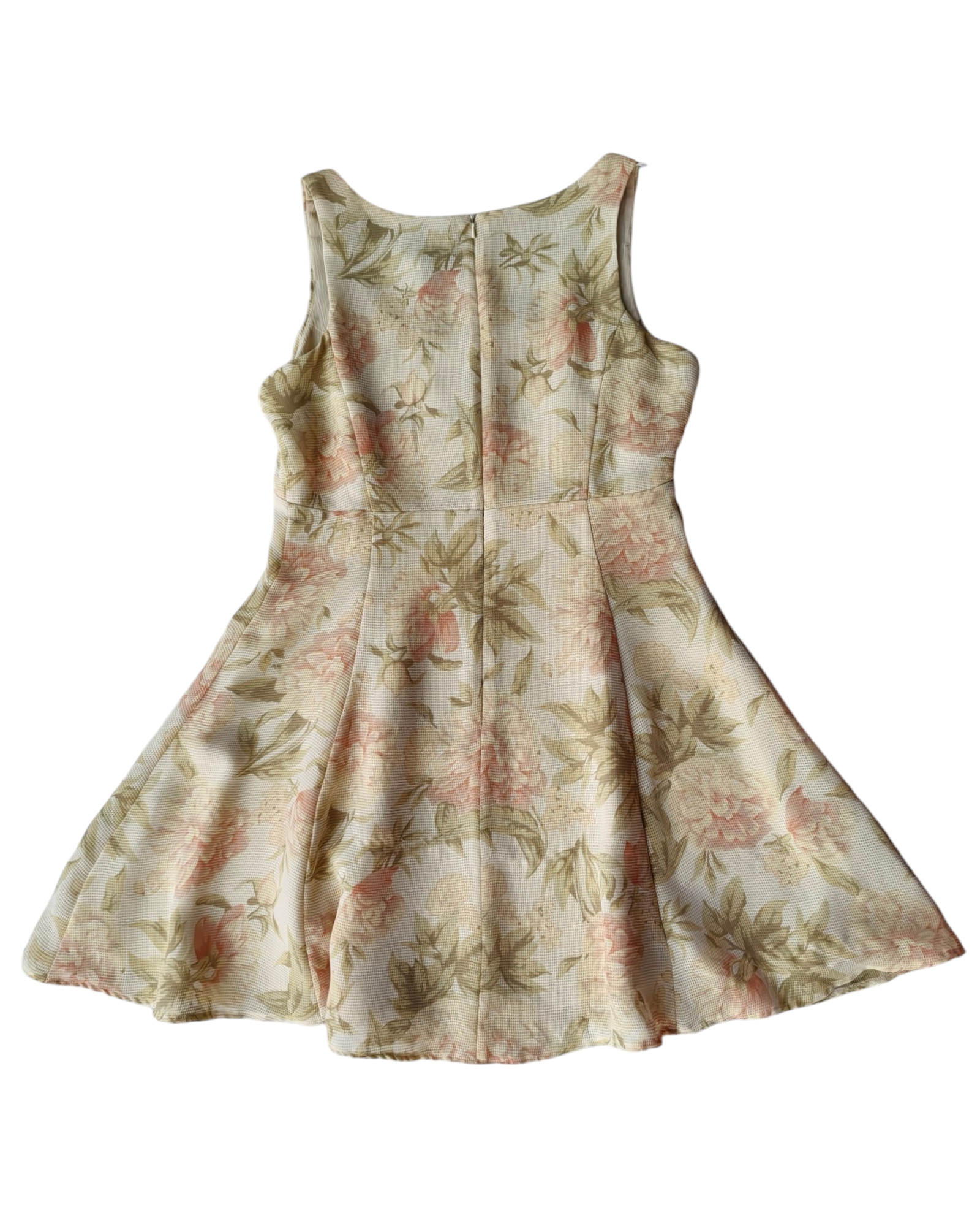 VESTIDO SIN MANGAS 100% POLIÉSTER COLOR BLANCO CON FLORES ESTAMPADAS DE COLOR ROSA Y VERDE CLARO, CIERRE TRASERO. SIN DETALLES DE USO.