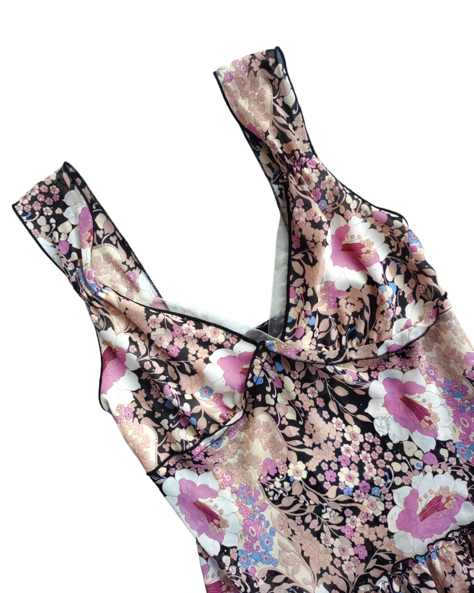 BLUSA 100% POLIÉSTER COLOR NEGRO CON DETALLES DE BRILLOS Y FLORES EN VARIOS TONOS DE ROSA Y AZUL. ESCOTE EN V. DETALLE DE MAYA BRILLANTE EN EL ESCOTE. MINI MANGAS DE TIRANTES GRUESOS. ELÁSTICO EN LA ESPALDA. HOLANES EN LA PARTE INFERIOR. SIN DETALLES DE USO.