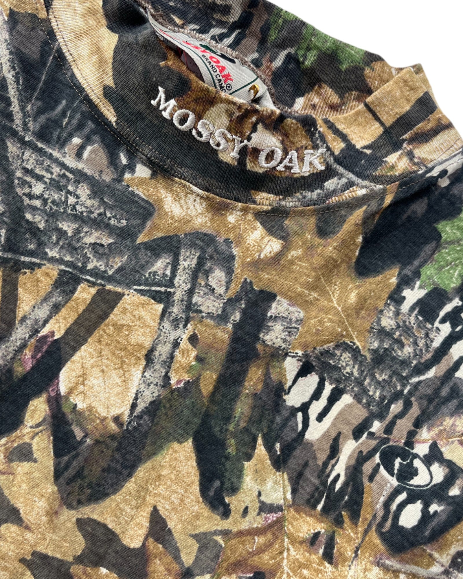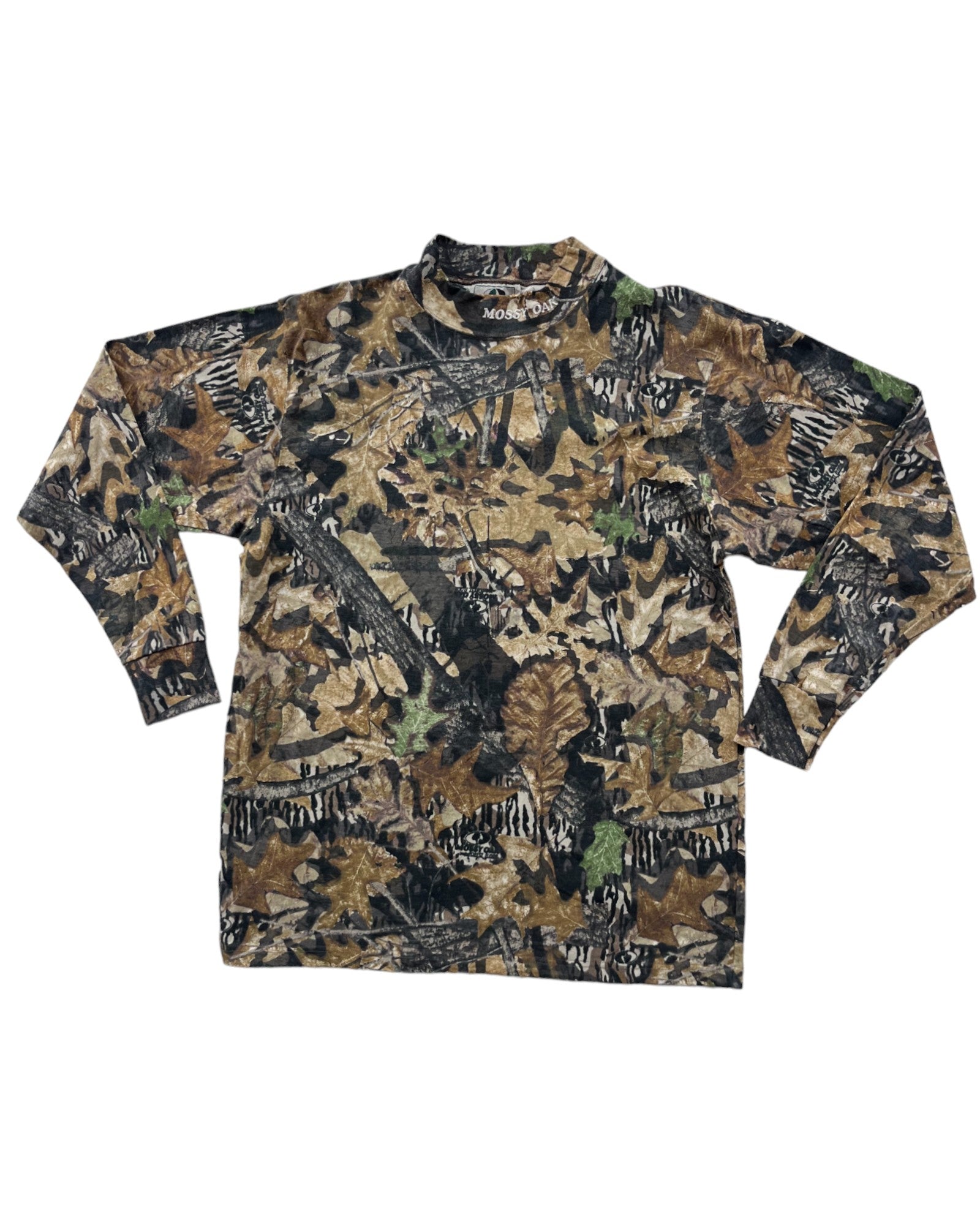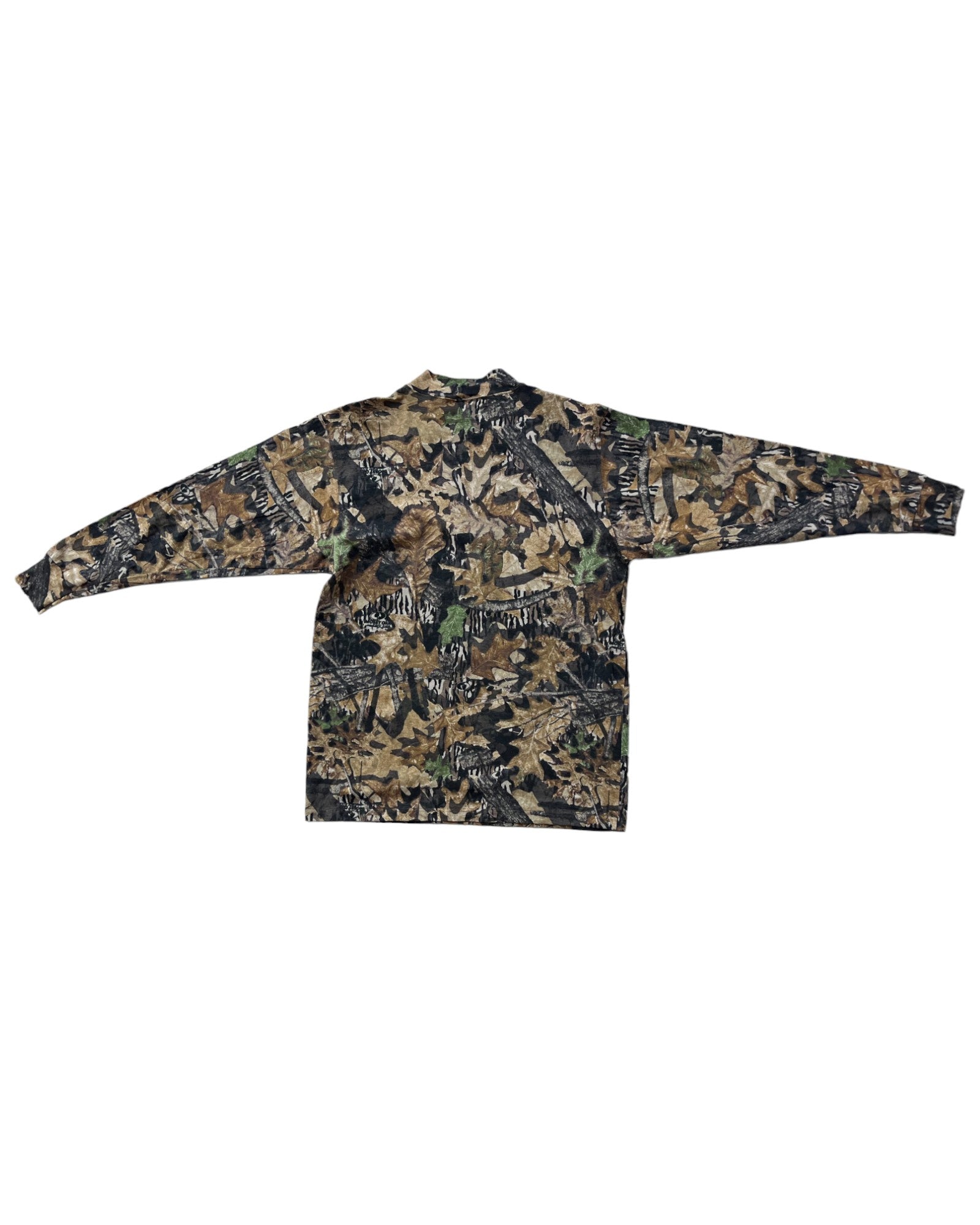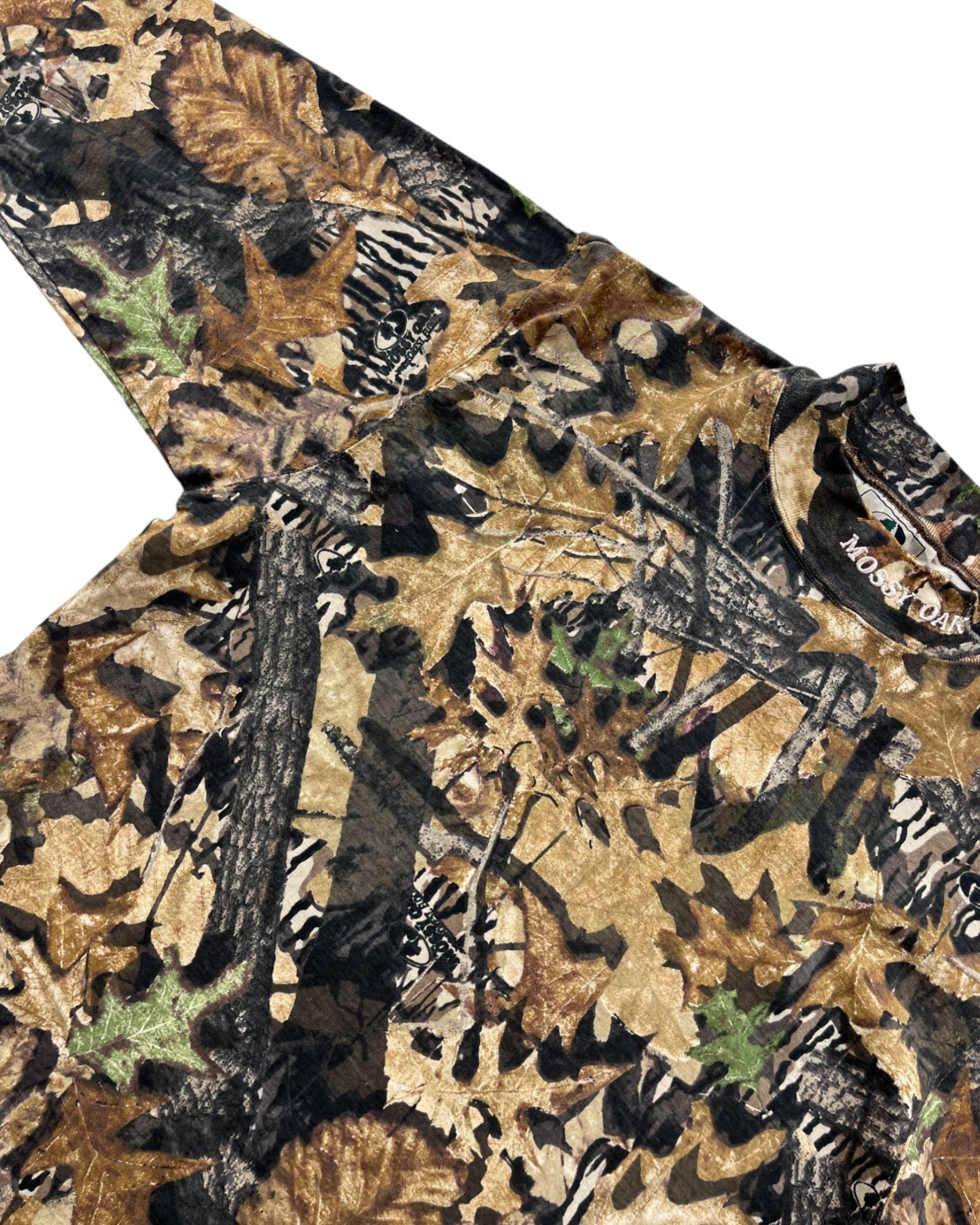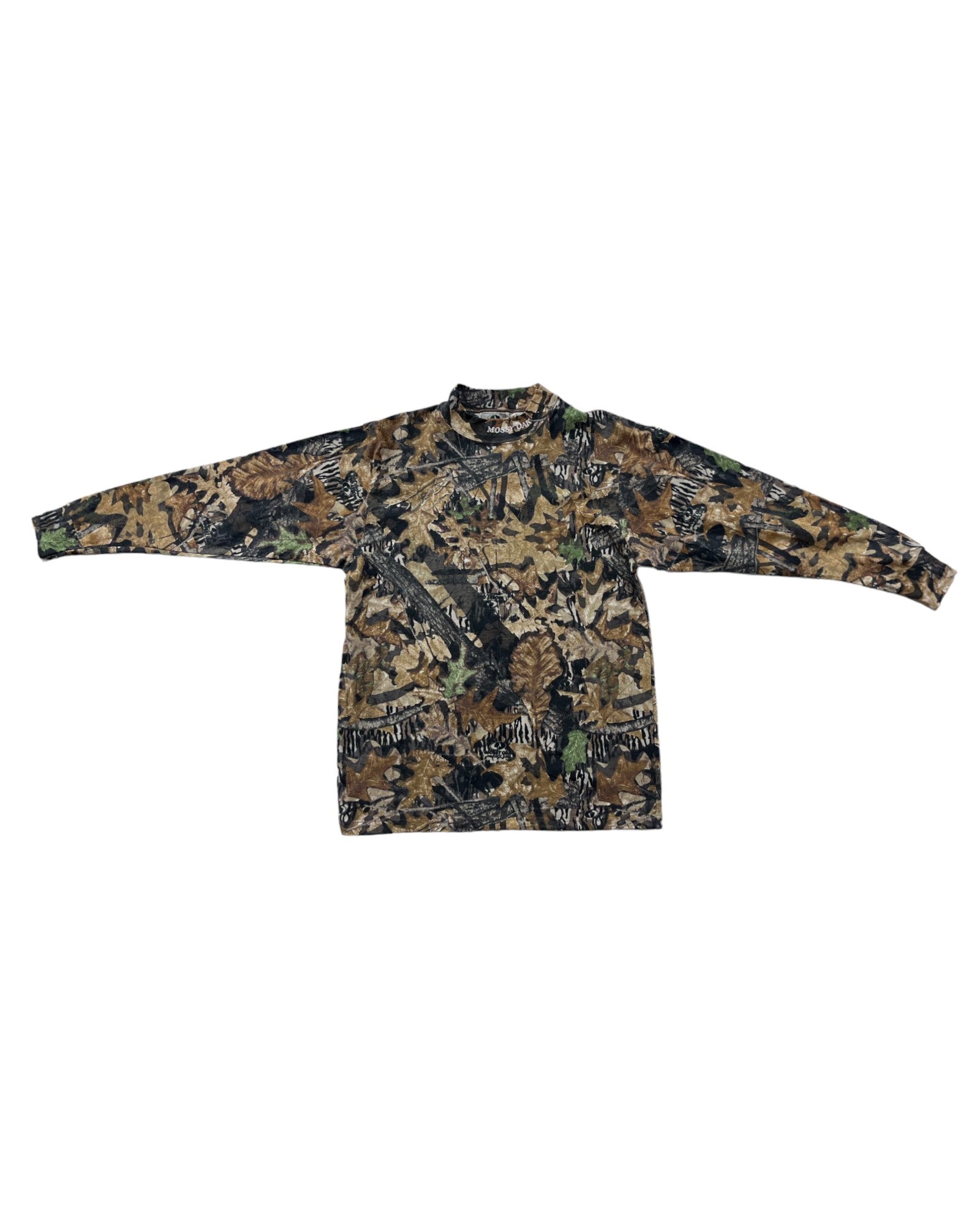 PLAYERA MANGA LARGA 100% ALGODÓN CON ESTAMPADO DE HOJAS EN DIVERSOS TONOS DE VERDE. "MOSSY OAK" BORDADO EN EL CUELLO. SIN DETALLES DE USO.