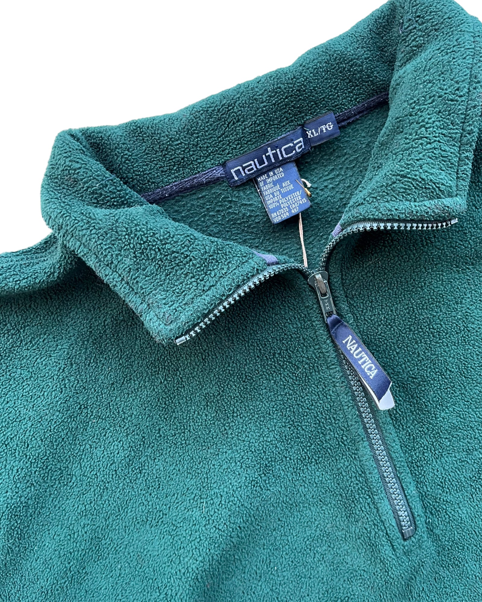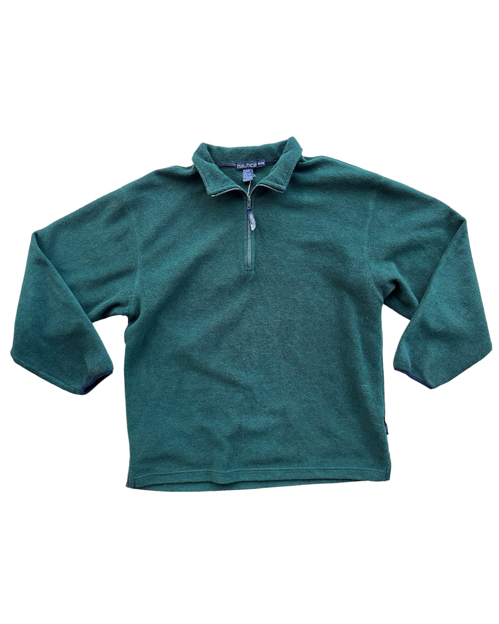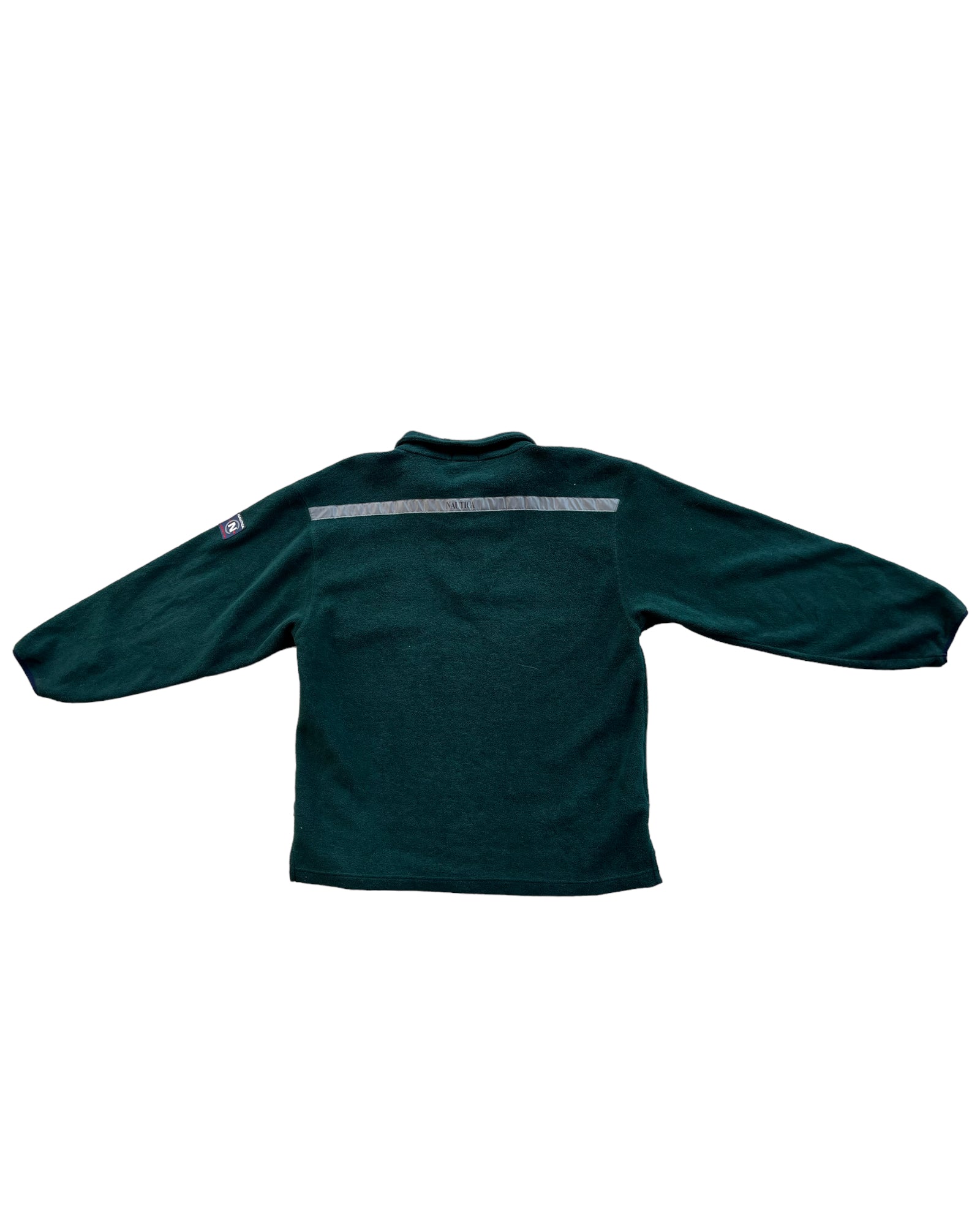 SUDADERA VERDE BOTELLA CON CIERRE EN EL CUELLO, LOGO EN LA MANGA LATERAL Y EN LA ESPALDA. TELA TIPO PELUCHE. 100% POLIÉSTER