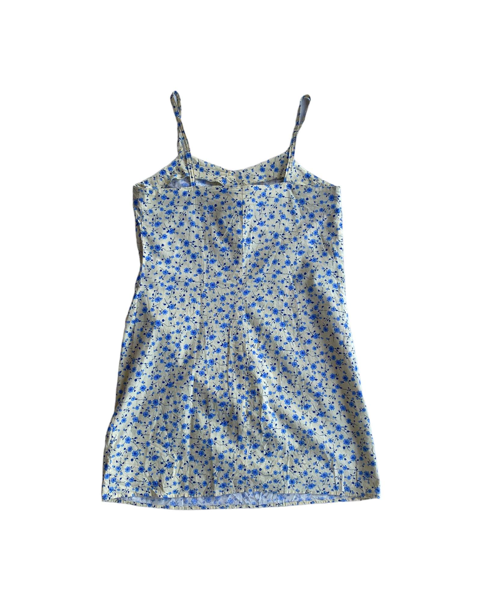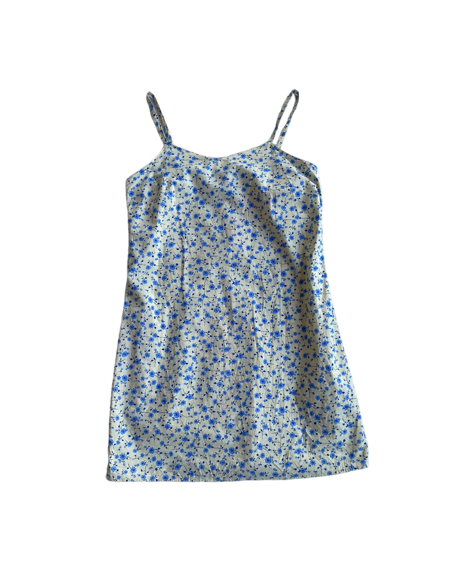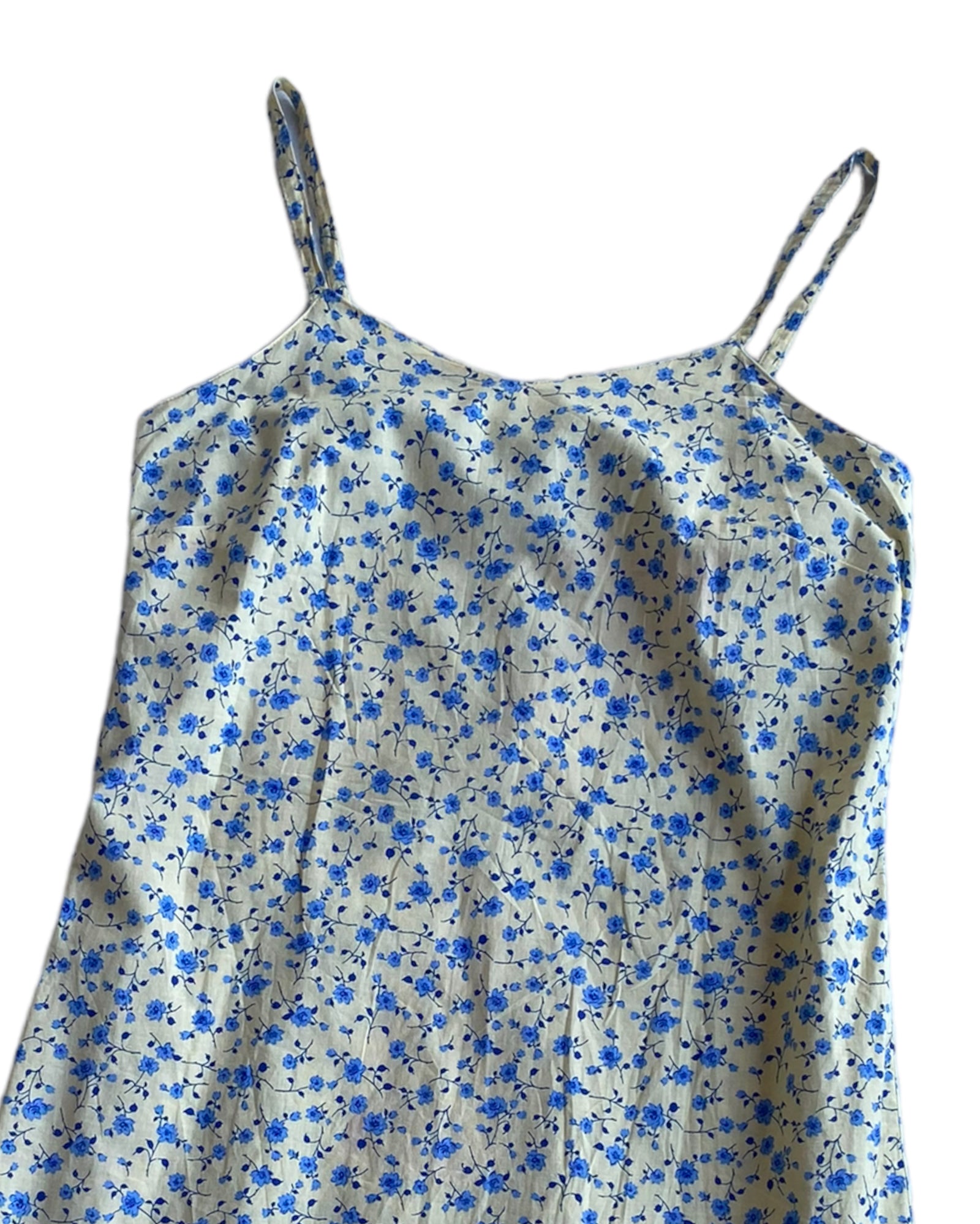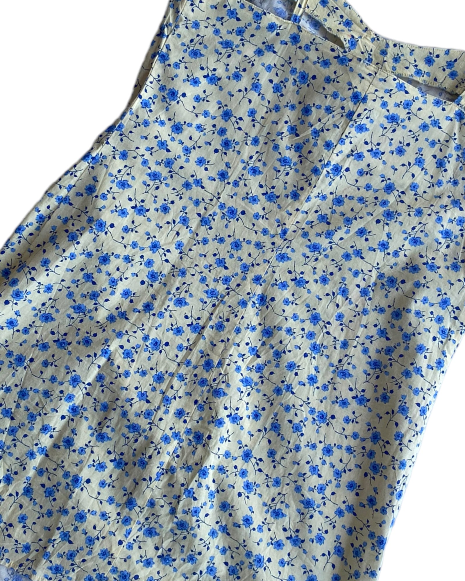 VESTIDO DE TIRANTES 100% ALGODÓN EN COLOR AMARILLO CON PATRÓN DE FLORES AZULES. SIN DETALLES DE USO.