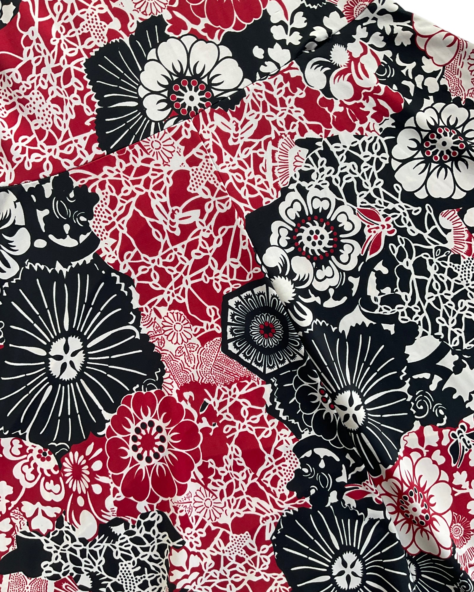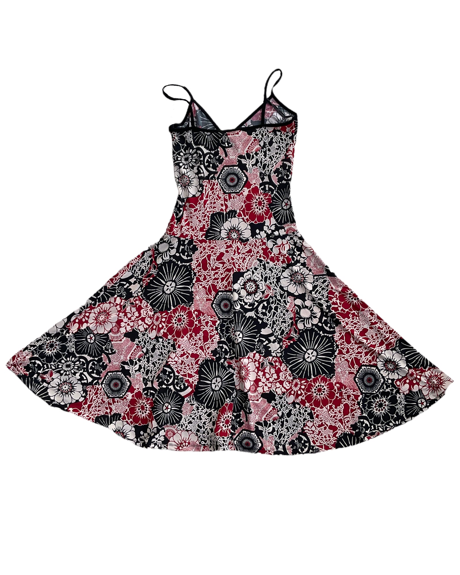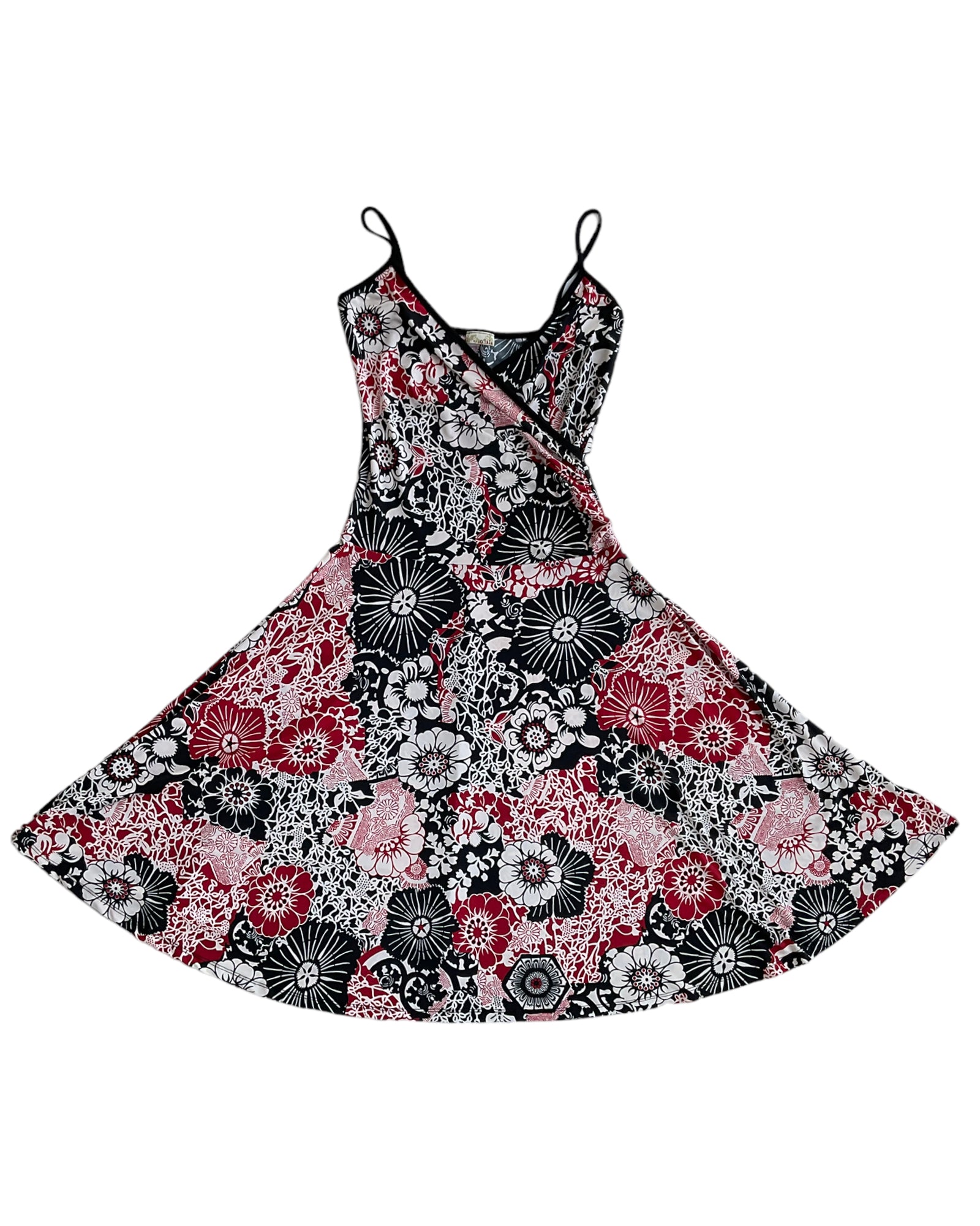 VESTIDO DE TIRANTES CON ESCOTE CRUZADO, COLOR NEGRO CON PATRÓN DE FLORES EN COLORES BLANCO Y ROJO. SIN DETALLES DE USO.