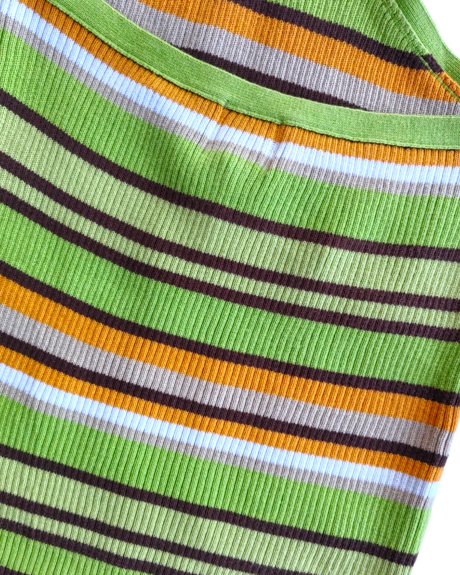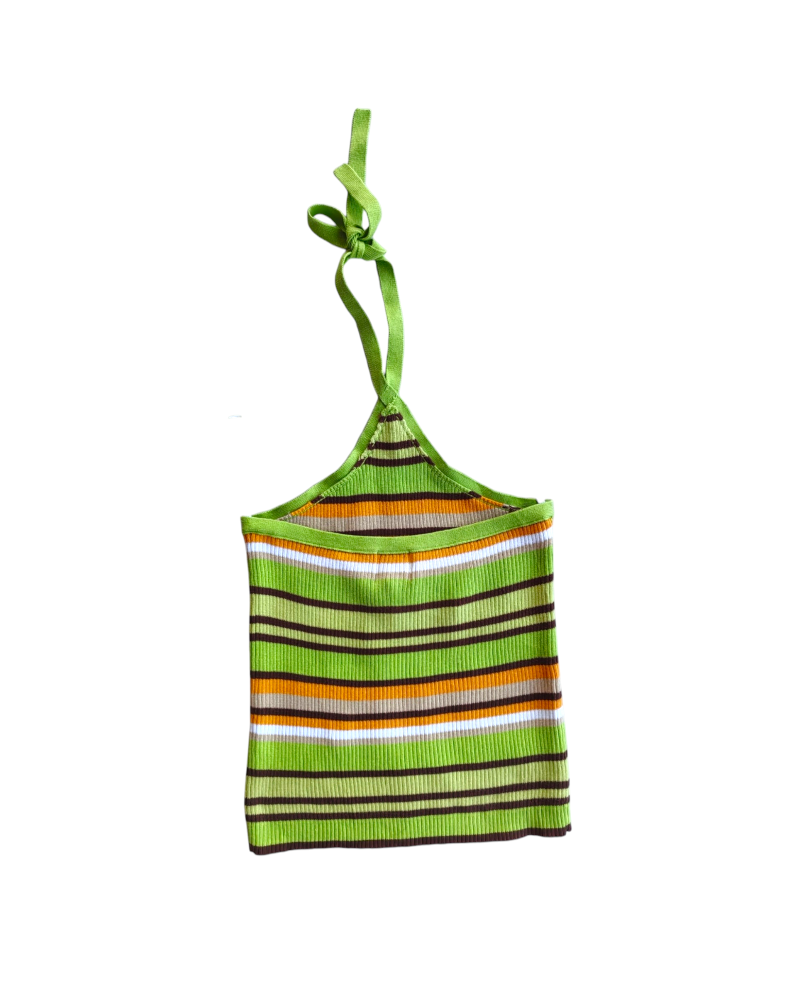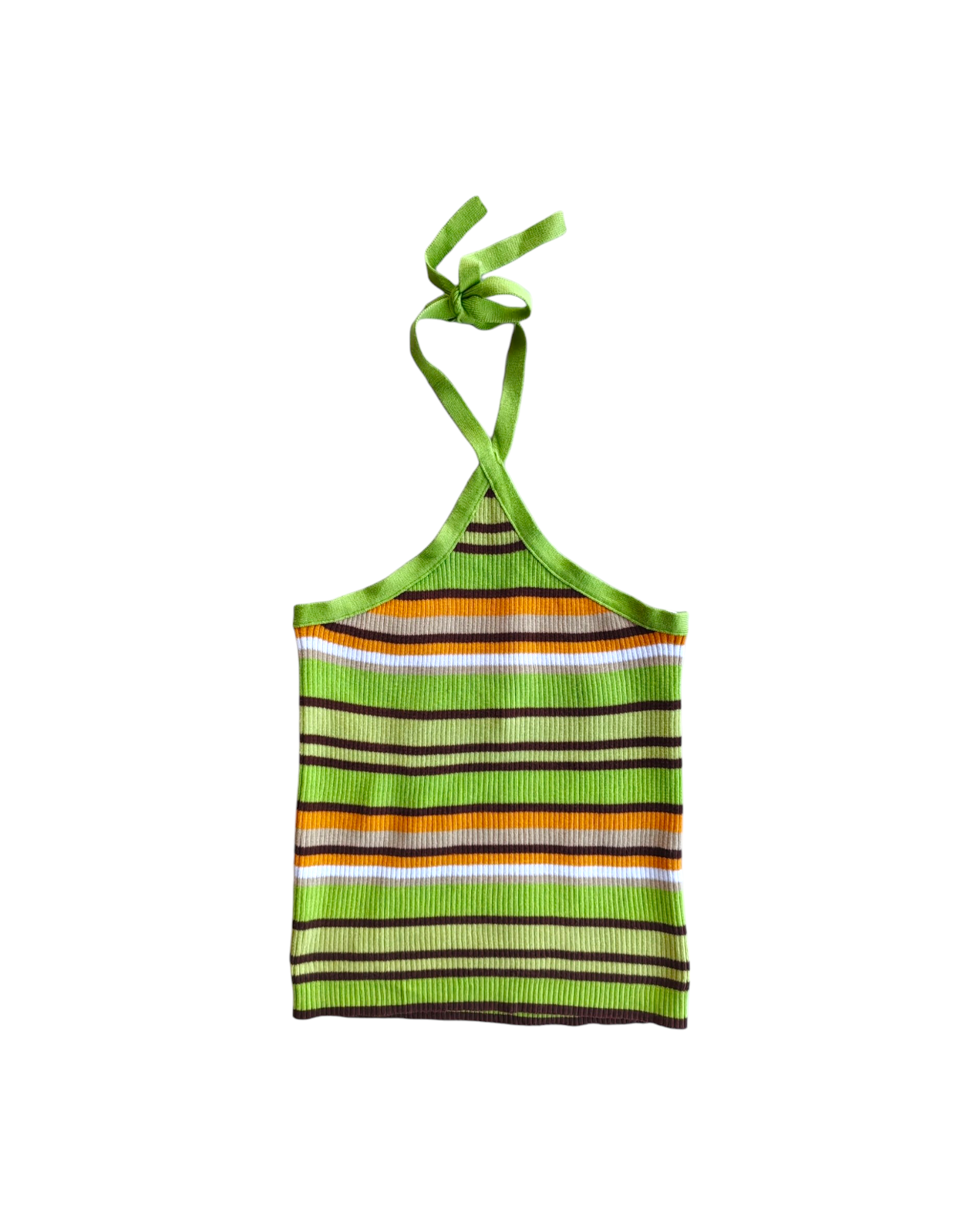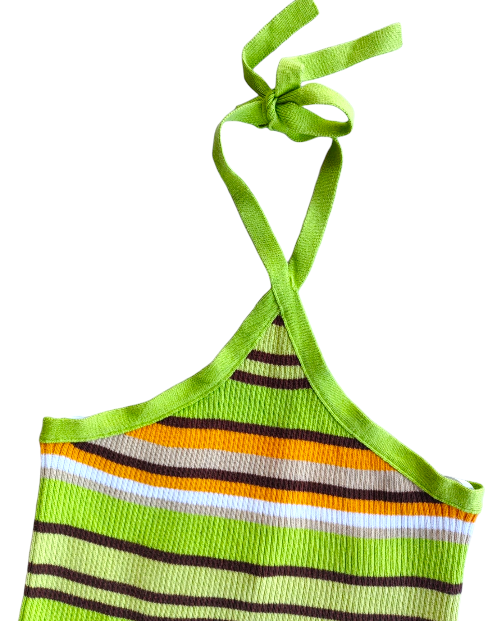 HALTER TOP 100% ALGODÓN COLOR VERDE CON RAYAS VERTICALES EN TONOS DE CAFÉ, NARANJA Y BLANCO. CORDÓN PARA ATAR EN EL CUELLO. SIN DETALLES DE USO.