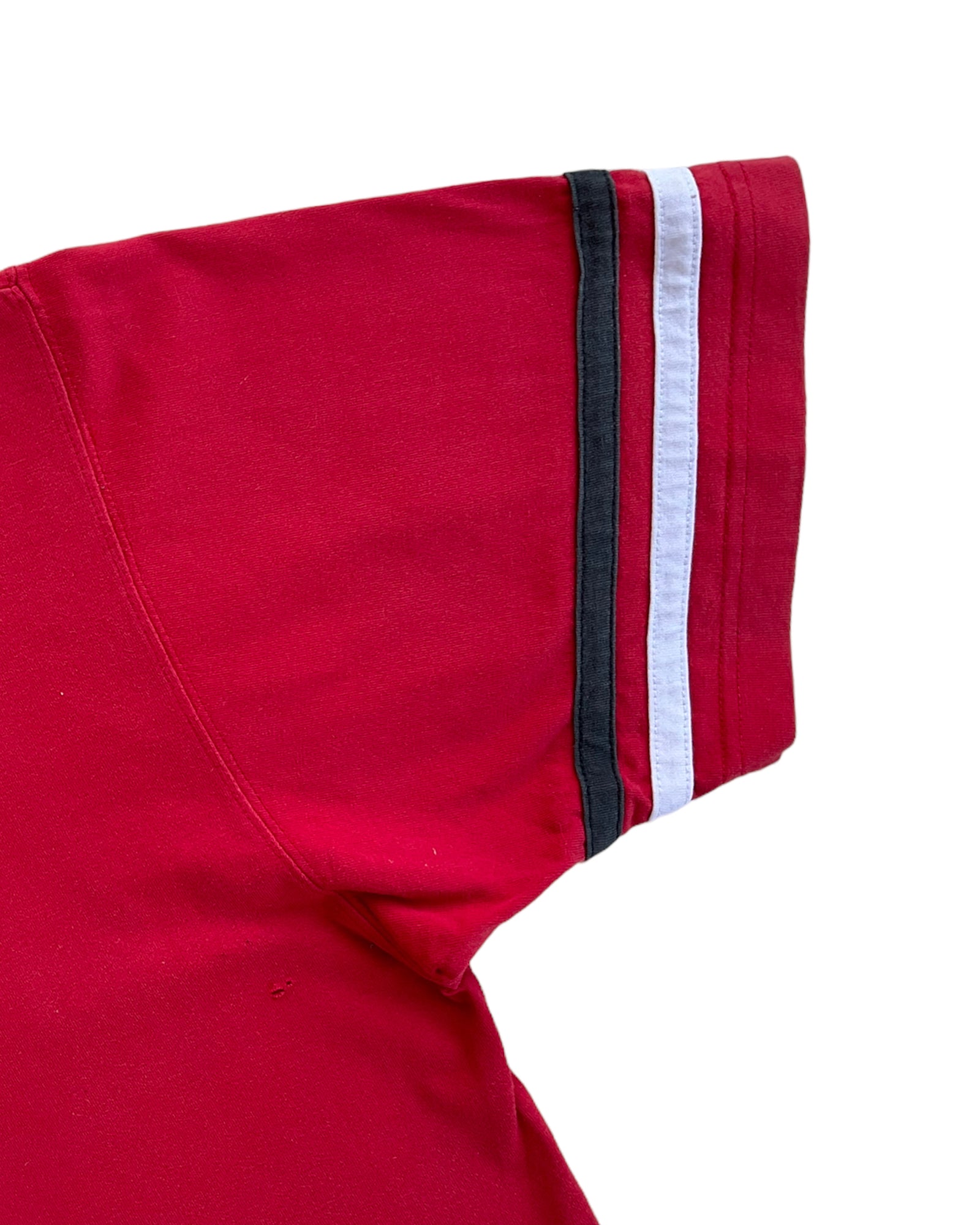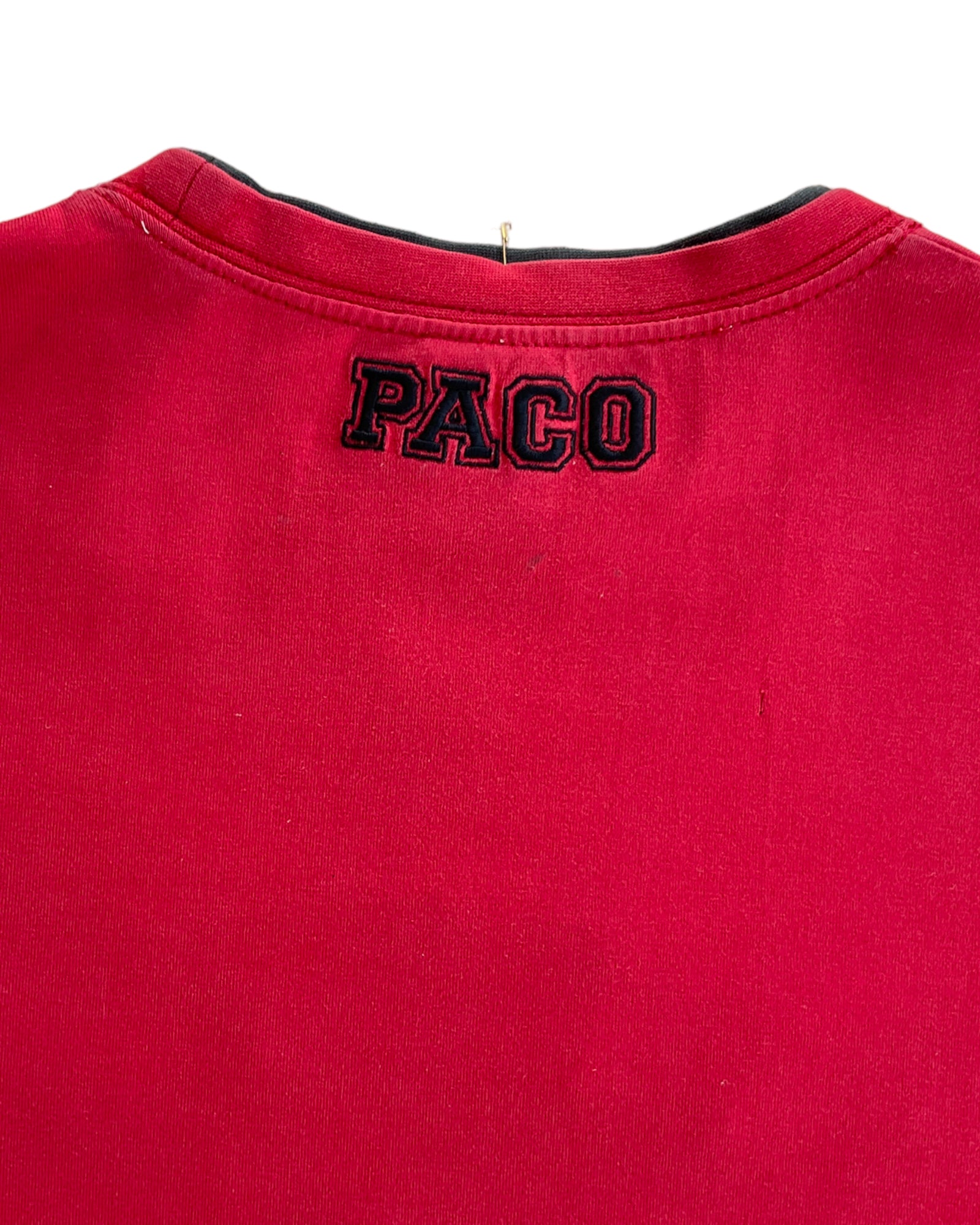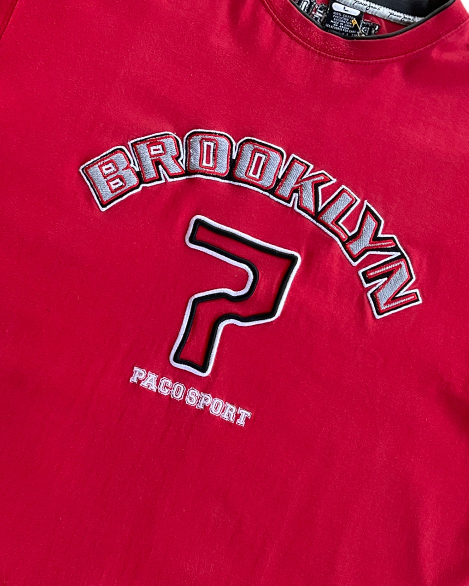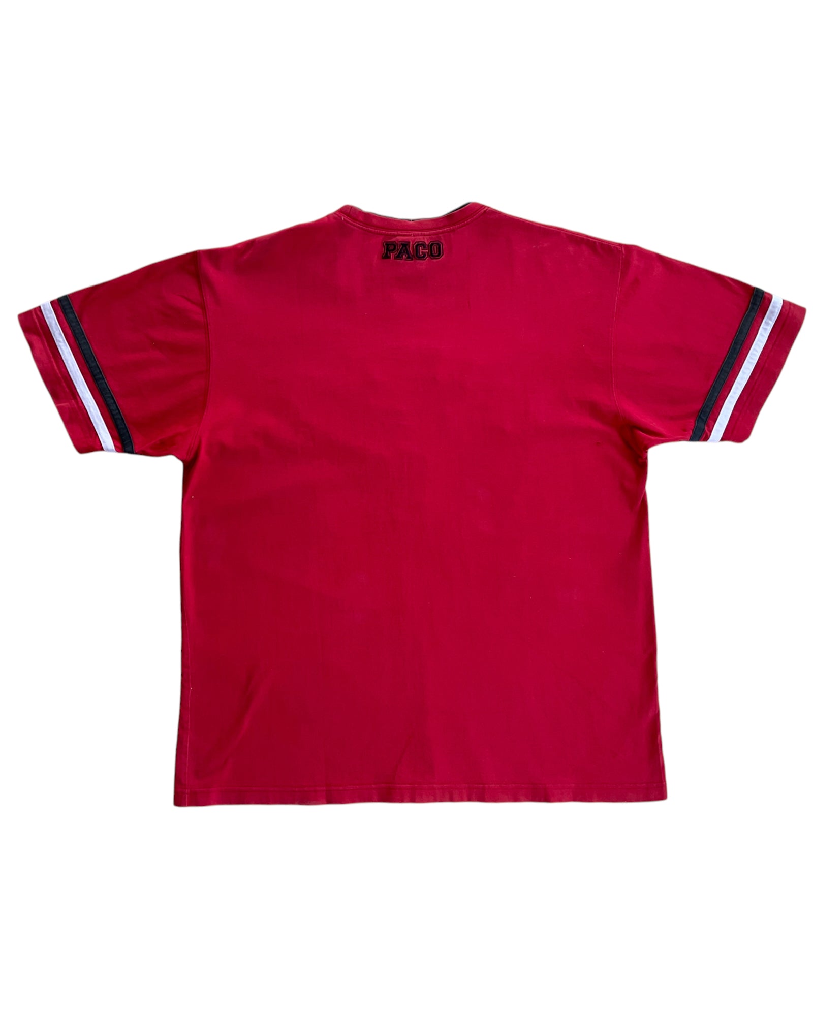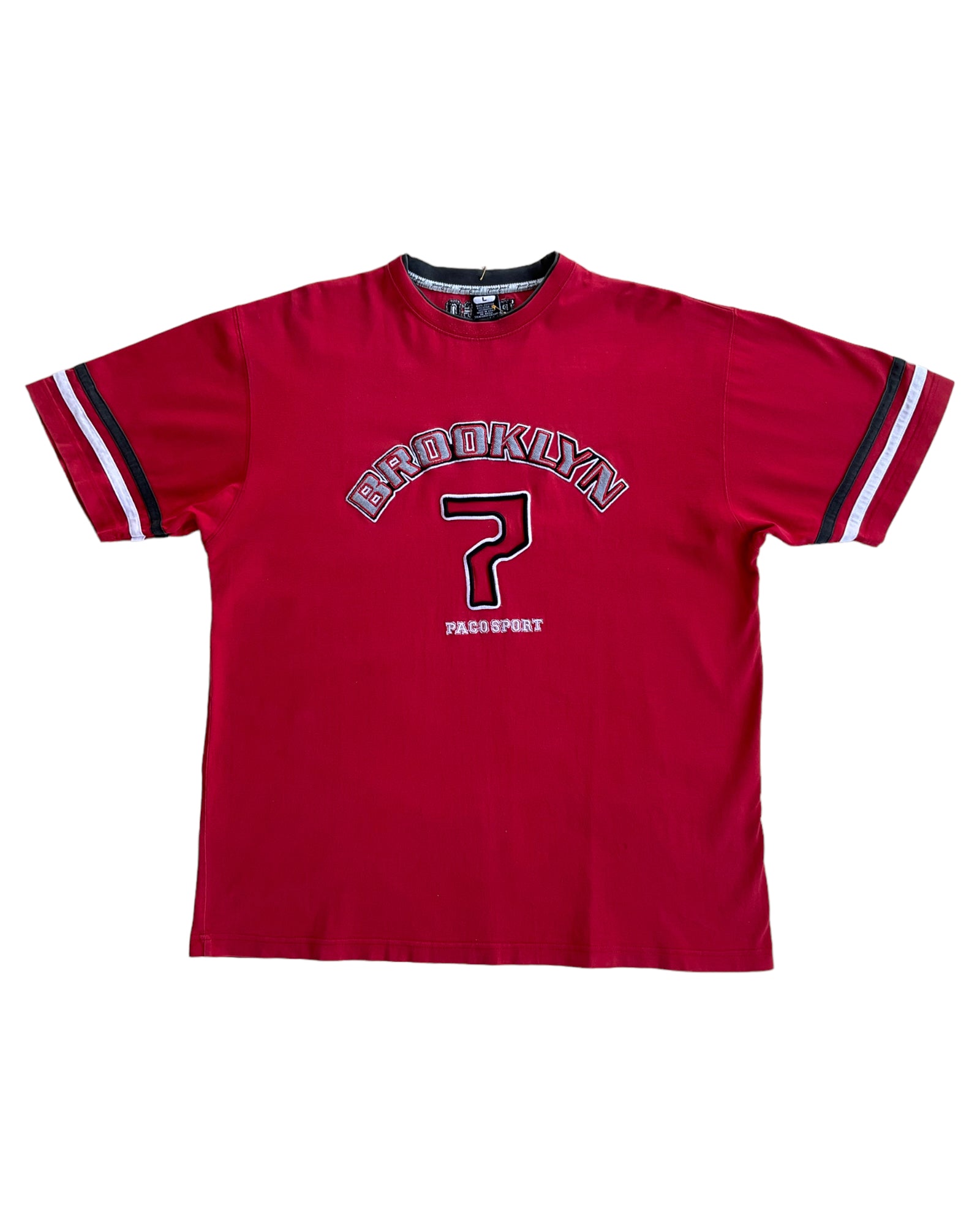 PLAYERA 100% ALGODÓN COLOR ROJO CON FRANJAS BLANCAS Y NEGRAS EN LAS MANGAS, "BROOKLYN 7 PACO SPORT" BORDADO EN EL PECHO EN COLORES GRIS, BLANCO Y NEGRO. "PACO" BORDADO EN LA ESPALDA EN COLOR NEGRO.
