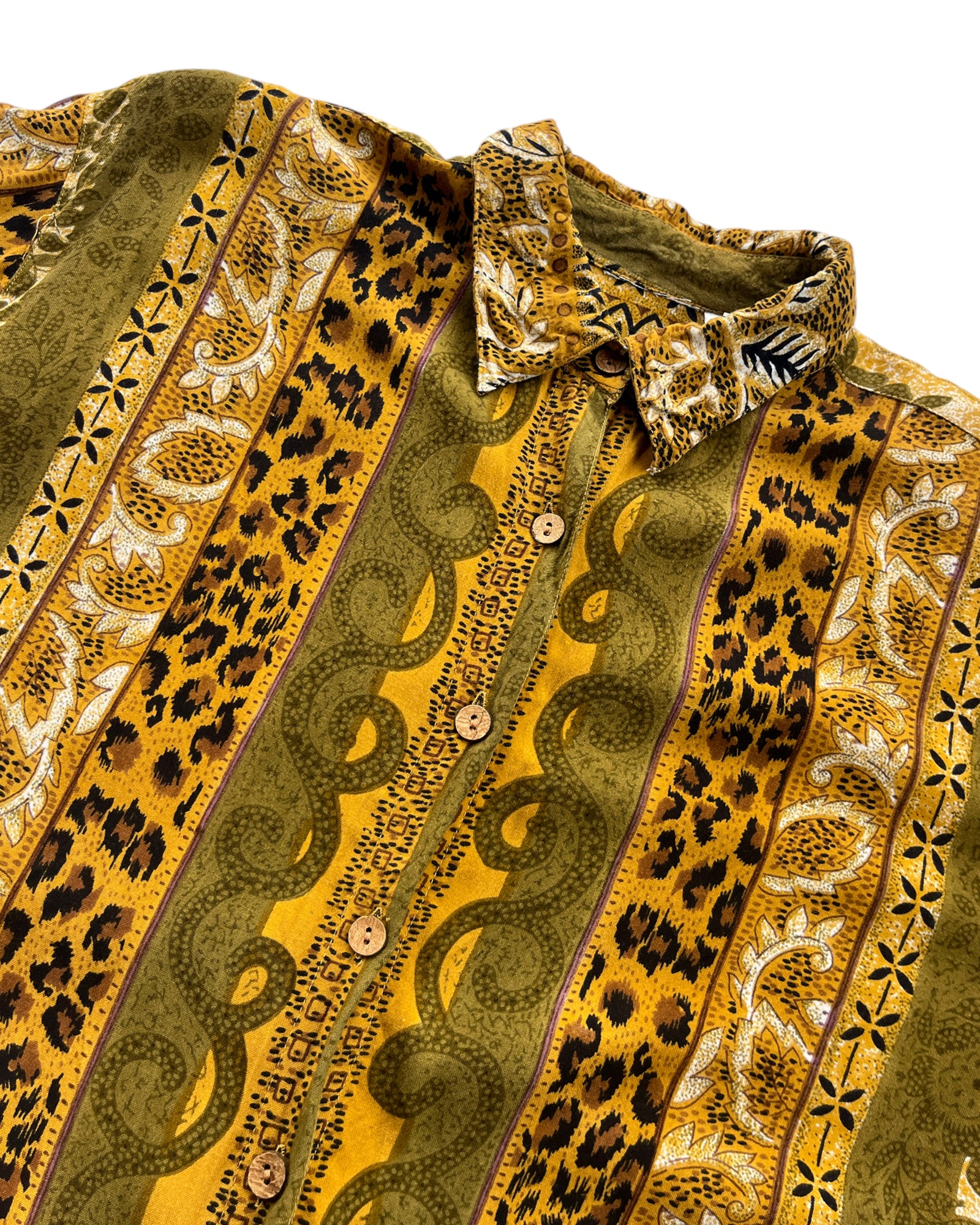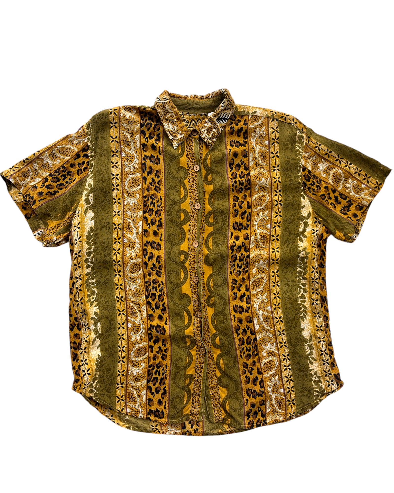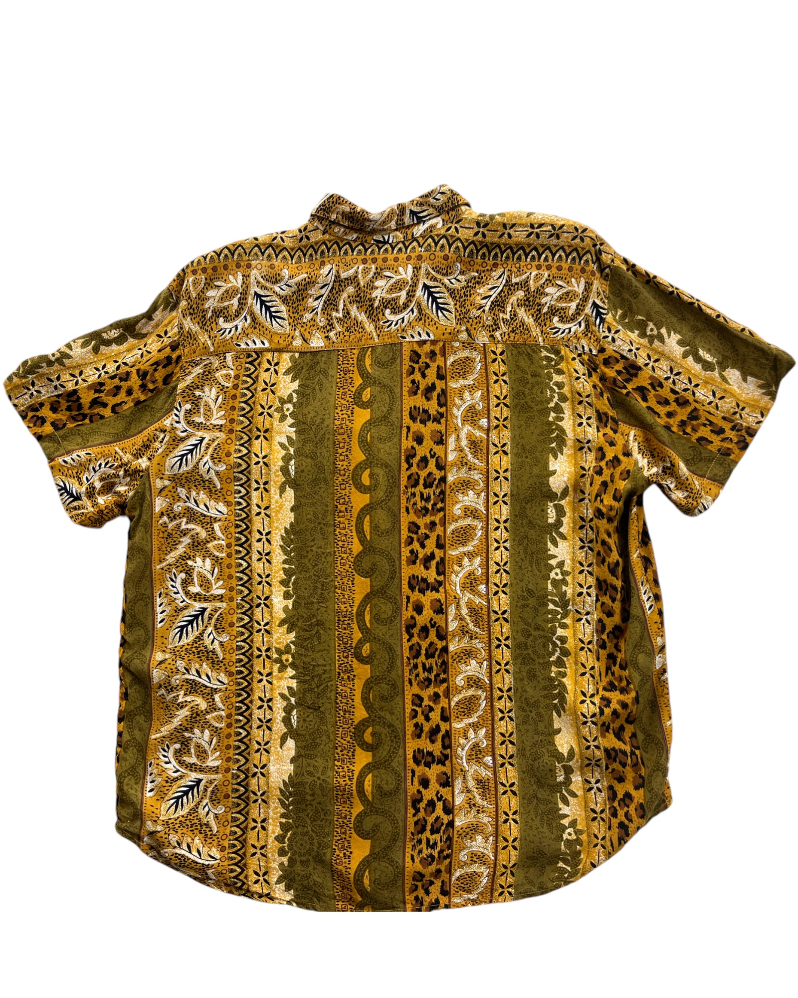 CAMISA COLOR AMARILLO CON FRANJAS DE DIVERSOS ESTAMPADOS, BOTONES AL FRENTE DE MADERA, MANGA CORTA, 100% RAYÓN.