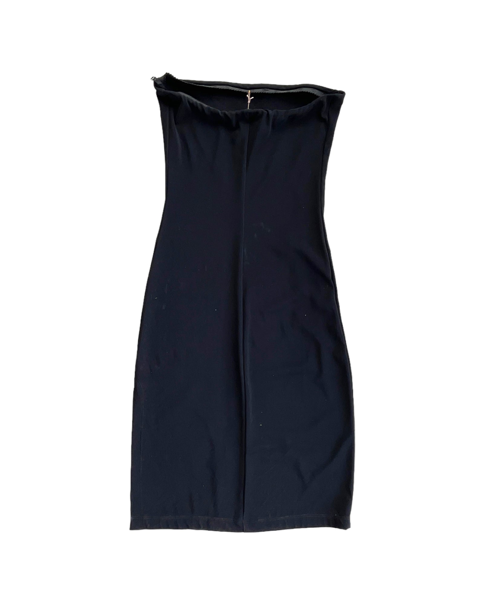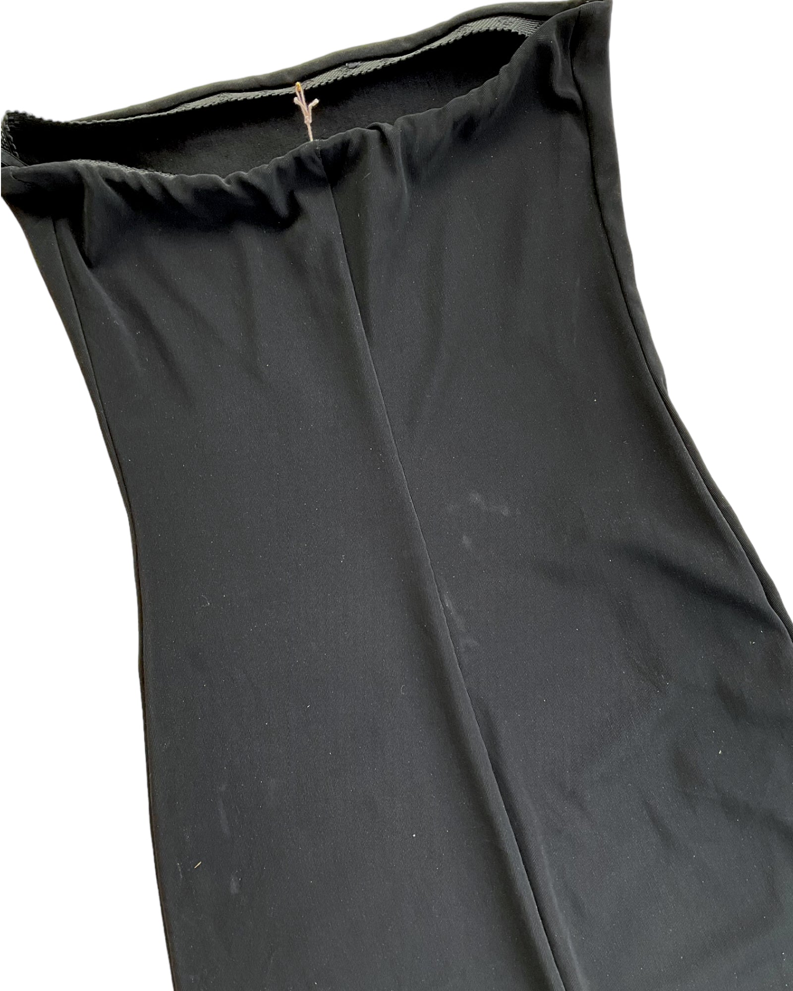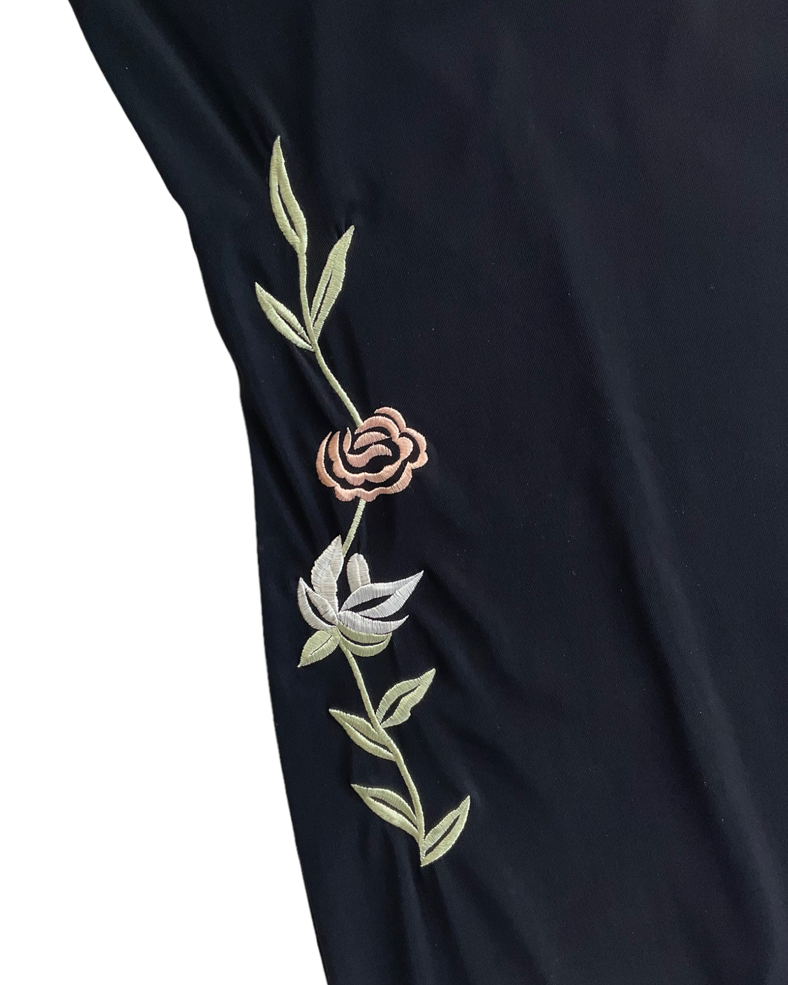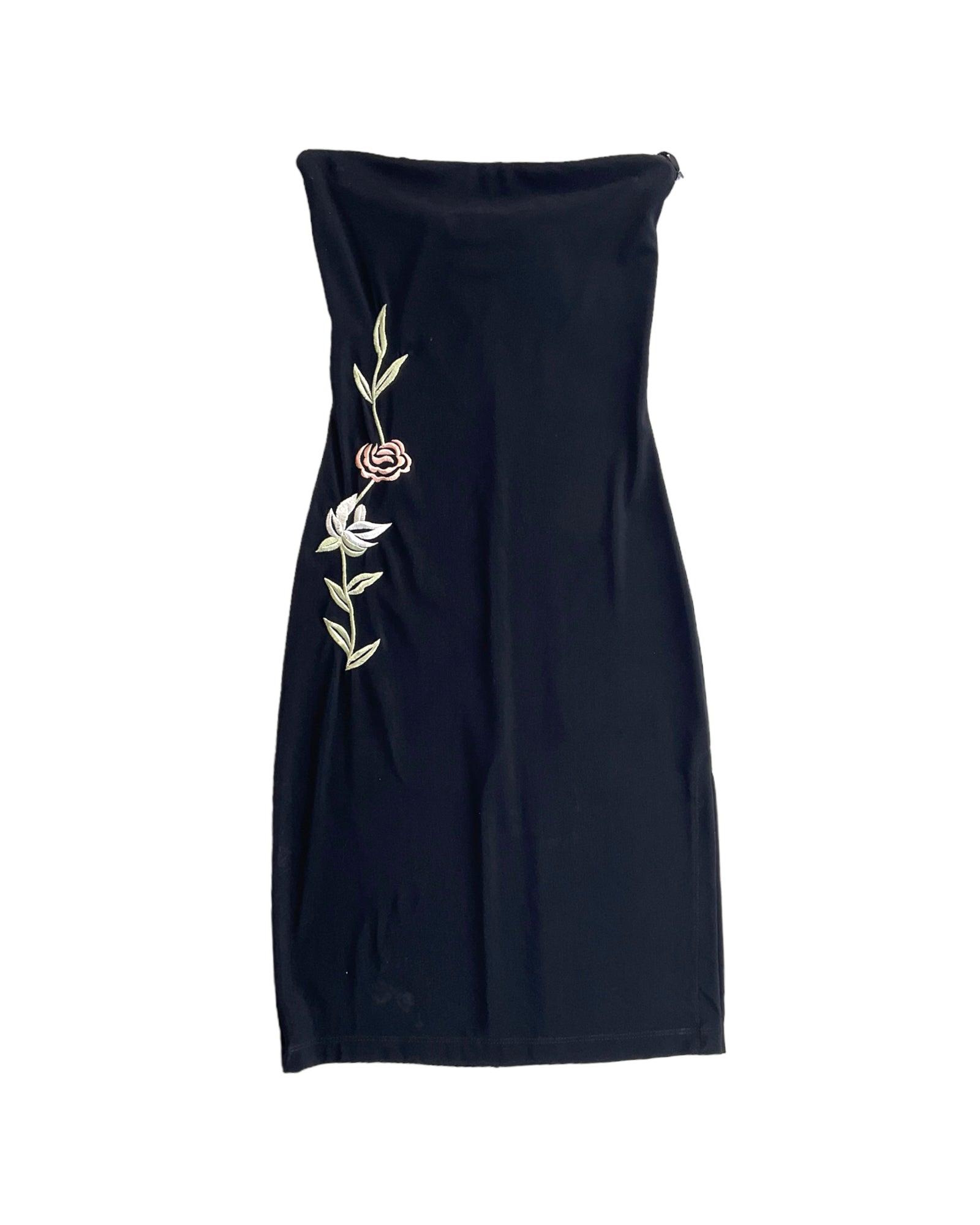 VESTIDO STRAPLESS 90% NAILON 10% ELASTANO, COLOR NEGRO CON UNA ROSA BORDADA EN EL COSTADO EN COLORES ROSA, VERDE Y AZUL PASTEL. ELÁSTICO ANTIRRESBALANTE EN EL PECHO. APERTURA EN LA PIERNA IZQUIERDA. SIN DETALLES DE USO.