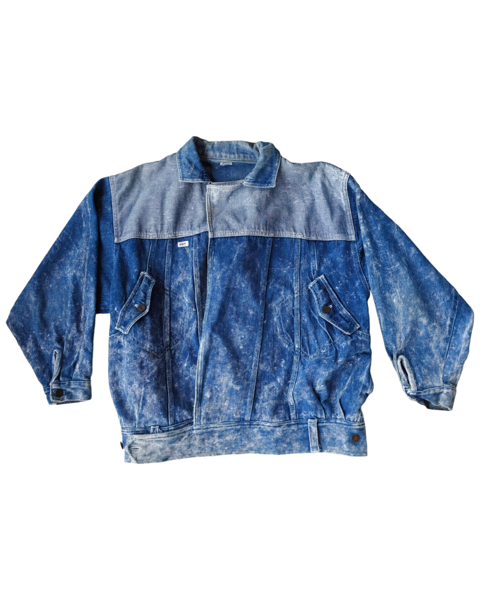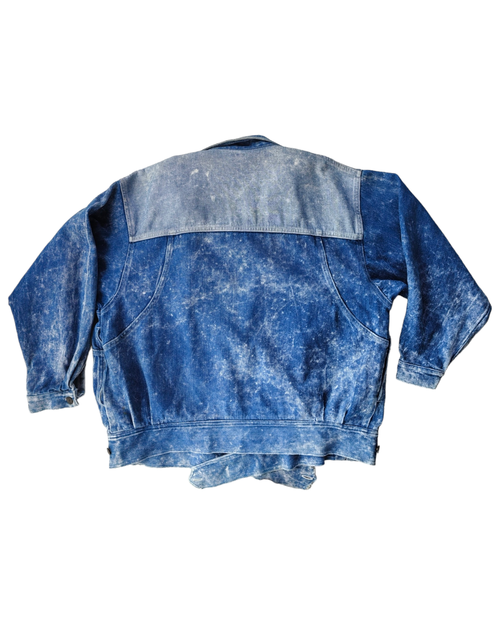 CHAMARRA DE MEZCLILLA DE COLOR AZUL CLARO DESLAVADO CON MANCHAS, 4 BOLSILLOS FRONTALES, 2 ASIMÉTRICOS CON BOTONES Y DOS LATERALES. CINTAS CON BOTONES AJUSTABELS EN LA CADERA. DESGASTE EN LAS CINTAS DE AJUSTE.
