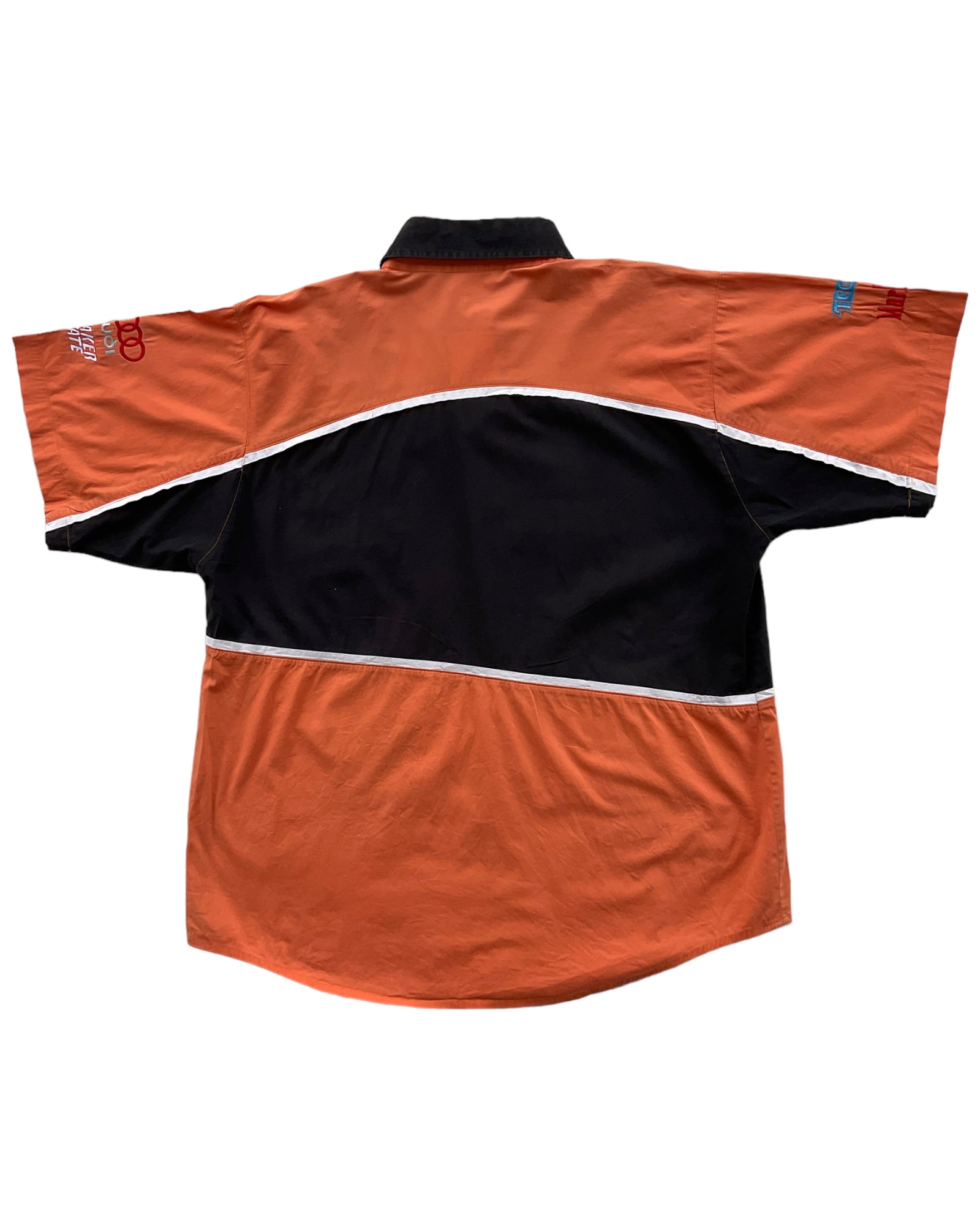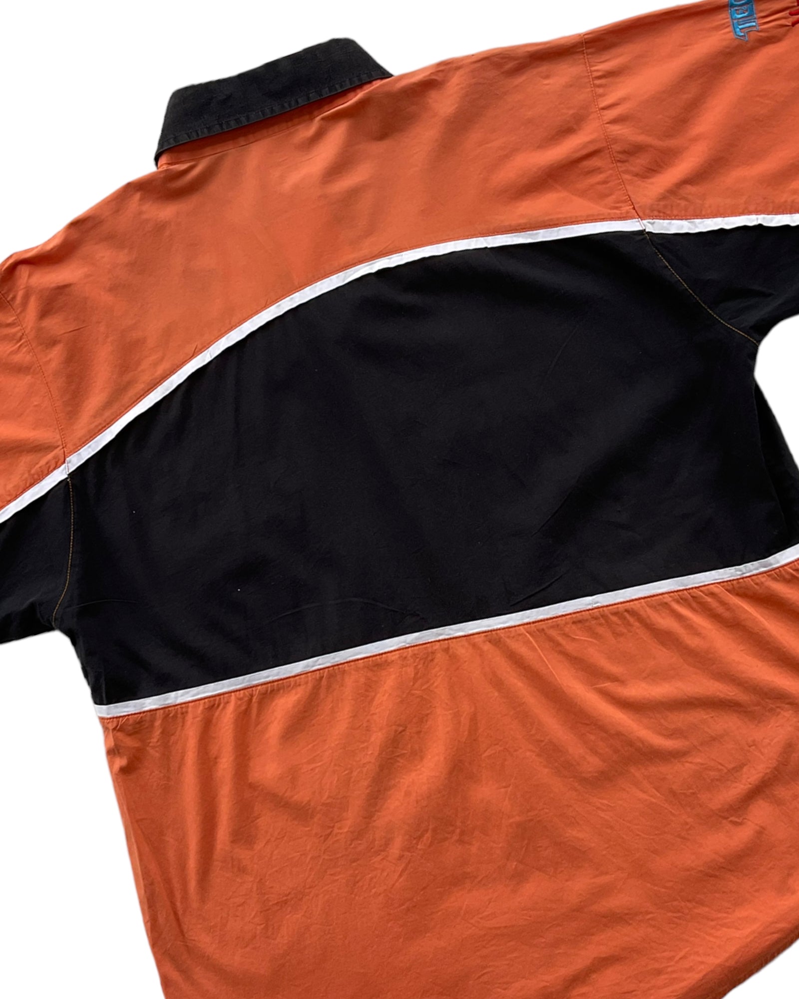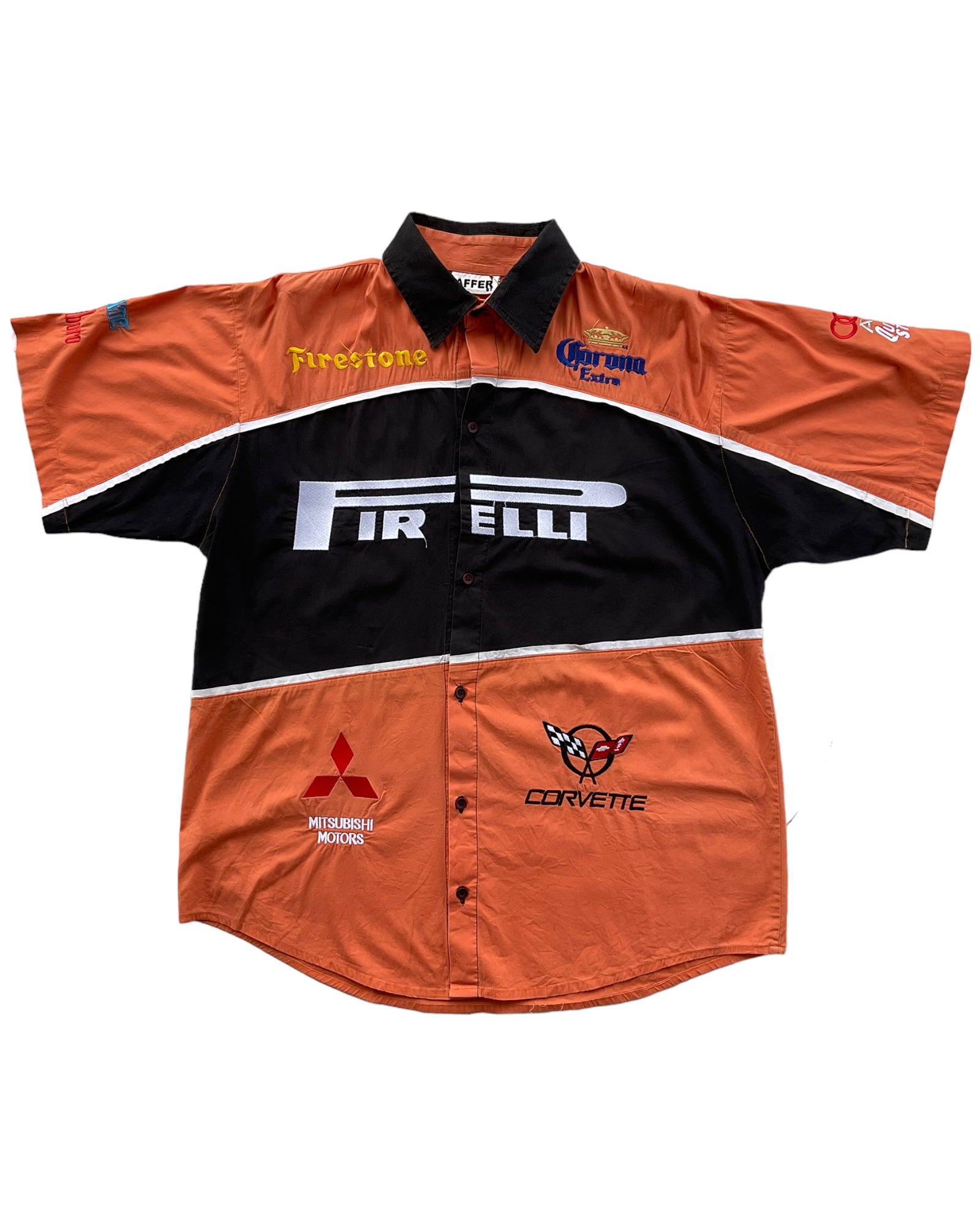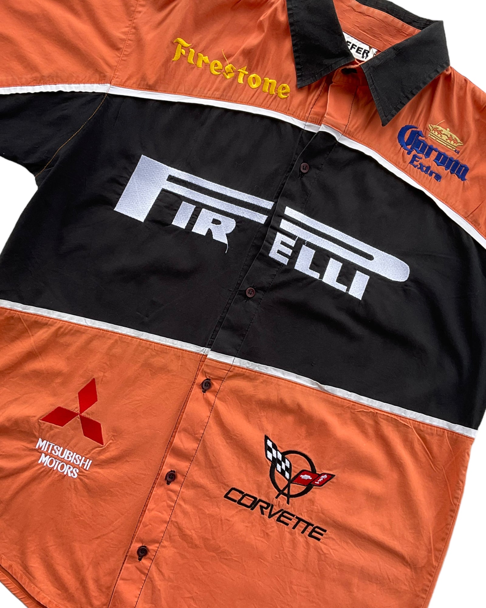 CAMISA DE BOTONES COLOR NARANJA CON UN BLOQUE NEGRO CON LÍNEAS BLANCAS ATRAVESANDO EL PECHO. LOGO DE PIRELLI BORDADO EN GRANDE EN EL PECHO, LOGOS DE FIRESTONE, CORONA, MITSUBISHI, CORVETTE, TECATEY MALBORO BORDADOS Y DISTRIBUIDOS EN LA CAMISA. SINGLE STITCH, SIN DETALLES DE USO.